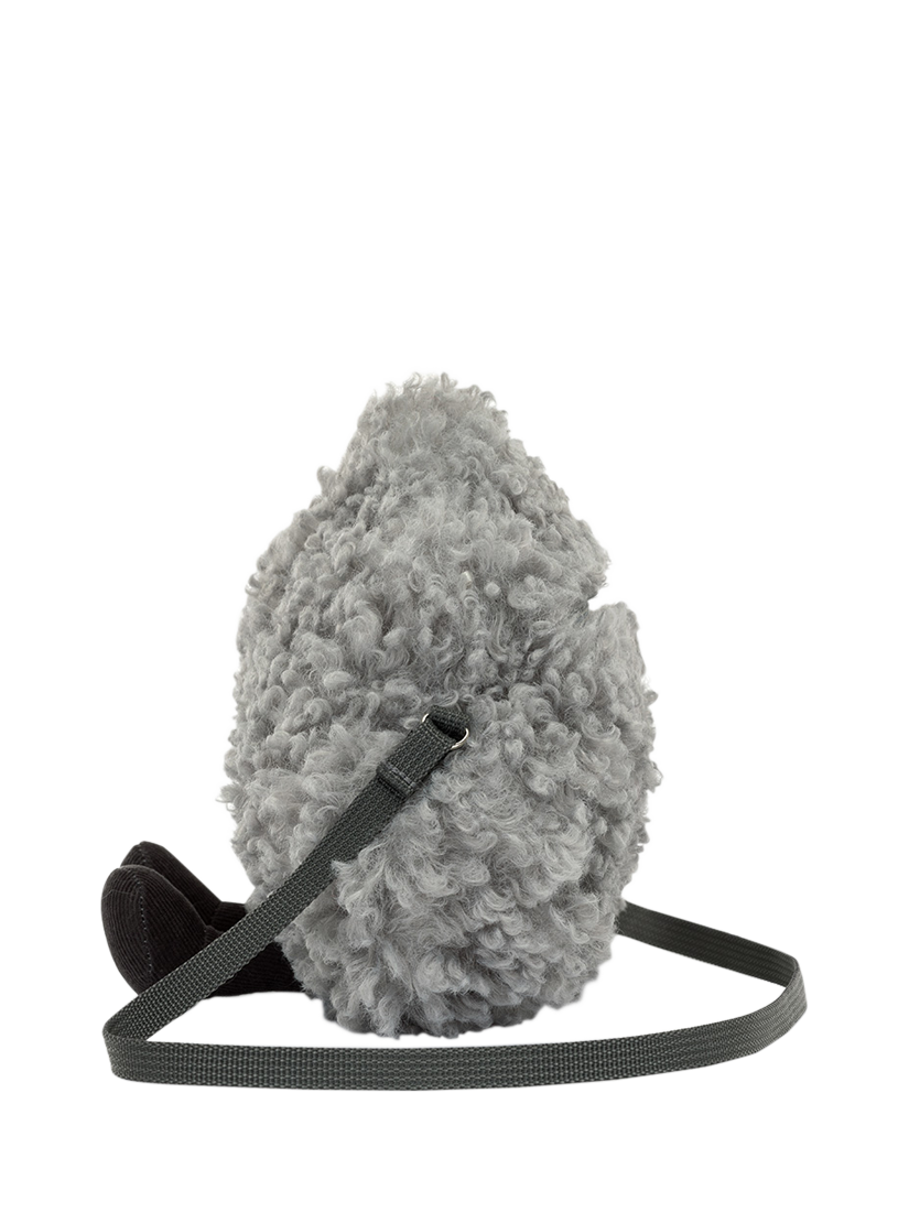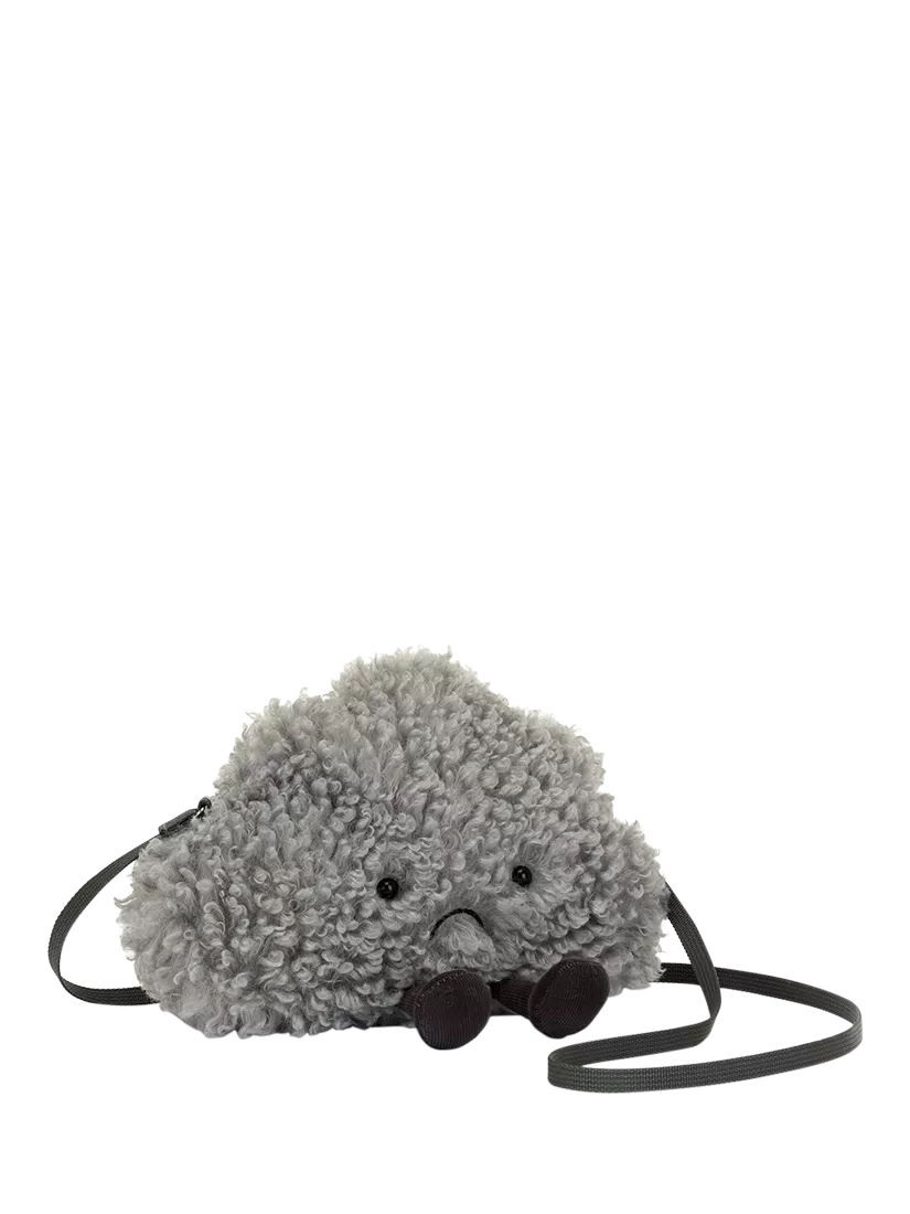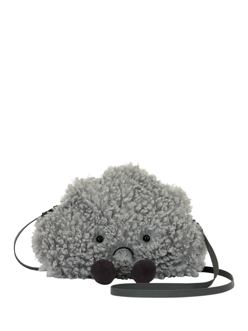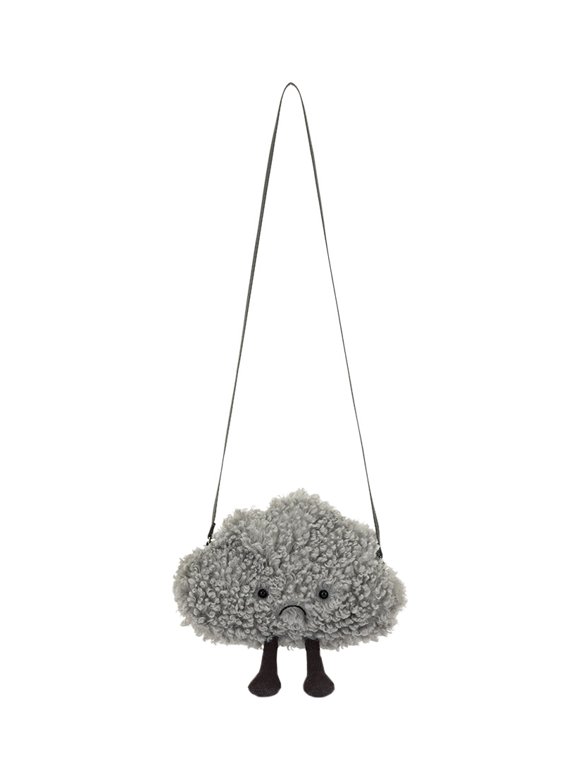 Amuseables Storm Cloud Bag keeps your essentials safe and dry whatever the weather. In textured grey fur with dark cordy boots and a stitched frown, this cloud has a long strap and secure zip closure.