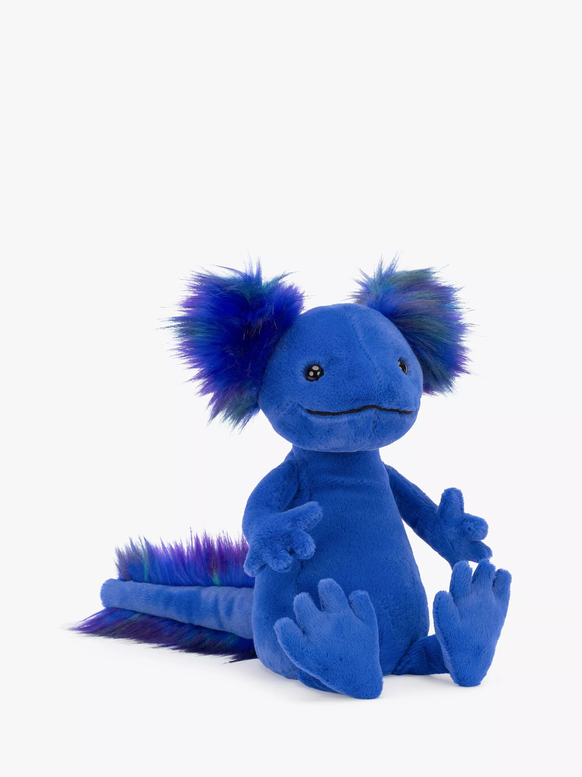 Andie Axolotl is covered in soft deep blue fur, so you'll never miss him! He has great circular blue-black fluff puffs and a long, fluff-lined tail.