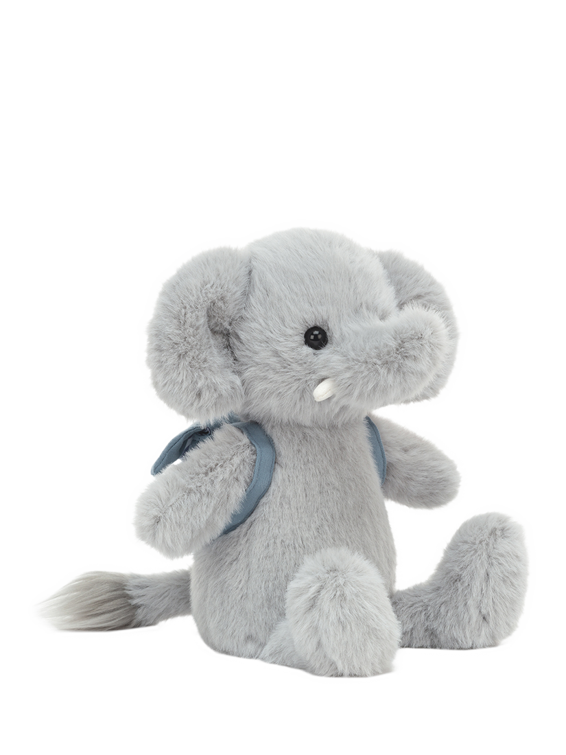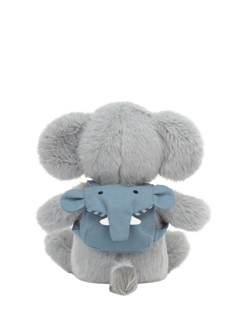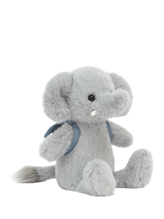 This Backpack Elephant is ready for adventure! This soft squidgy elly is sweet in soft fur, with a fluffy tail tip, two suedey tusks, and a cottony soft backpack sure to not be forgotten!