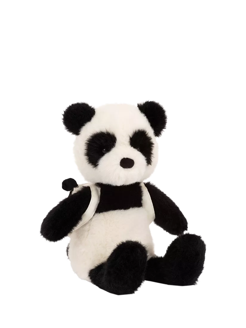 Backpack Panda is ready for an adventure. Silky soft in black and cream fur, this panda has its own cotton panda face backpack that can be removed and opened to be filled with treats!
