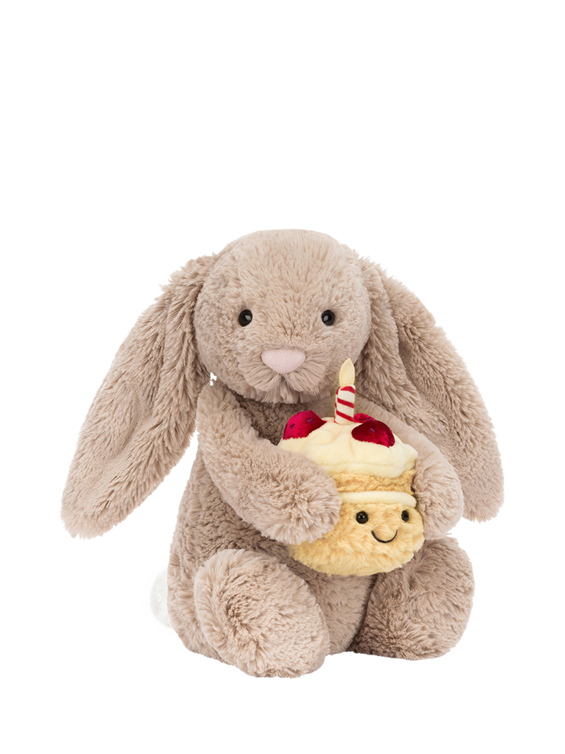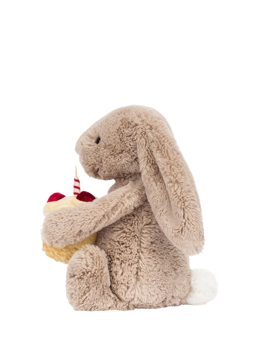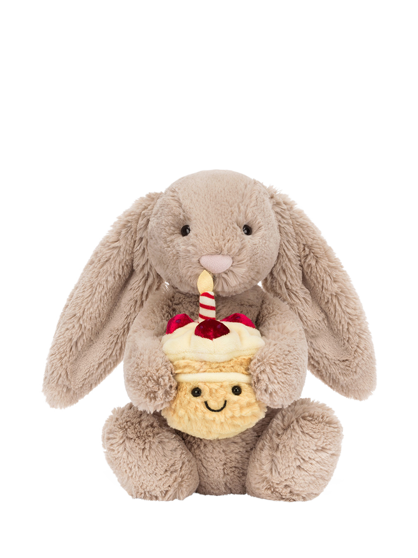 Bashful Bunny is here to help celebrate! Jellycat's iconic beige bunny is holding tight to a tiny Amuseables Birthday Cake, complete with a stitched smile and a lit candle!