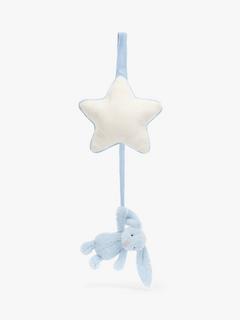 Bashful Bunny Musical Pull from Jellycat is sure to send little ones to a joyful dreamland. This tiny Bashful Bunny suspends from a soft cream star with contrast piping, all created from recycled fibres. Pull down to play the sweet original Jellycat Lullaby.