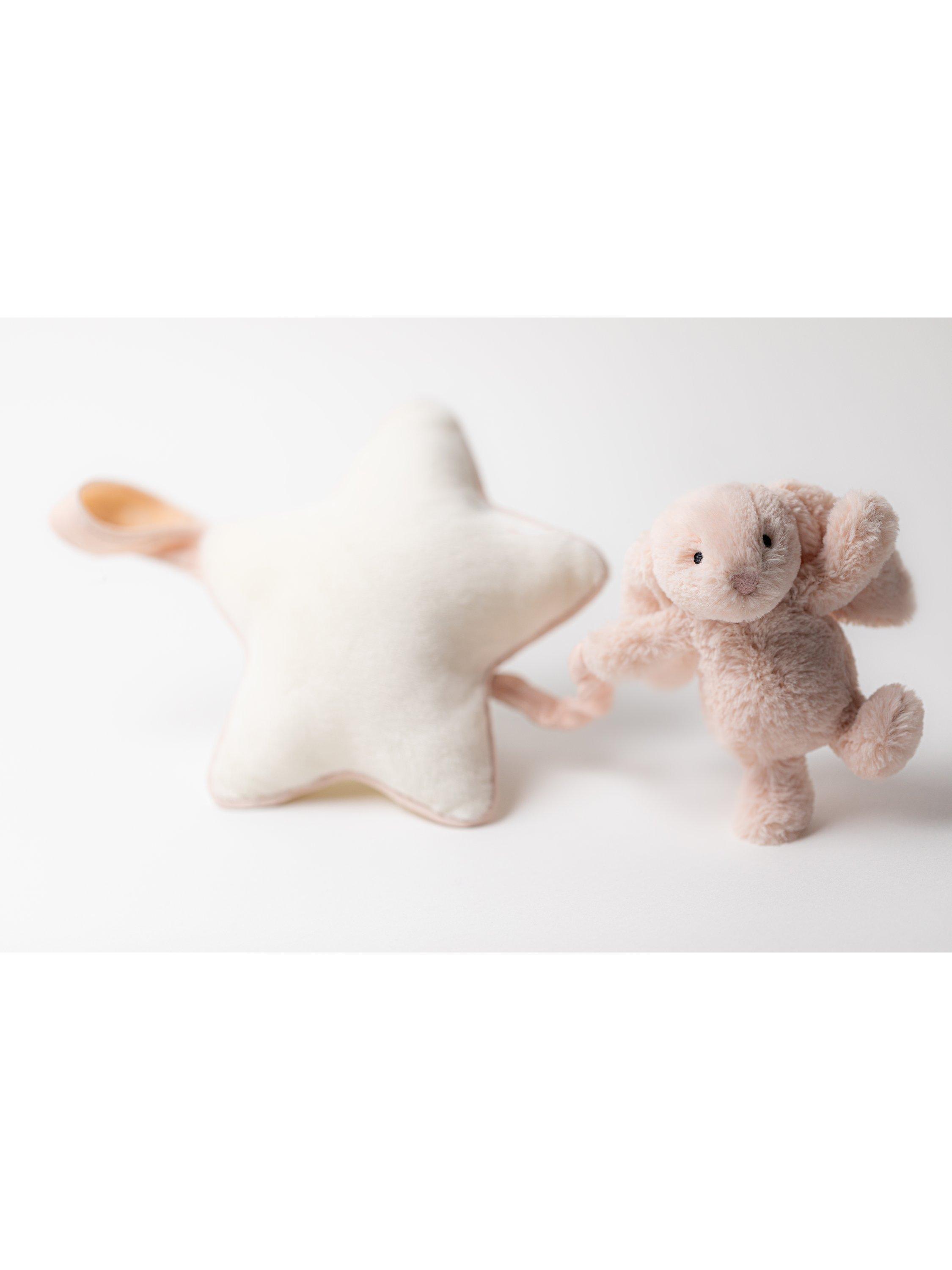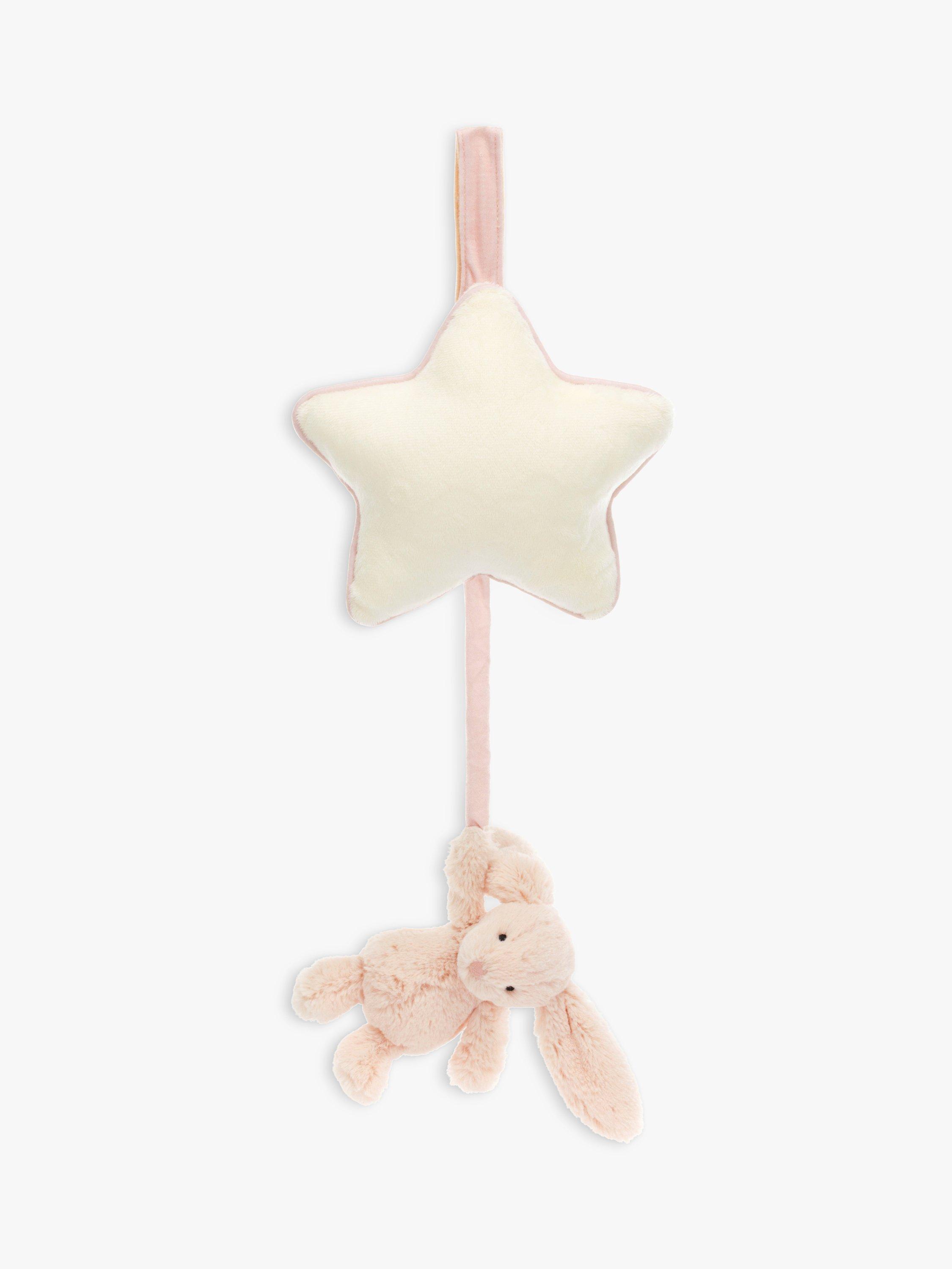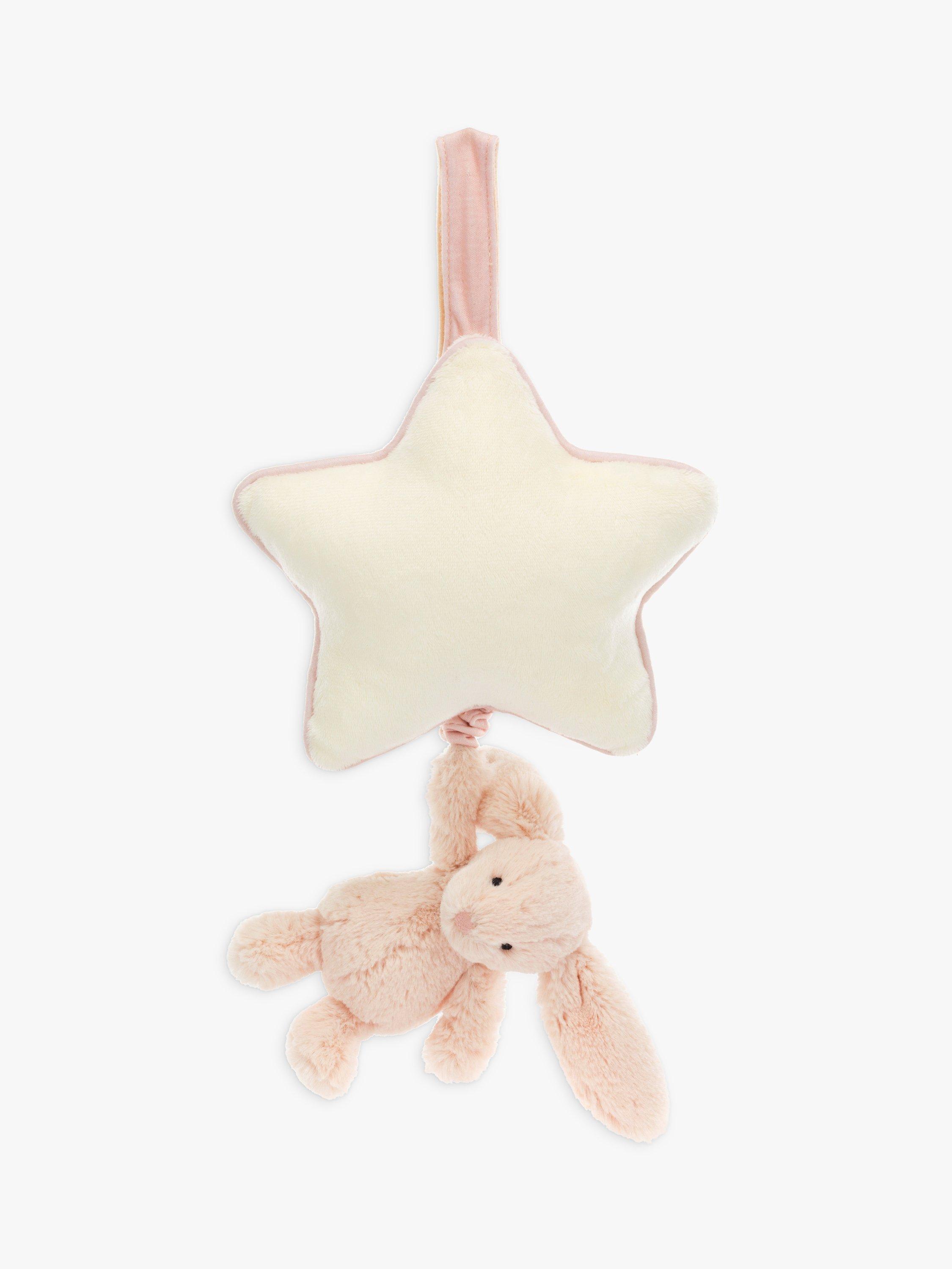 Bashful Bunny Musical Pull from Jellycat is sure to send little ones to a joyful dreamland. This tiny Bashful Bunny suspends from a soft cream star with contrast piping, all created from recycled fibres. Pull down to play the sweet original Jellycat Lullaby.