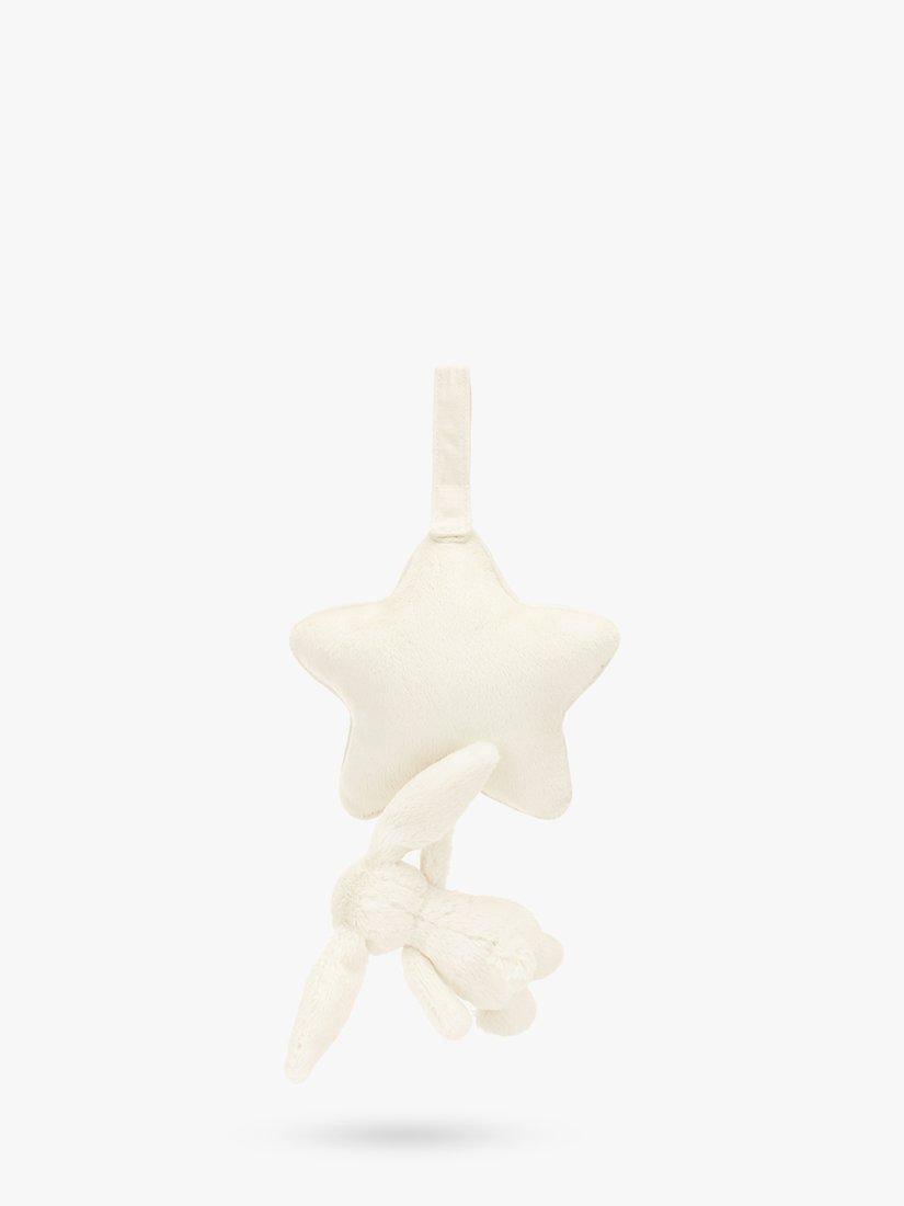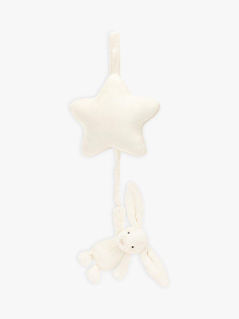 Bashful Bunny Musical Pull from Jellycat is sure to send little ones to a joyful dreamland. This tiny Bashful Bunny suspends from a soft cream star with contrast piping, all created from recycled fibres. Pull down to play the sweet original Jellycat Lullaby.