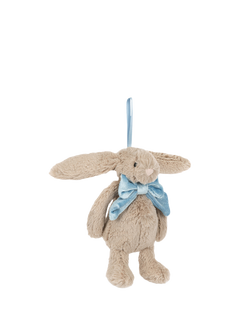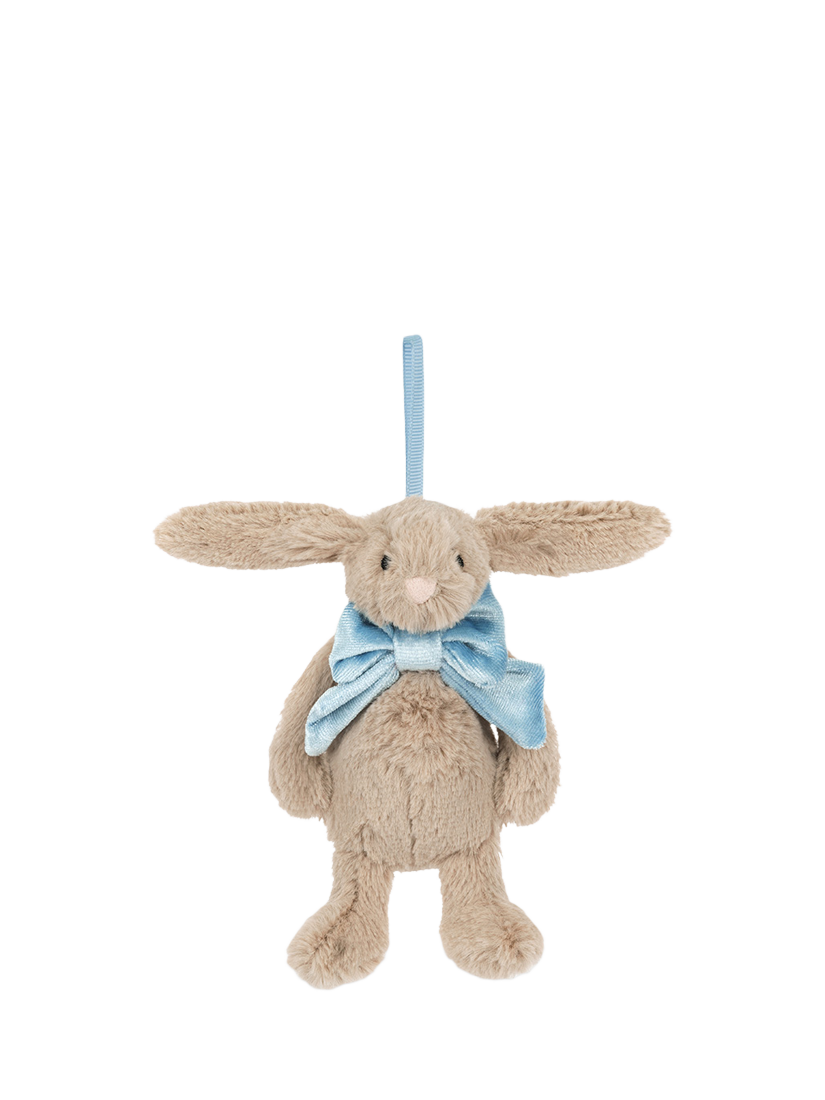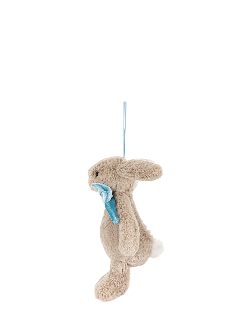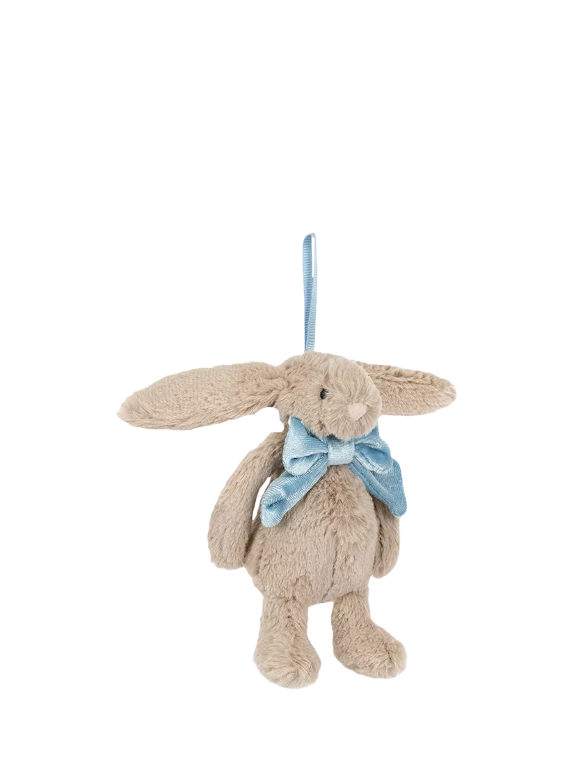 Bashful Bunny is a fabulously festive addition to any tree. Jellycat's iconic Bashful Bunny wears a winter blue bow tie and has a matching ribbon loop to hang perfectly from branch or hook.