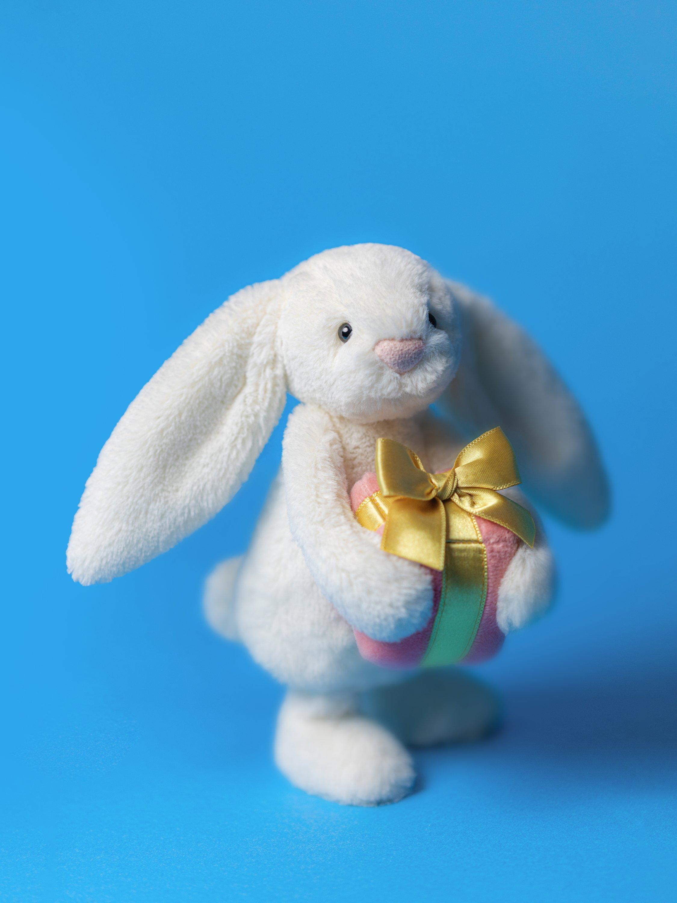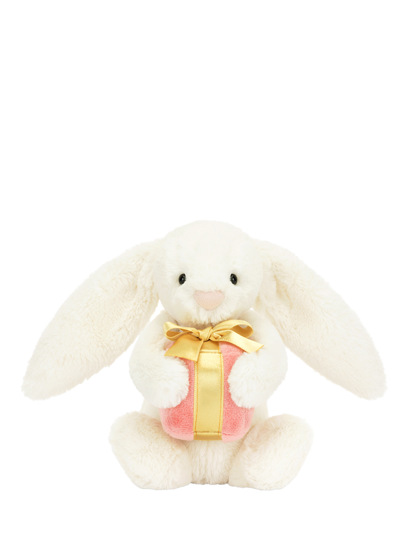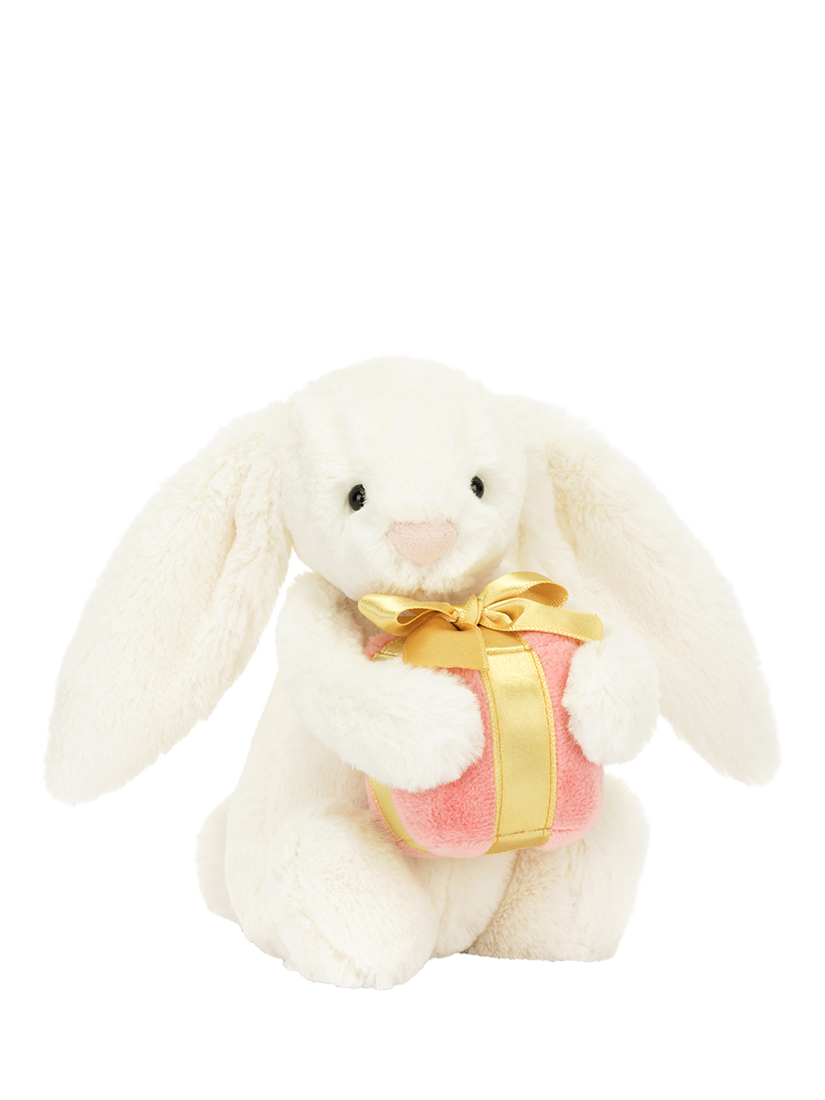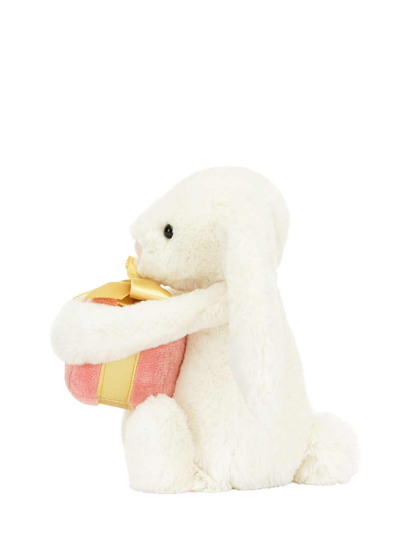 Bashful Bunny with Present is the gift that keeps on giving! Bashful Bunny is soft and sweet in cream fur and is holding a pretty pink present tied with a gold satin bow.