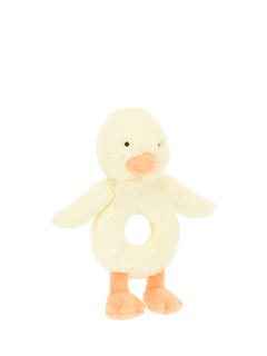 Bashful Duckling Ring Rattle is perfect for jingling playtime. In iconic pale yellow Bashful fur with a light orange beak and feet created from recycled fibres, this duckling has a doughnut-shaped tummy perfect for little hands to hold and shake for instant joy.