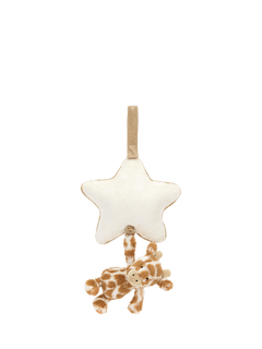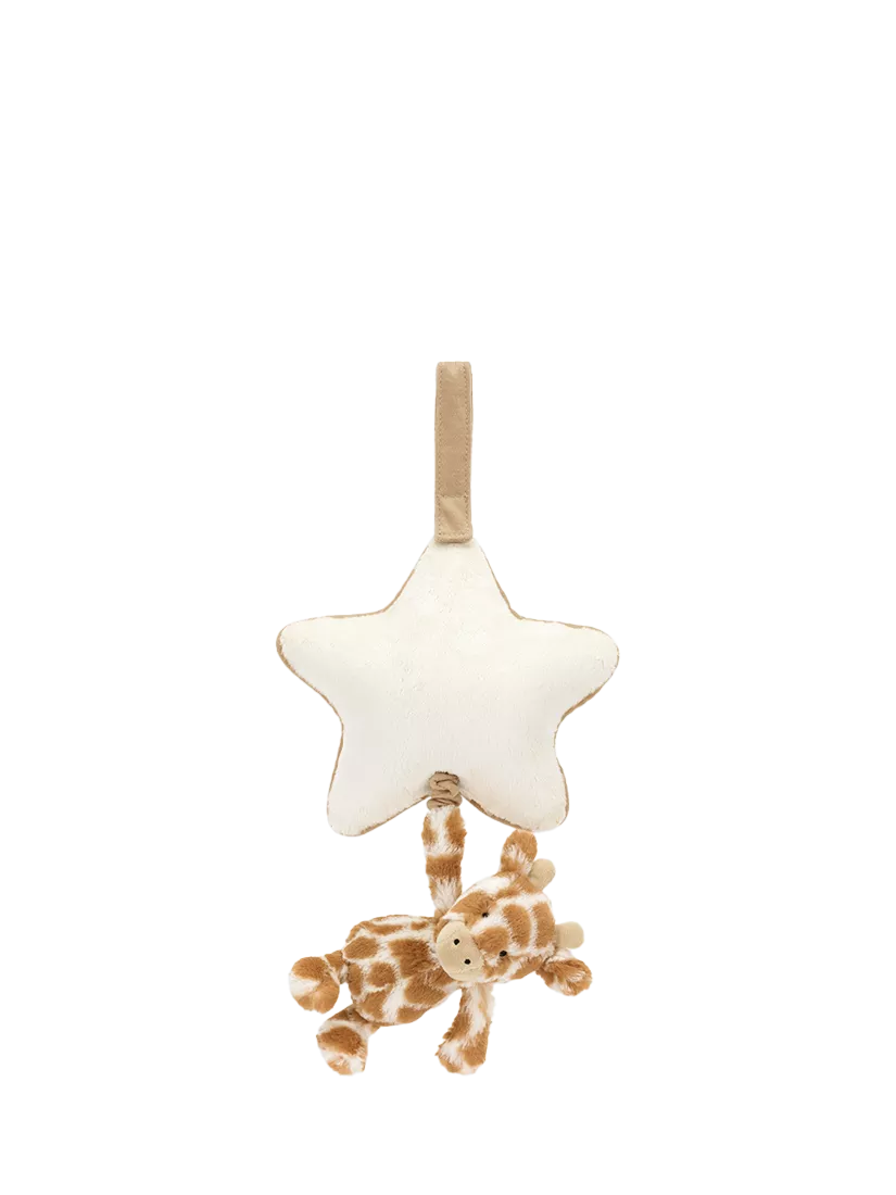 Bashful Giraffe Musical Pull is sure to send little ones to a joyful dreamland. Tiny Bashful Giraffe hangs from a soft cream star with contrast piping, all created from recycled fibres, and can be pulled down to play the sweet original Jellycat Lullaby.