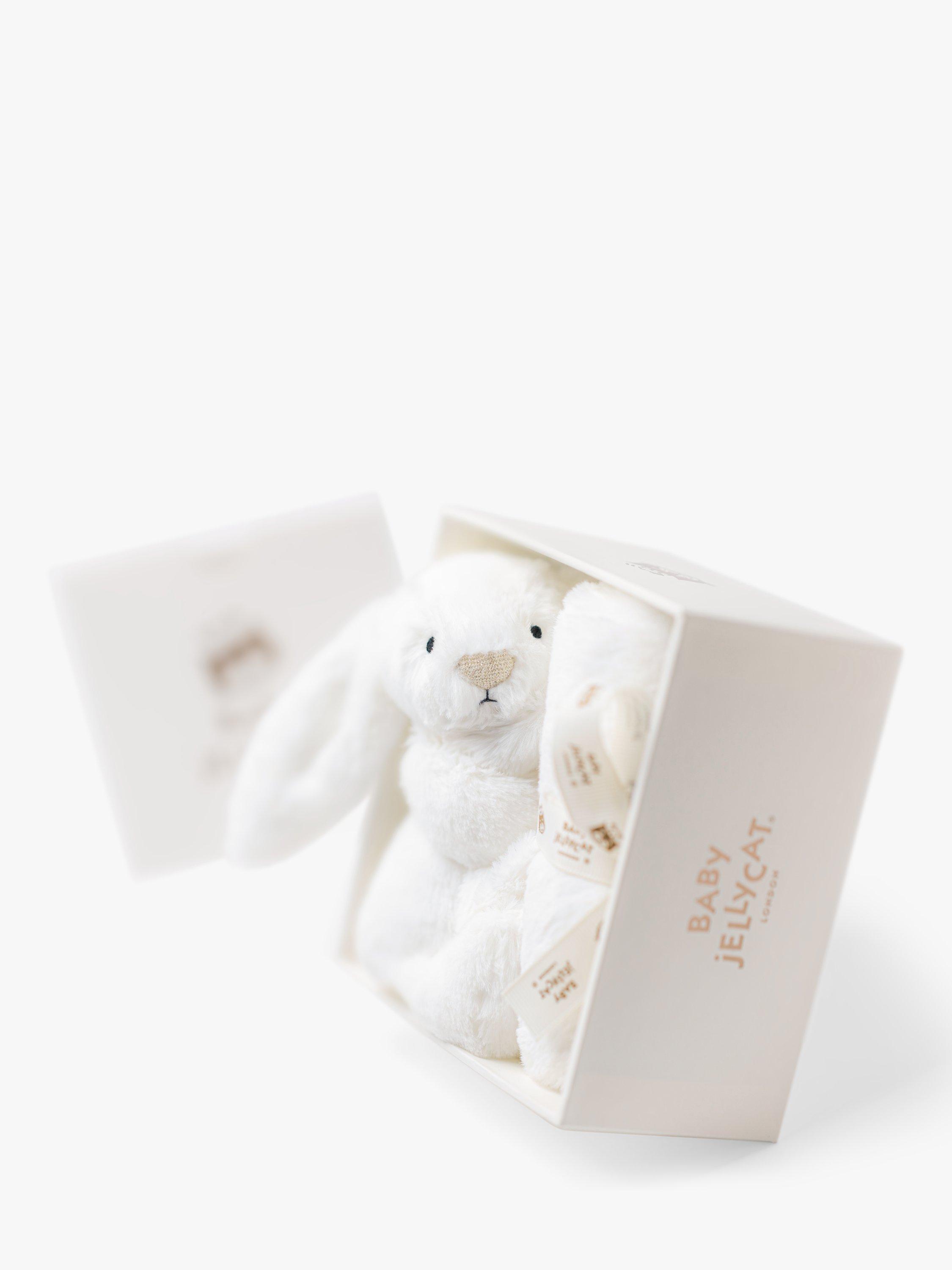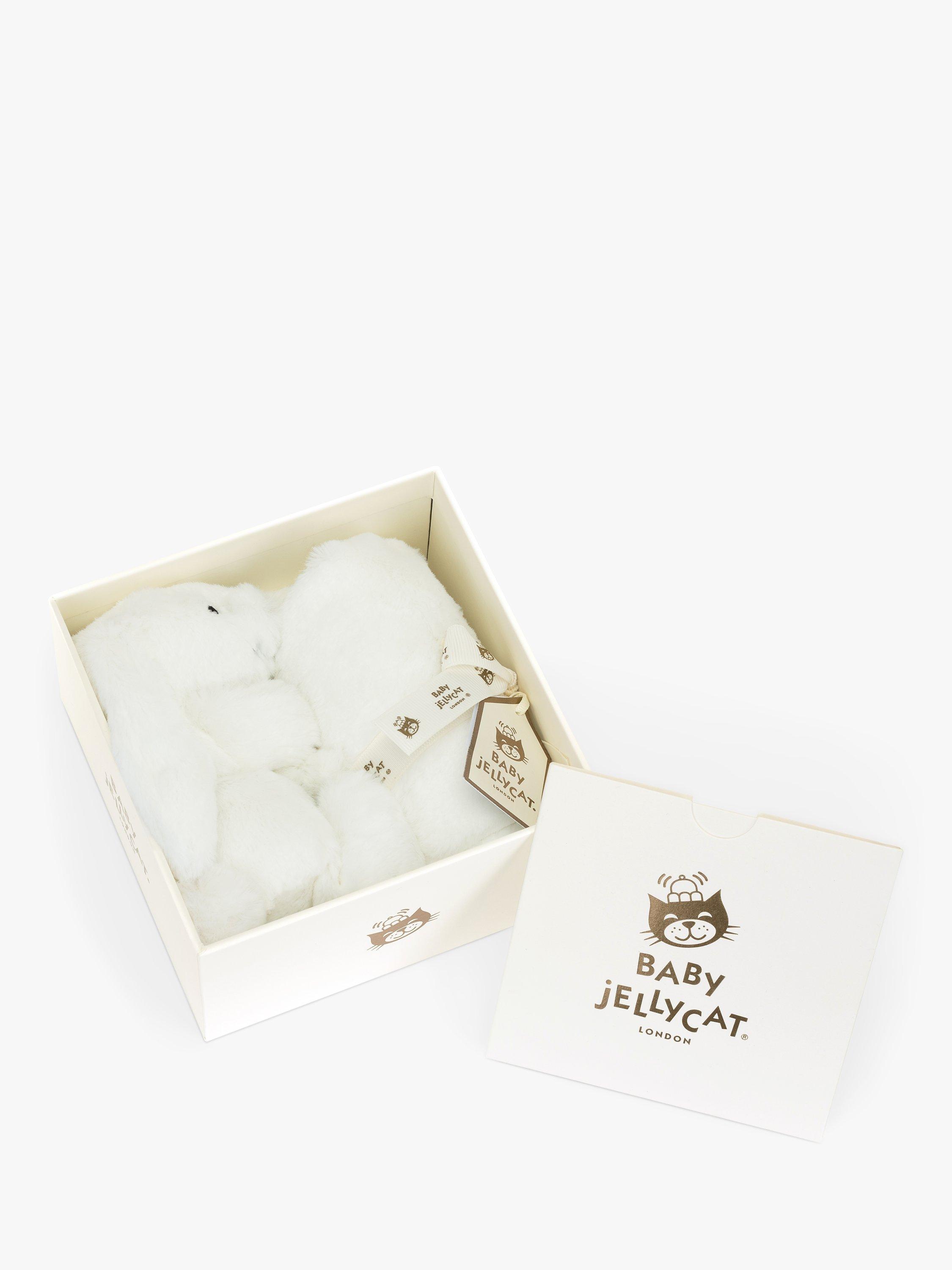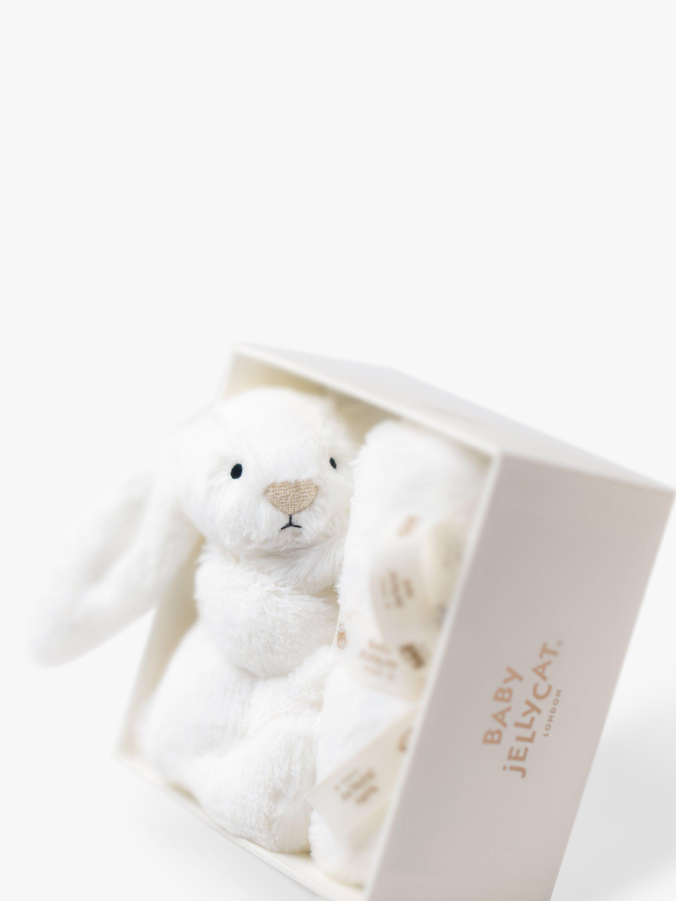 Bashful Luxe Bunny Luna Soother brings comfort at sleep times. Little ones can cuddle up with the luxuriously soft white fur blanket or the tiny Bashful Luxe Bunny Luna holding on to the corner, for the most joyful of dreams. This soother is tied with a grosgrain printed ribbon and presented in an elegant Jellycat gift box with a gift card and envelope. A gorgeous gift for a new arrival.