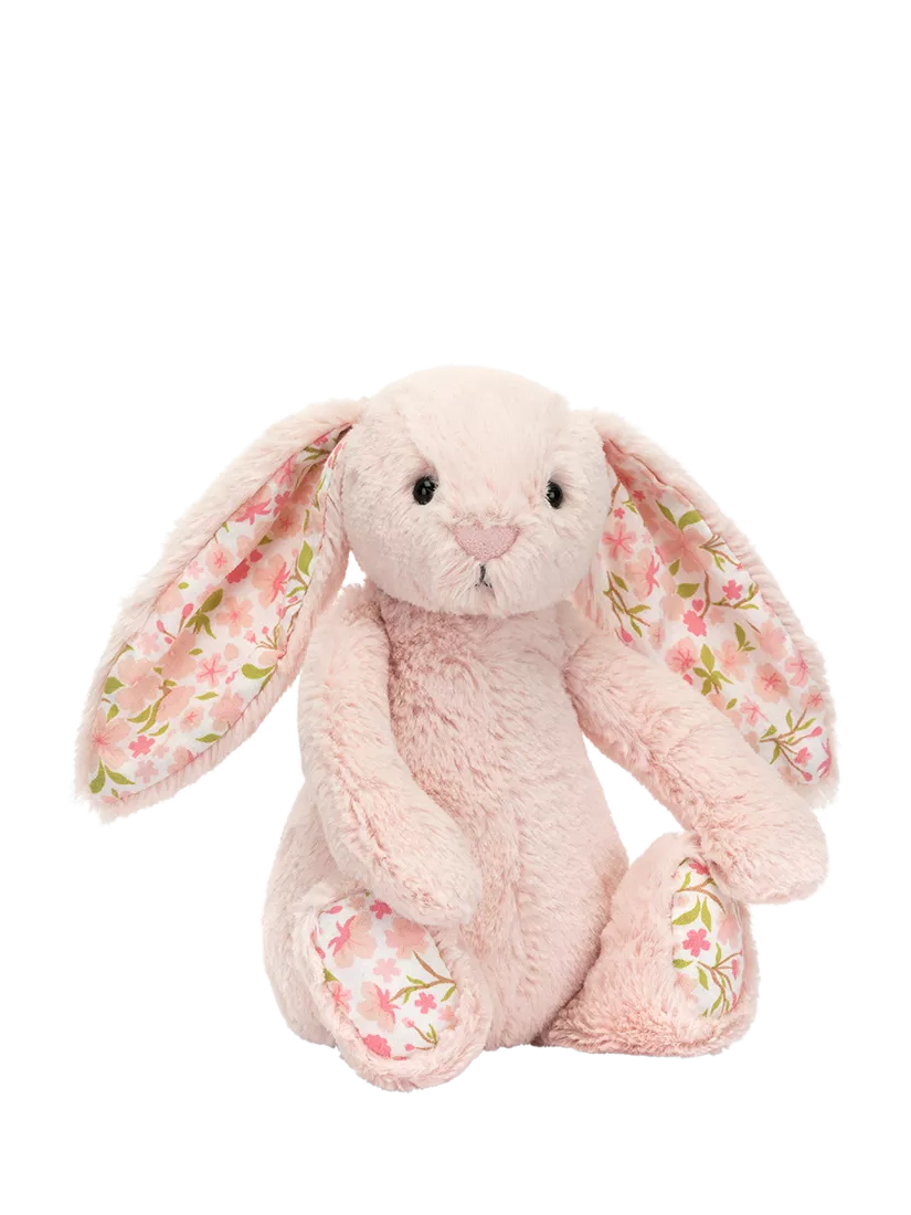 Blossom Bunny Cherry is a floral favourite! The iconic Bashful Bunny has soft fur with a cream bobtail. With a pink suedette nose, this bunny has soft cotton floral ears and feet printed with an original Jellycat floral design.