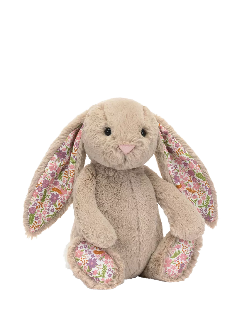 Blossom Bunny Petal is all wrapped up in Spring! The iconic Bashful Bunny has soft fur with a cream bobtail. With a suedette nose, this bunny has soft cotton floral ears and feet printed with an original Jellycat floral design.