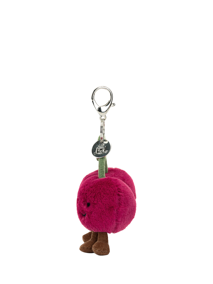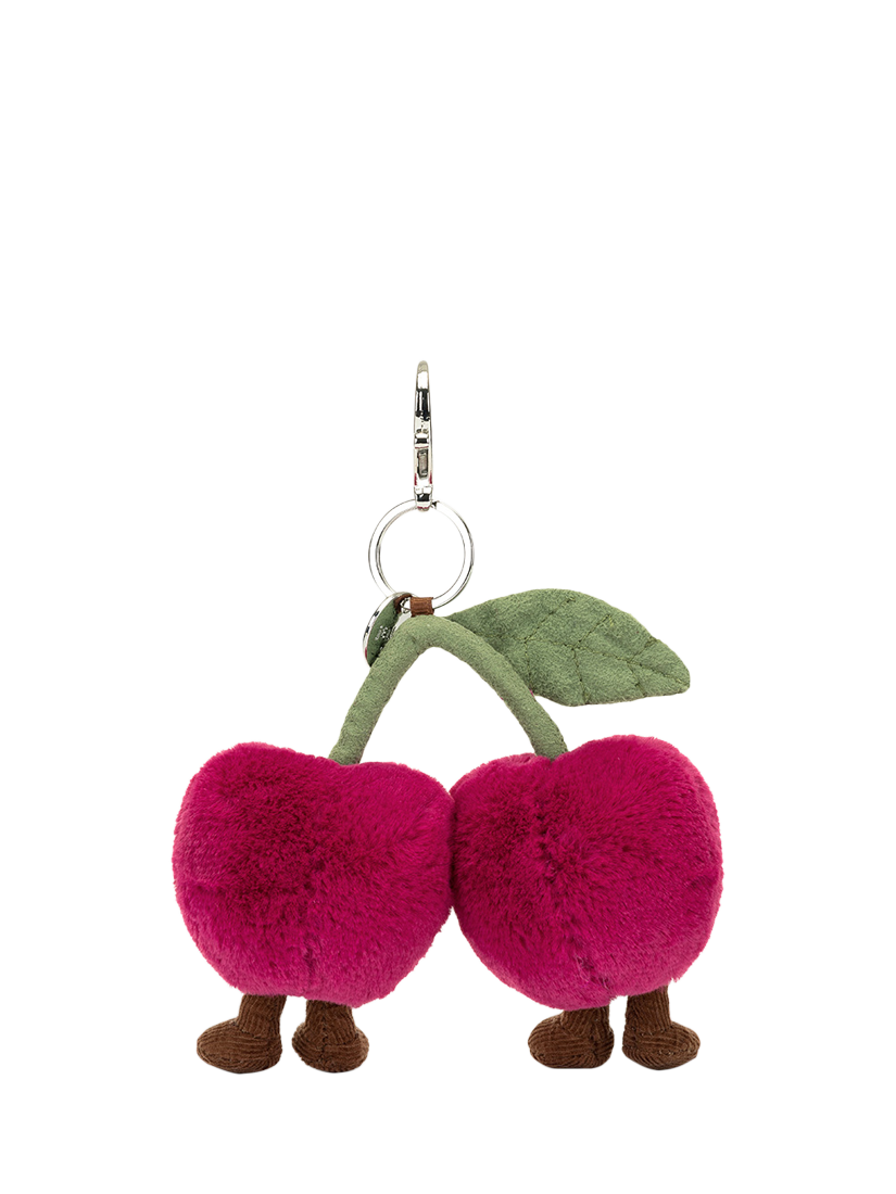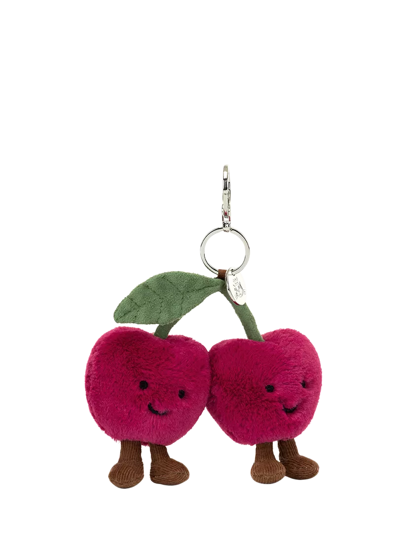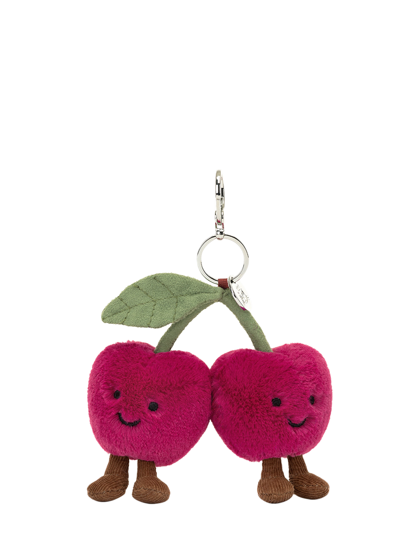 Amuseables Cherries bag charm is double the fun! Ripe in soft magenta fur with green suedette stalks and leaf, this smiling duo have a silver claw clip to attach to your bag.