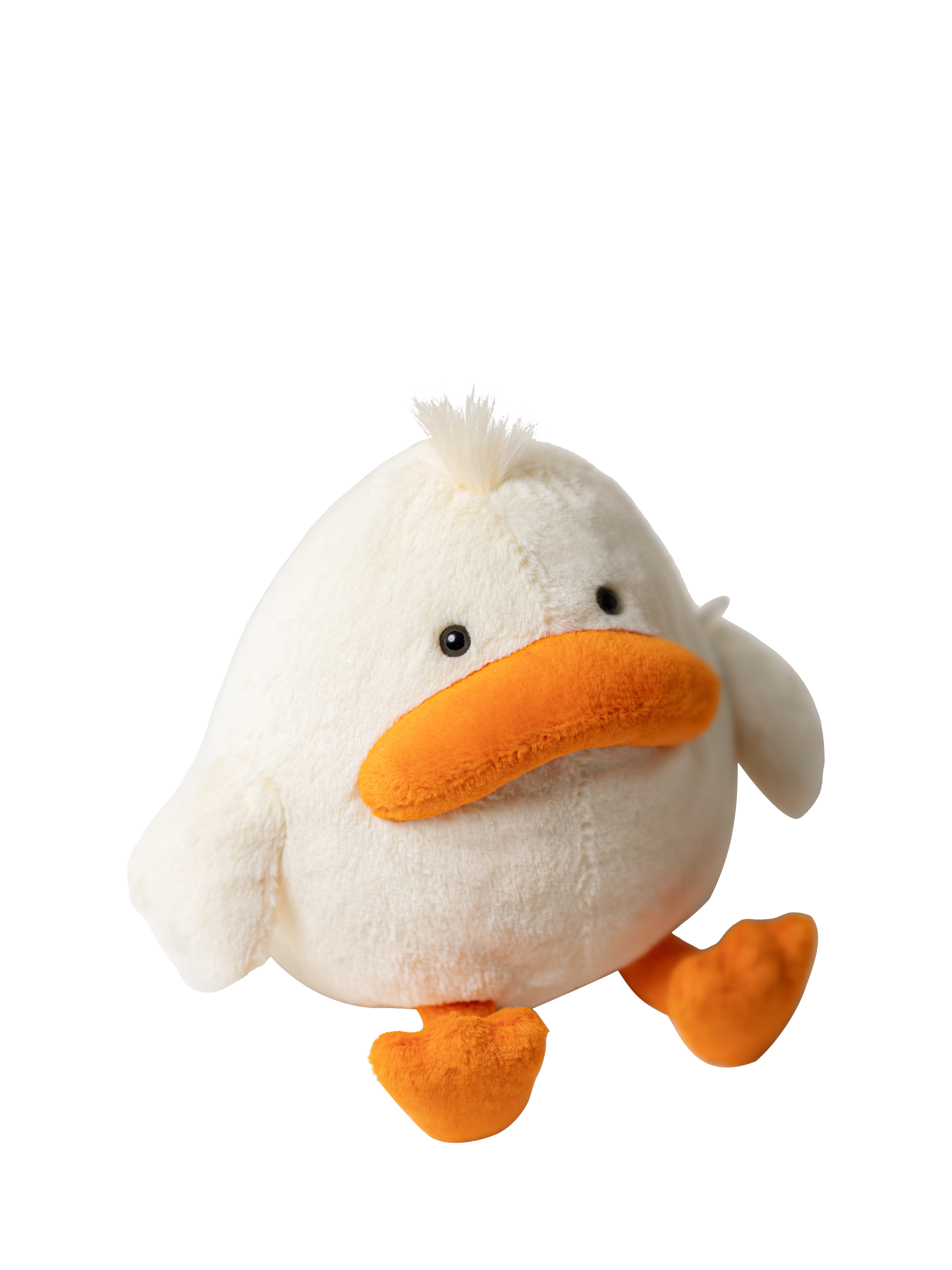 Head down to the pond to find Delia Duck. Super soft in cream fur, Delia has a matching tuft of long hair and short, wide wings. With bright orange feet and a matching sad beak, this grumpy duck prefers cuddles over bread.