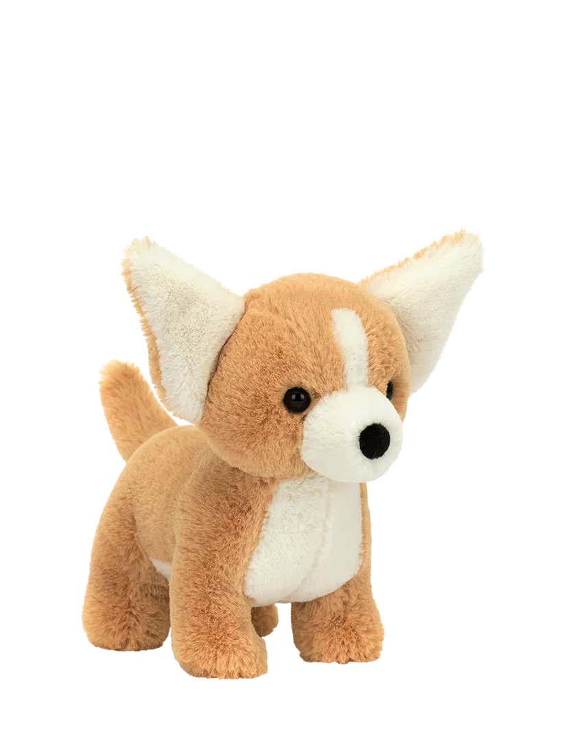 Small and feisty in soft honey fur, it's Isobel Chihuahua! This loveable Chi has a vanilla chest and tum, and big two-toned ears. Those little legs make her the perfect handbag companion!