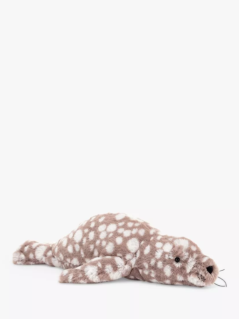 With mottled, super-soft fur Linus Leopard Seal looks as happy as can be! Whether he's lolloping onto the beach or navigating the sea, this slinky seal looks great with his cream splodges, dreamy-soft fur and fine stitchy flippers.