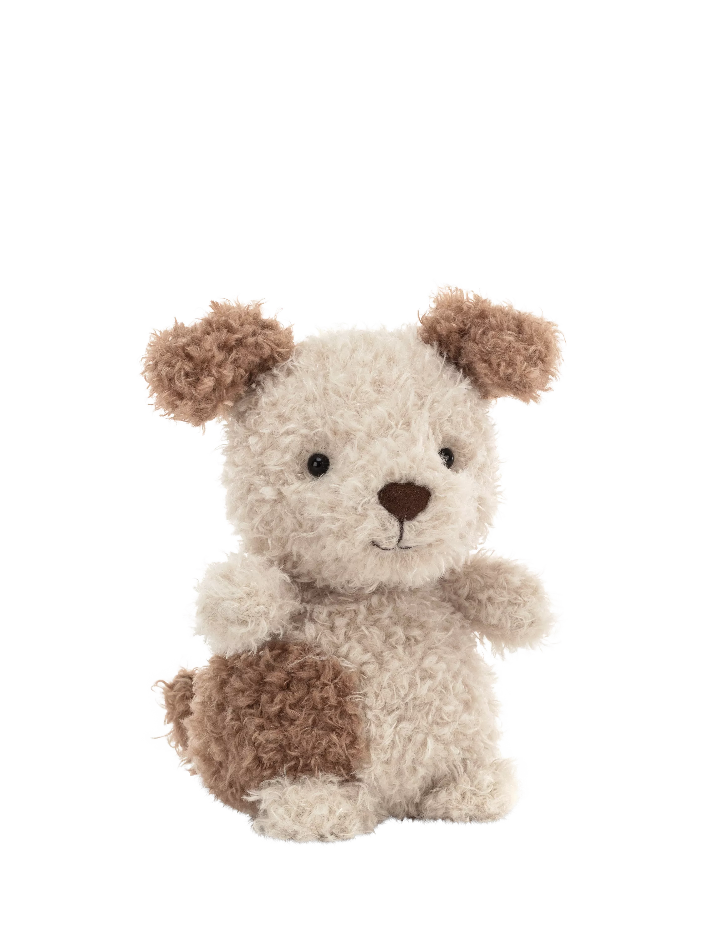 Little Pup is the perfect pocket-sized pet in splotchy biscuit and brown fur. With a tiny tail to wag and perky ears listening out for playtime, this smiley pup is ready to snuggle!