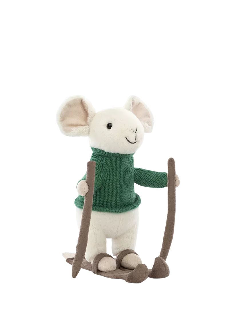 Hit the slopes with Merry Mouse Skiing and those suedey skis and poles. This sweet cream mouse has popped on a knitted green jumper to keep warm on the slopes.
