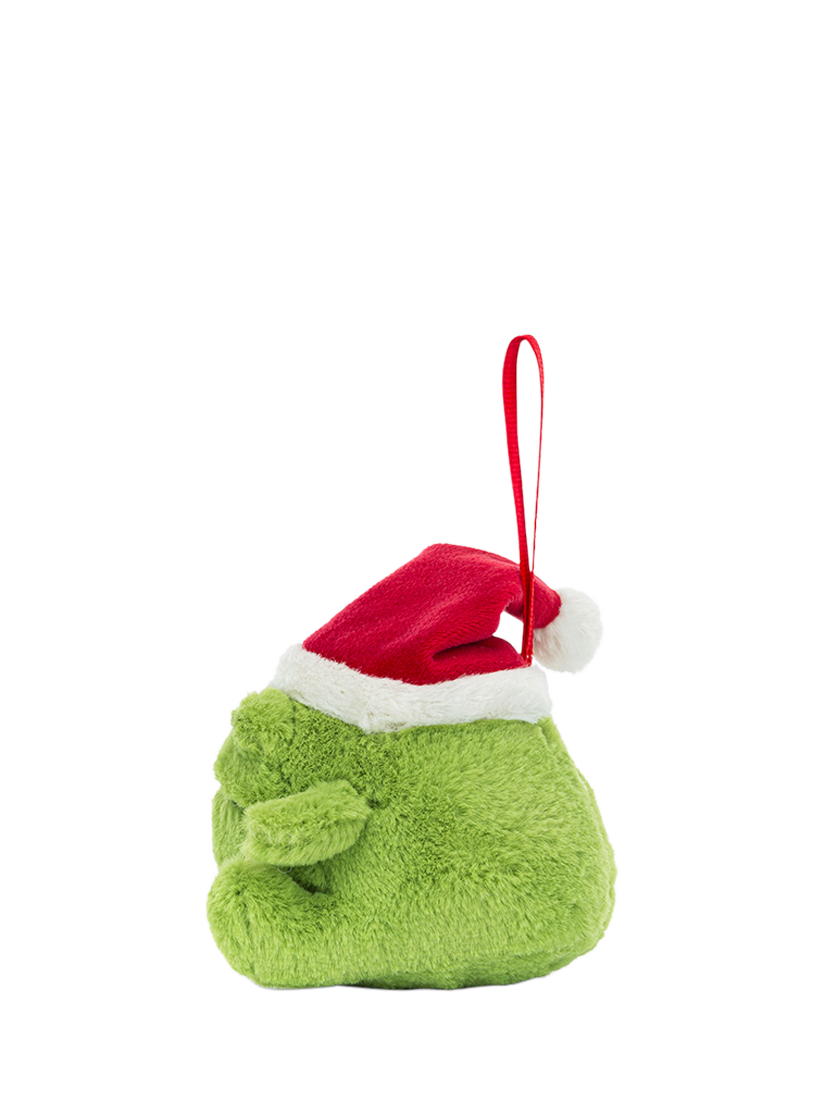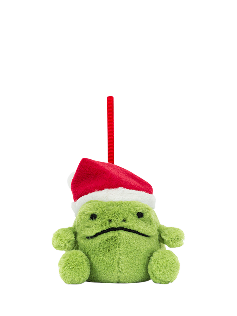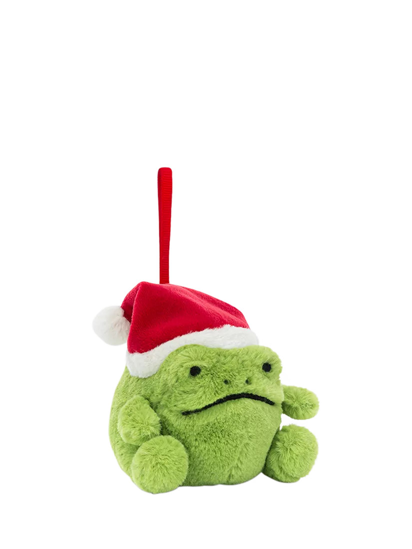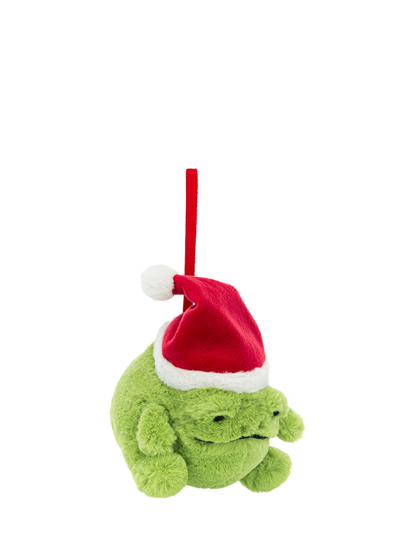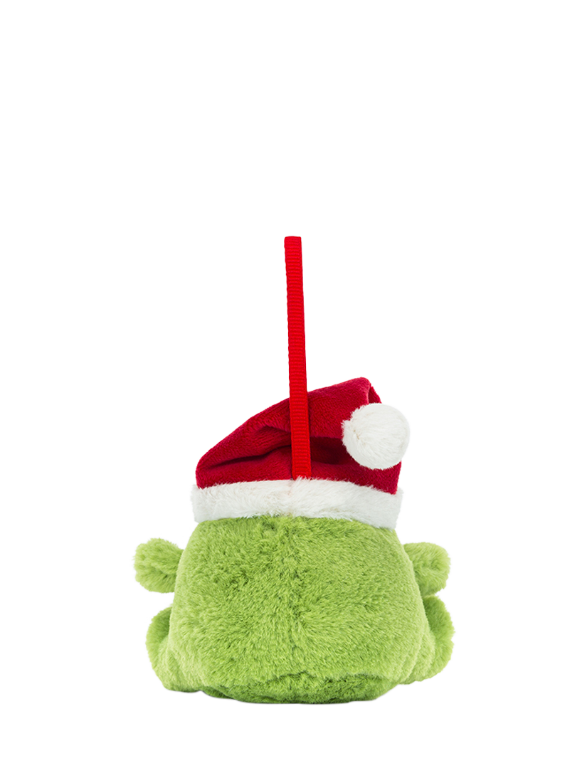 Ricky Rain Frog is grumpy but festive! A tiny grumpy Ricky Rain Frog in soft green fur wears a Santa hat and has a matching red ribbon loop to pop him on the tree.