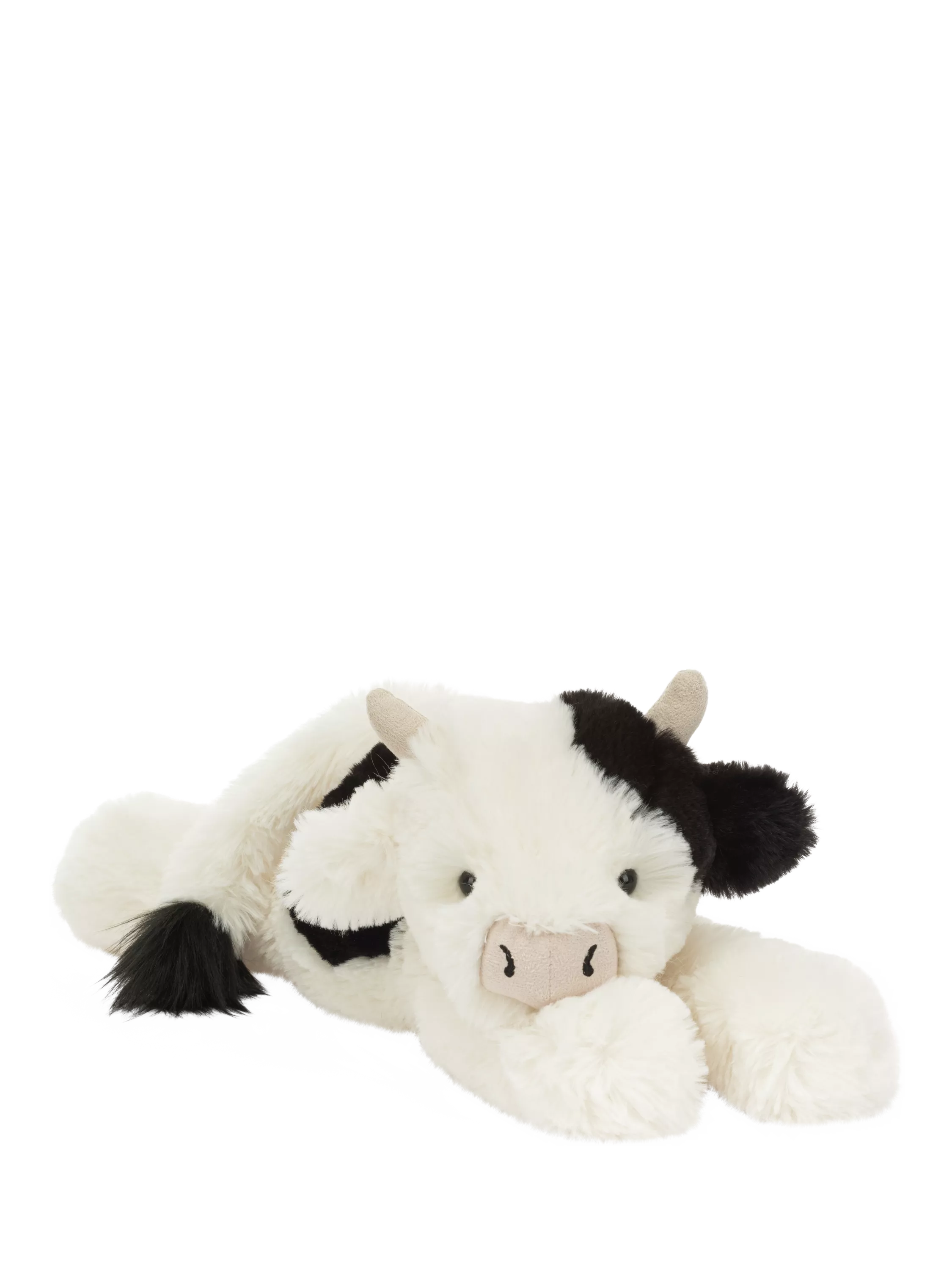 Smudge Cow is the farmyard sweetheart in super soft cream and black fur. With suedette horns and nose with embroidered detail, this cuddly calf has long limbs and a soft tum to flop in your arms.