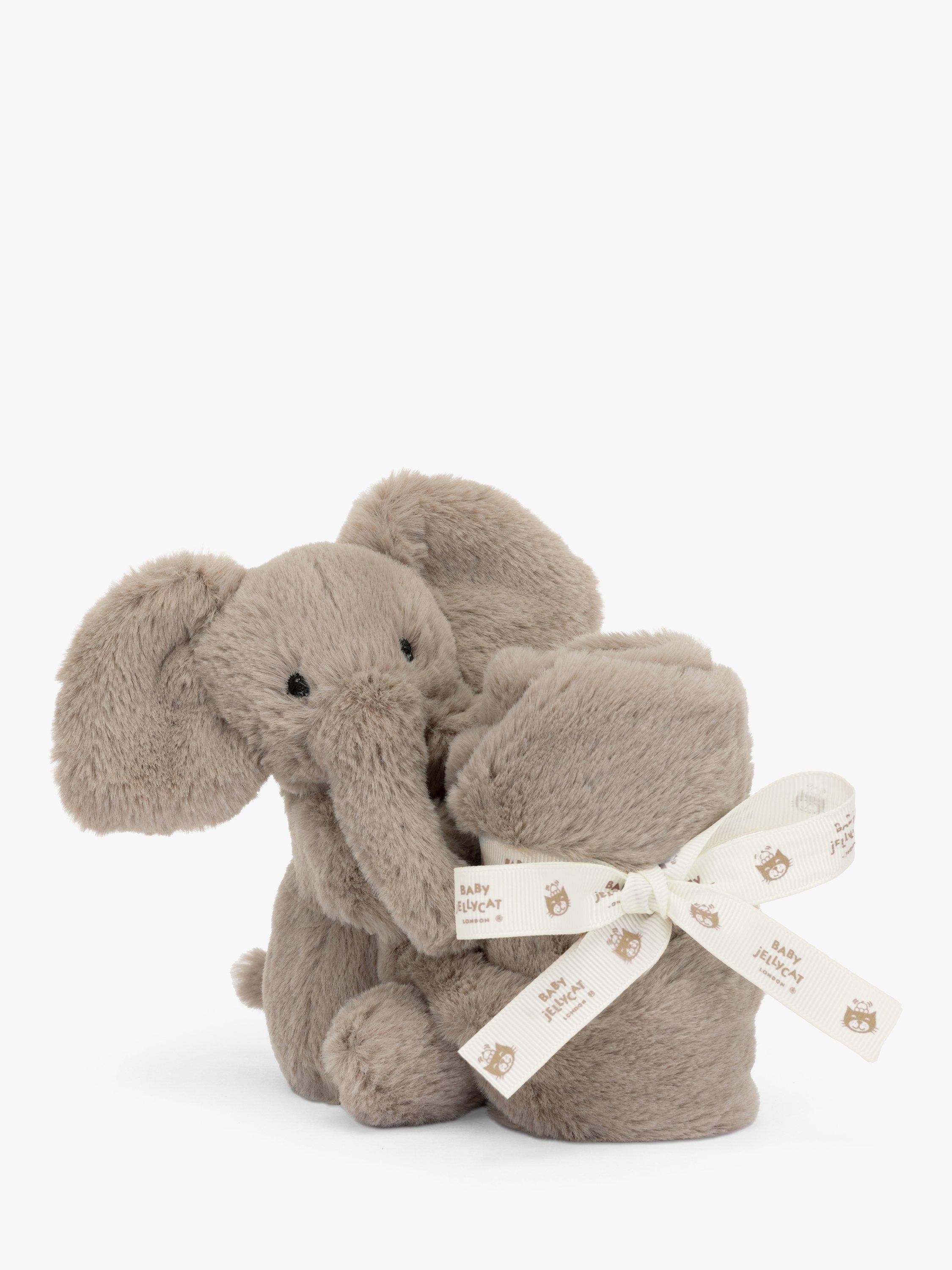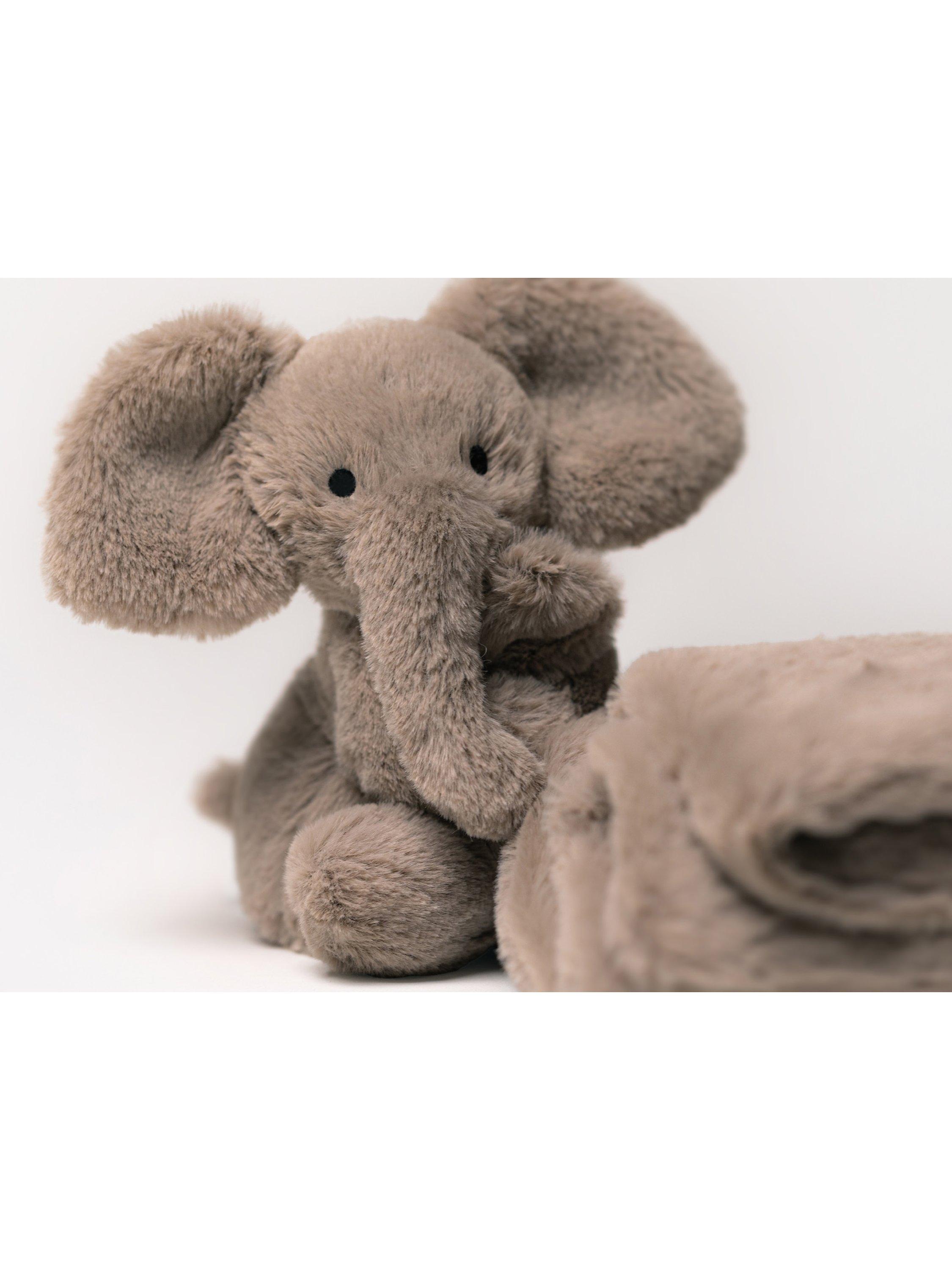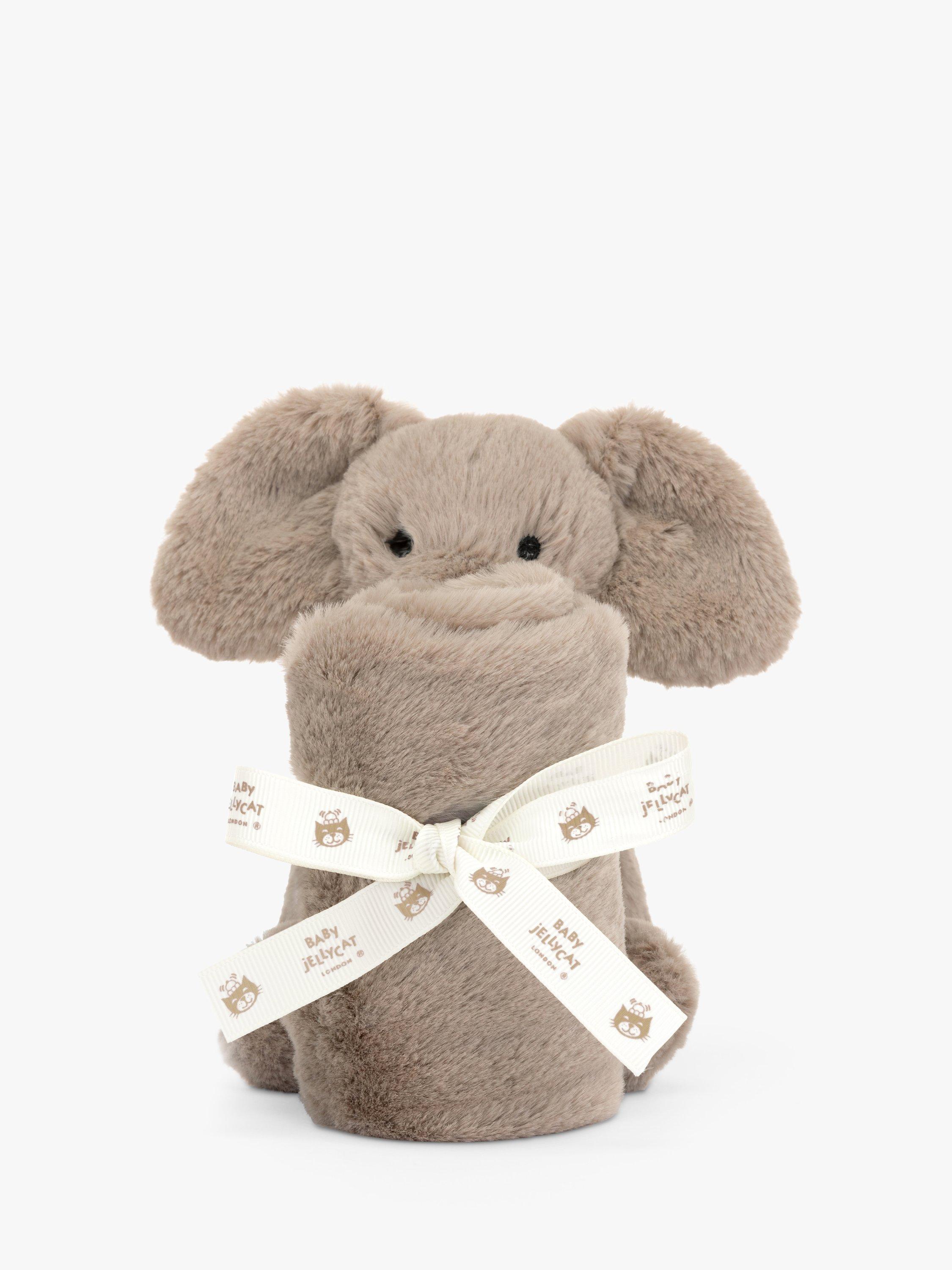Smudge Elephant Soother from Jellycat brings comfort at sleep times. Little ones can cuddle up with the luxuriously soft grey fur blanket or the tiny Smudge Elephant holding on to the corner, for the most joyful of dreams. This soother is tied with a grosgrain printed ribbon and presented in an elegant Jellycat gift box with a gift card and envelope. A gorgeous gift for a new arrival.