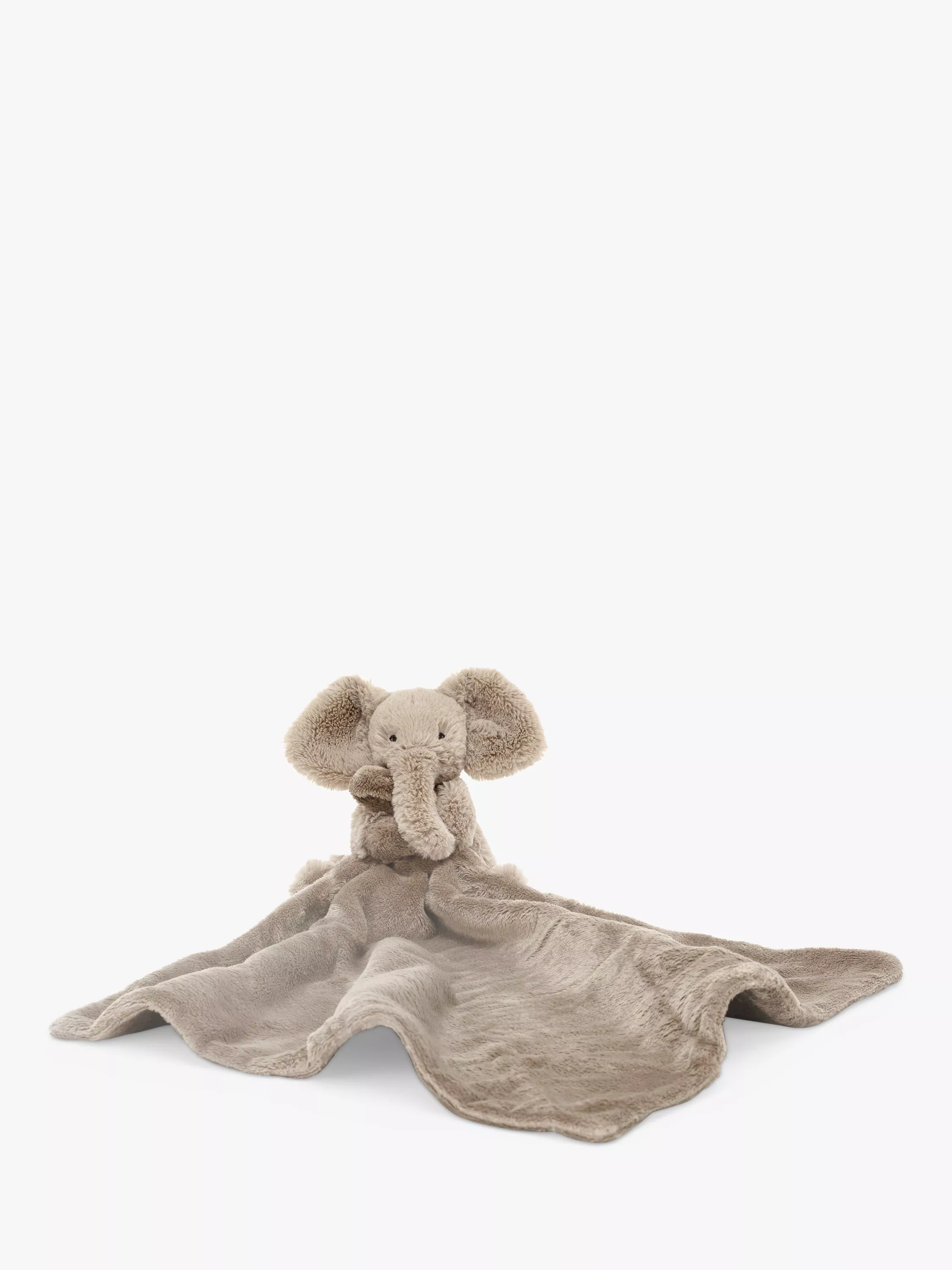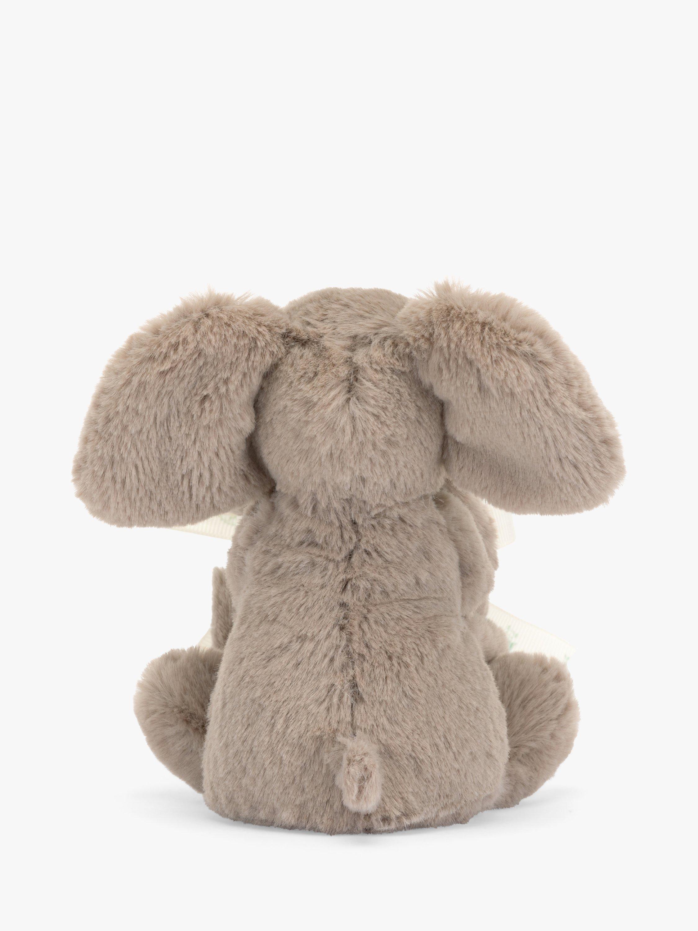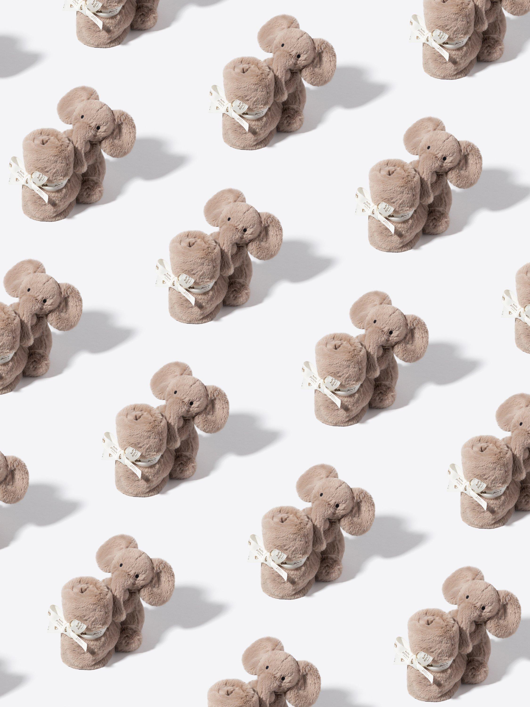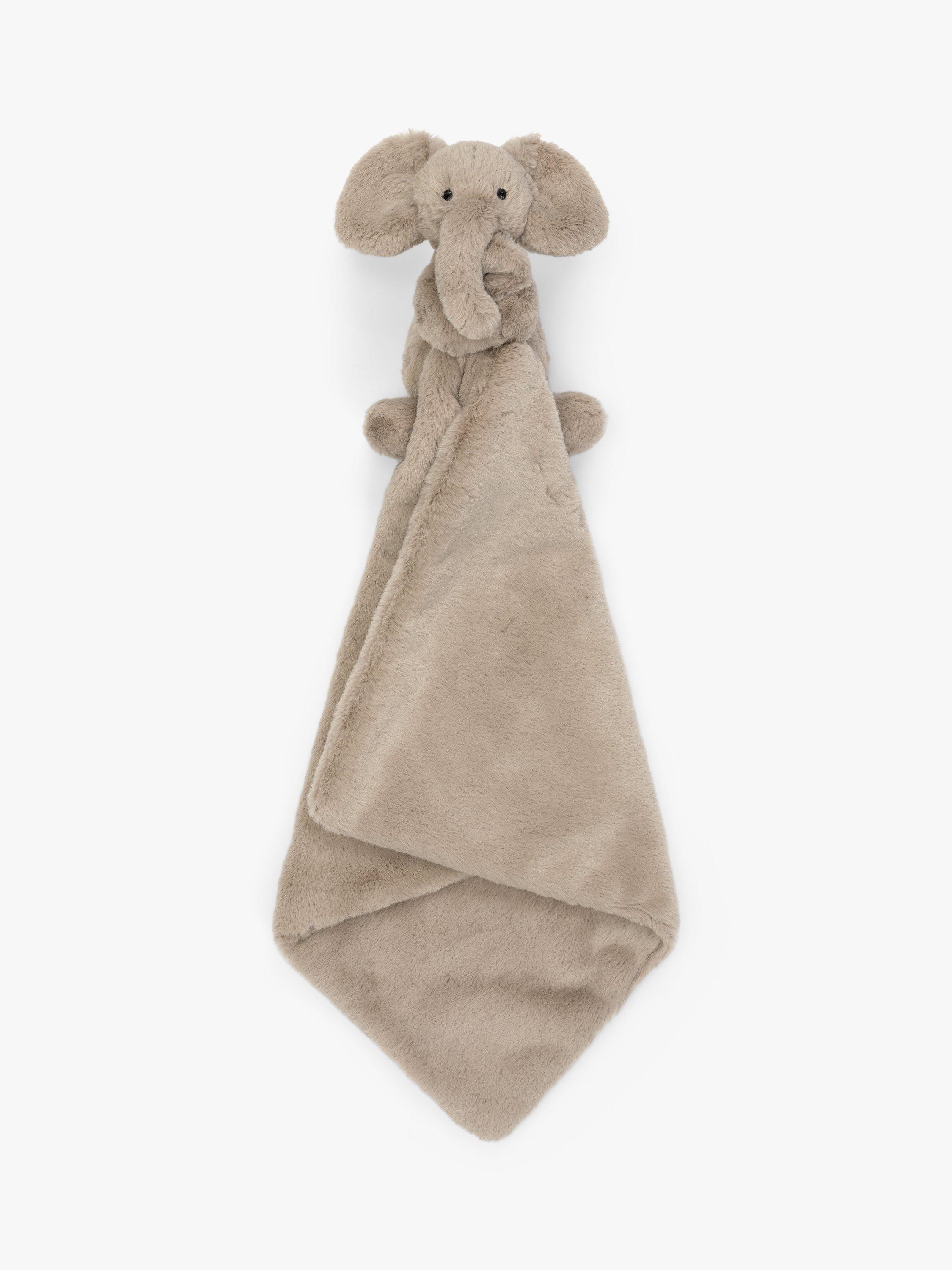 Smudge Elephant Soother from Jellycat brings comfort at sleep times. Little ones can cuddle up with the luxuriously soft grey fur blanket or the tiny Smudge Elephant holding on to the corner, for the most joyful of dreams. This soother is tied with a grosgrain printed ribbon and presented in an elegant Jellycat gift box with a gift card and envelope. A gorgeous gift for a new arrival.