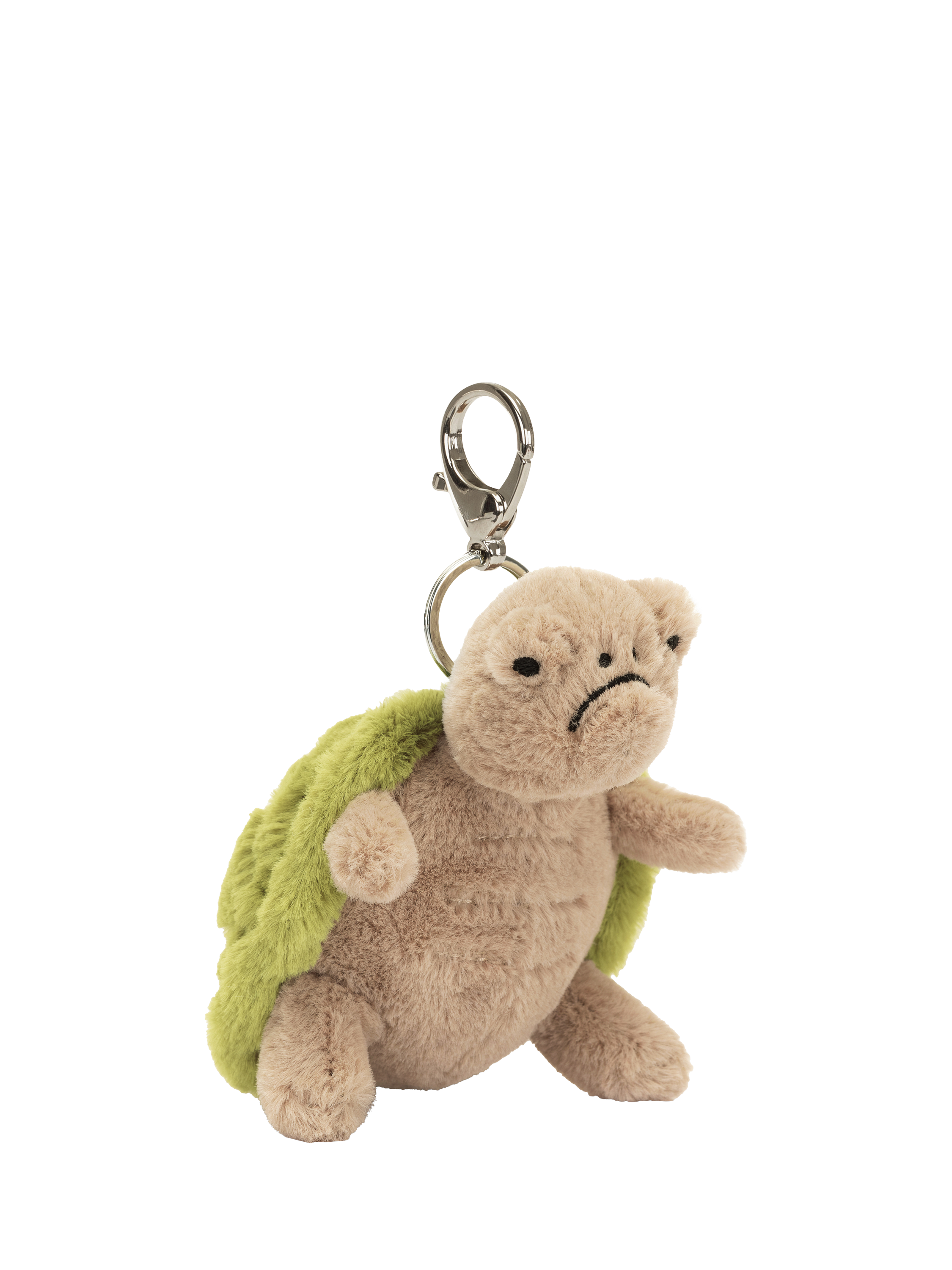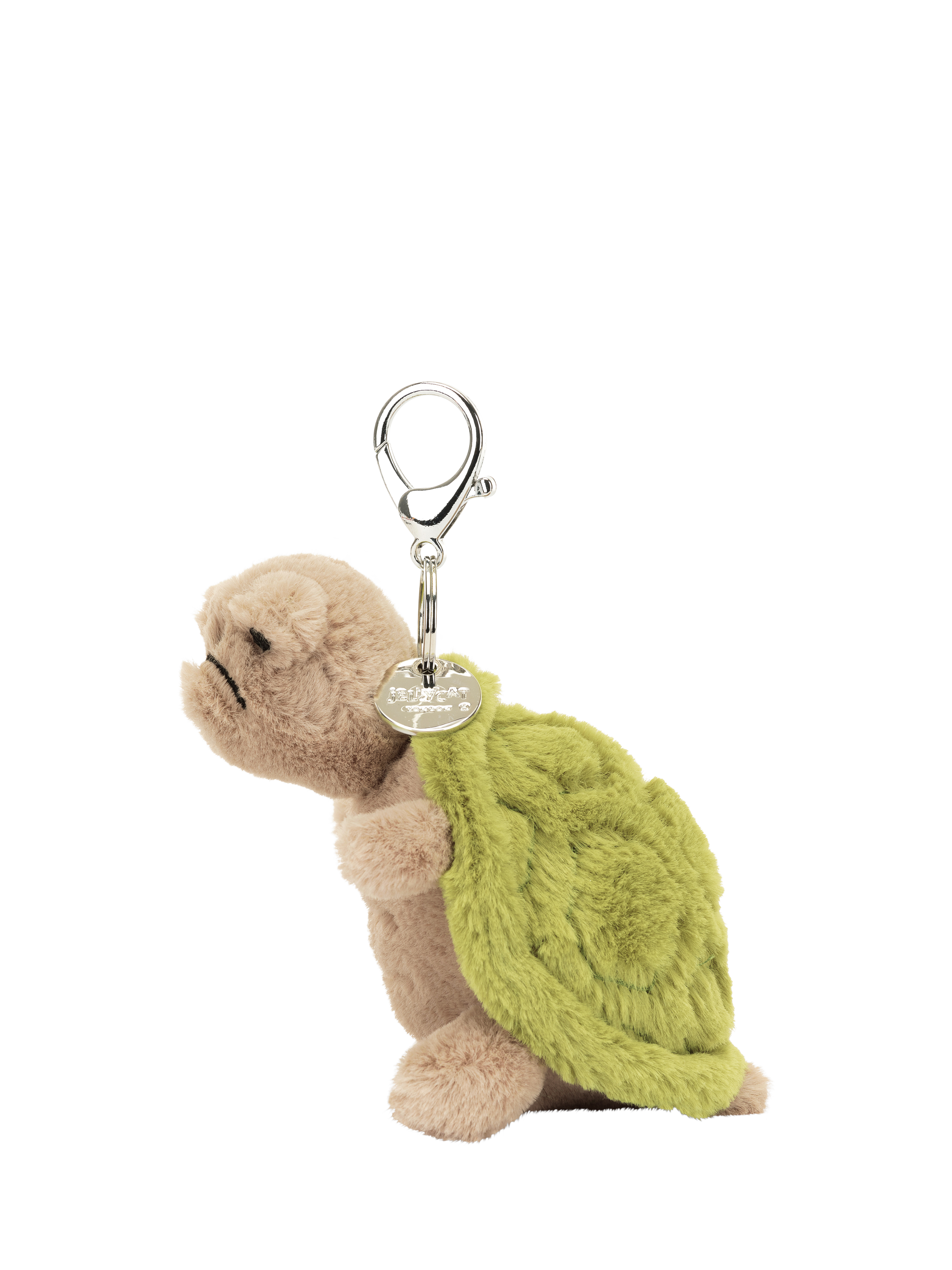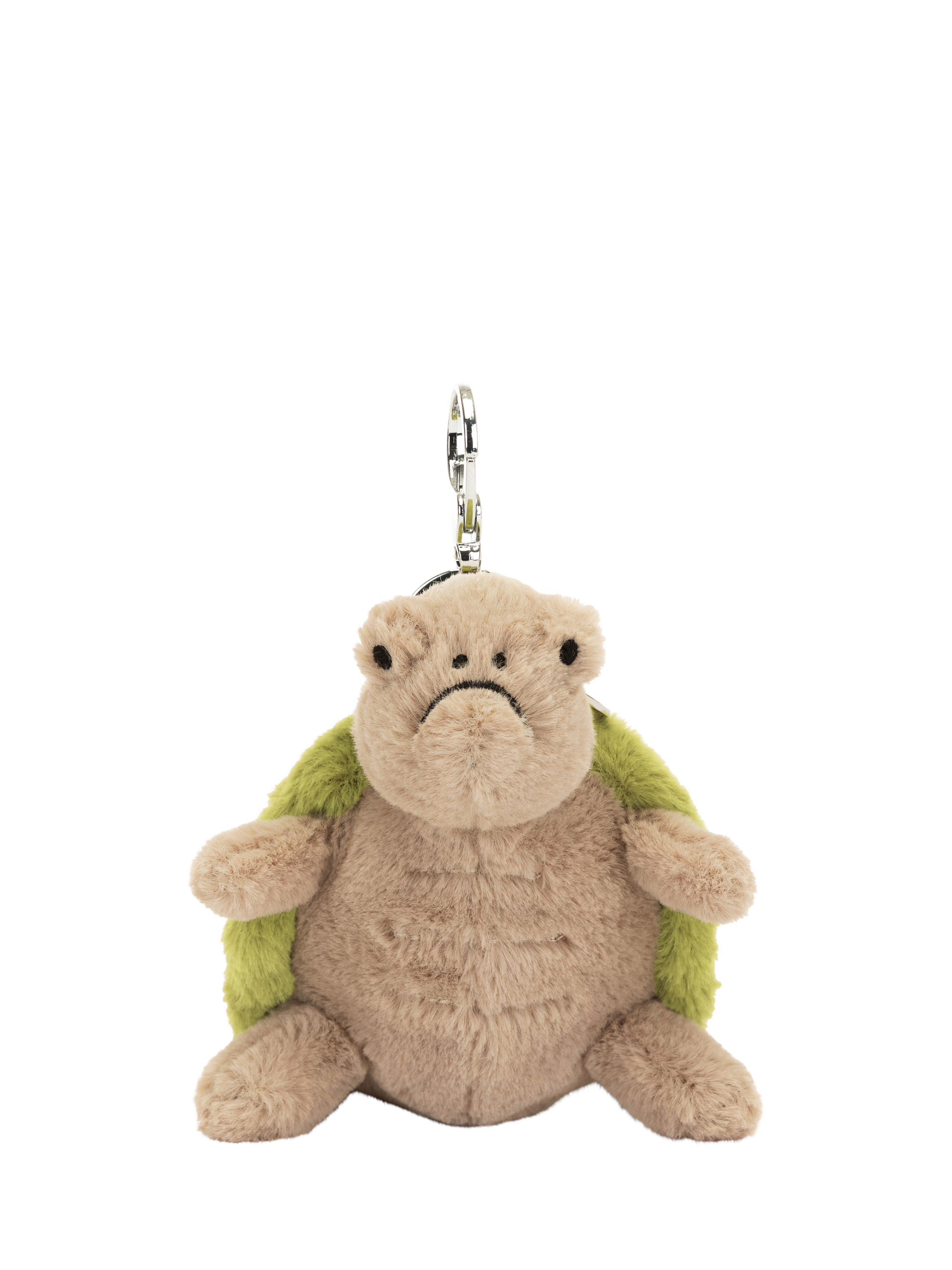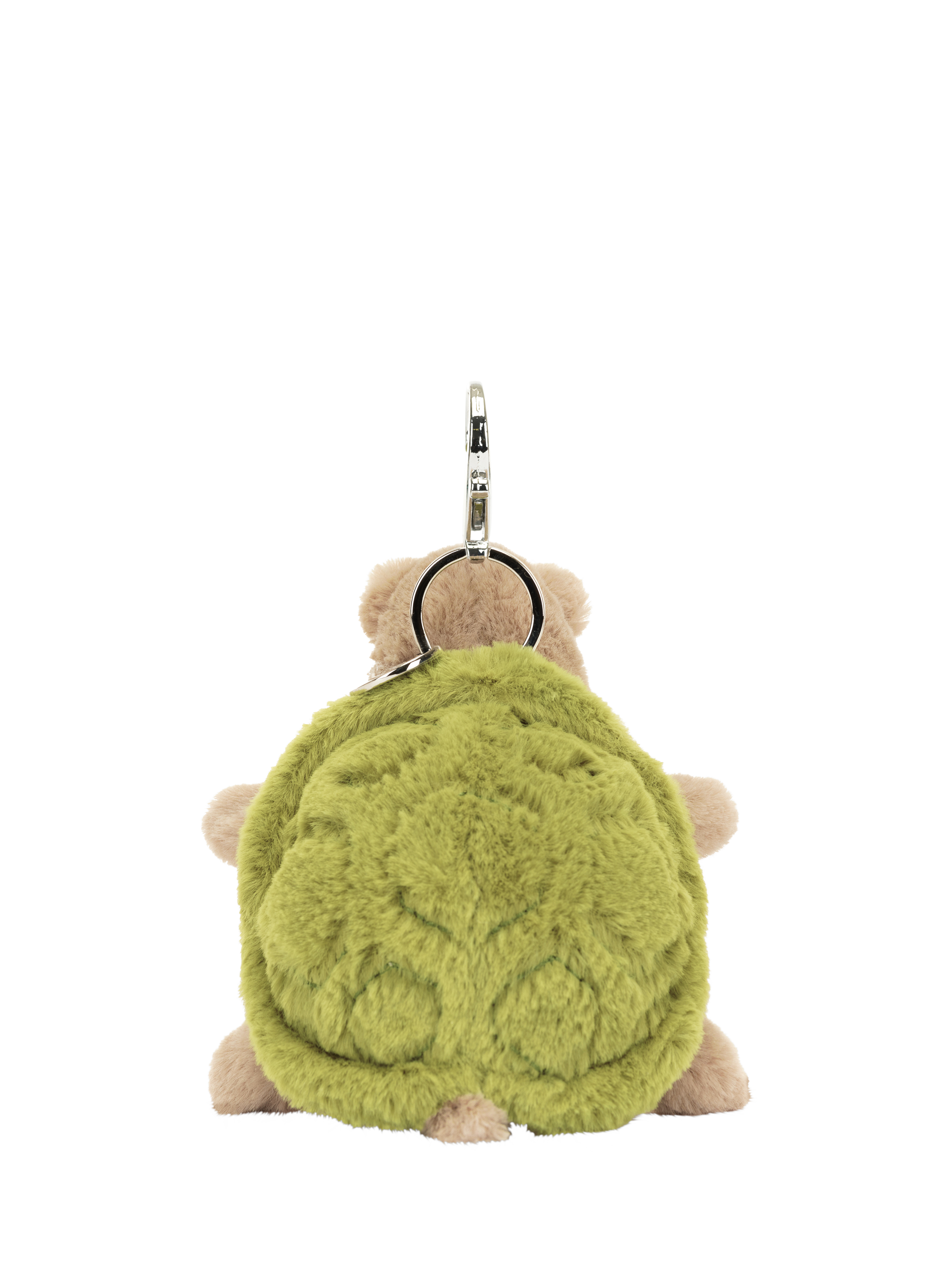 Have a turtle tag-along with Timmy Turtle Bag Charm. Timmy is super soft in beige fur with a sage green shell with stubby arms and legs, and a metallic clasp to hook onto bags.