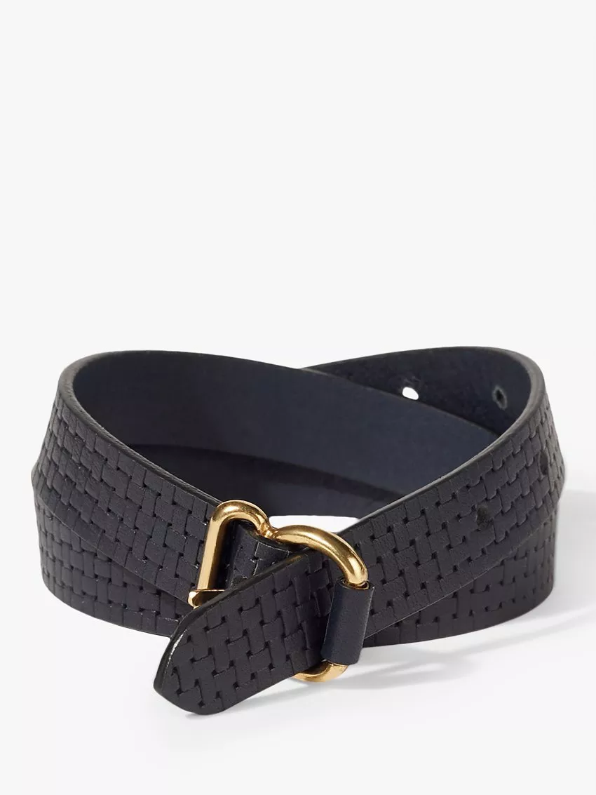 This intricate, skinny Altea belt from Jigsaw is designed in a woven effect embossed leather with a rounded buckle shape. With its minimal and modern design, this belt upgrades any outfit from jeans and tees to cinched over jackets or dresses.