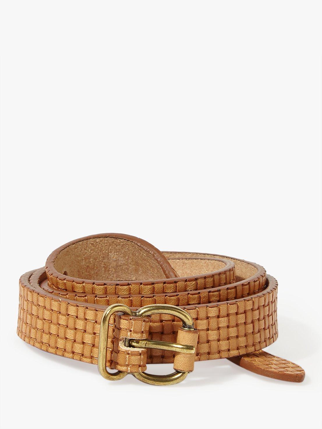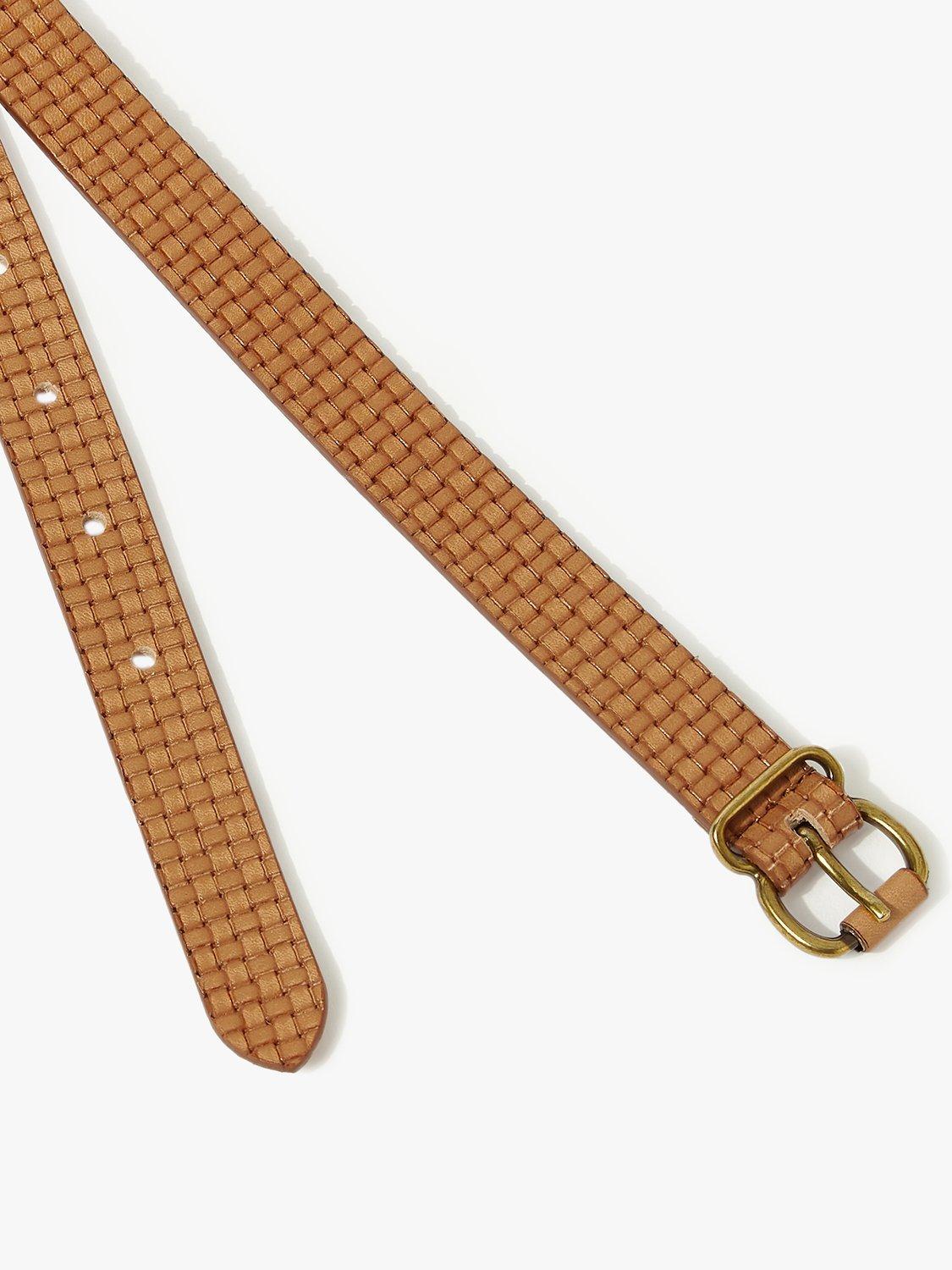 This intricate, skinny Altea belt from Jigsaw is designed in a woven effect embossed leather with a rounded buckle shape. With its minimal and modern design, this belt upgrades any outfit from jeans and tees to cinched over jackets or dresses.