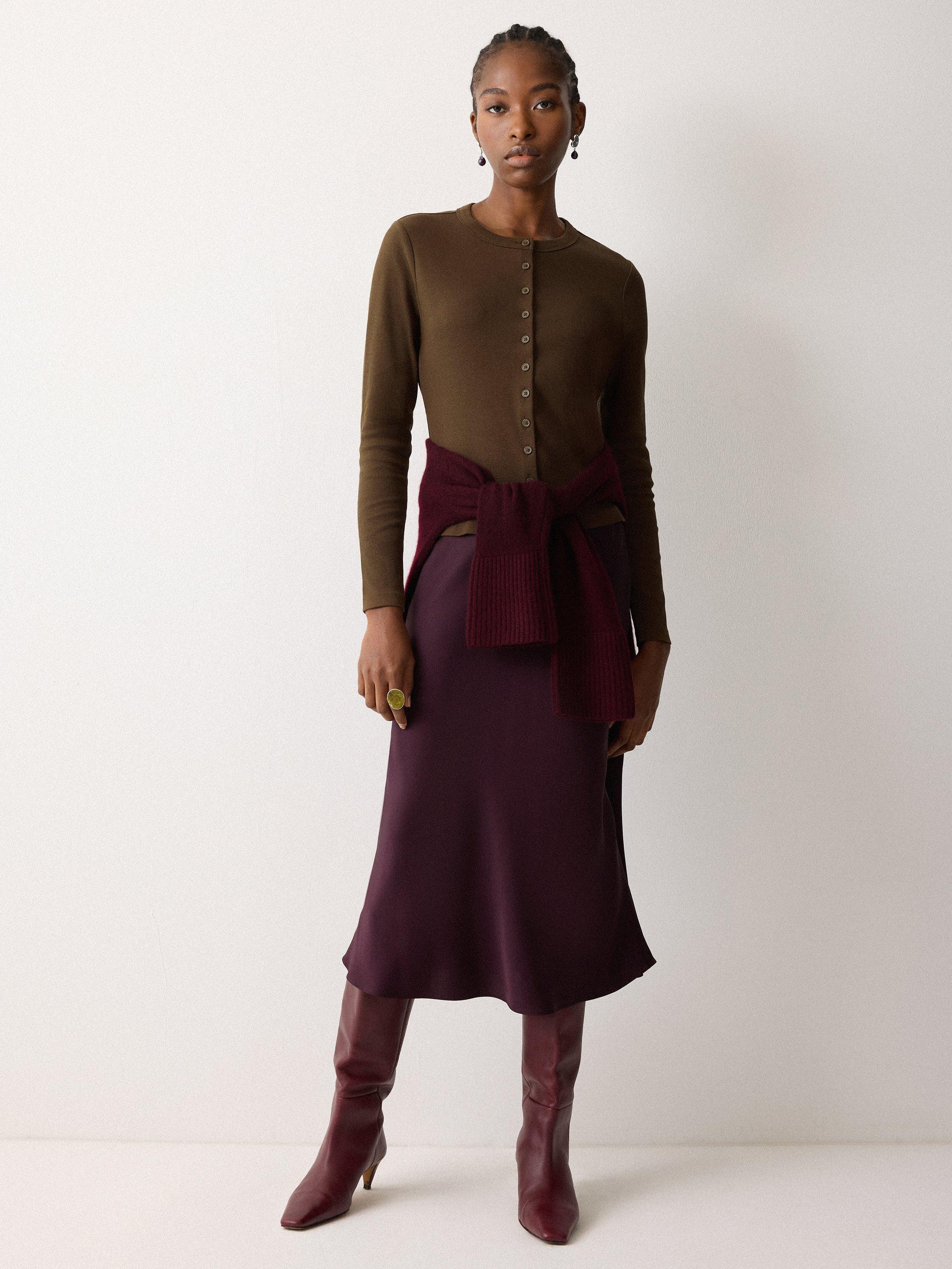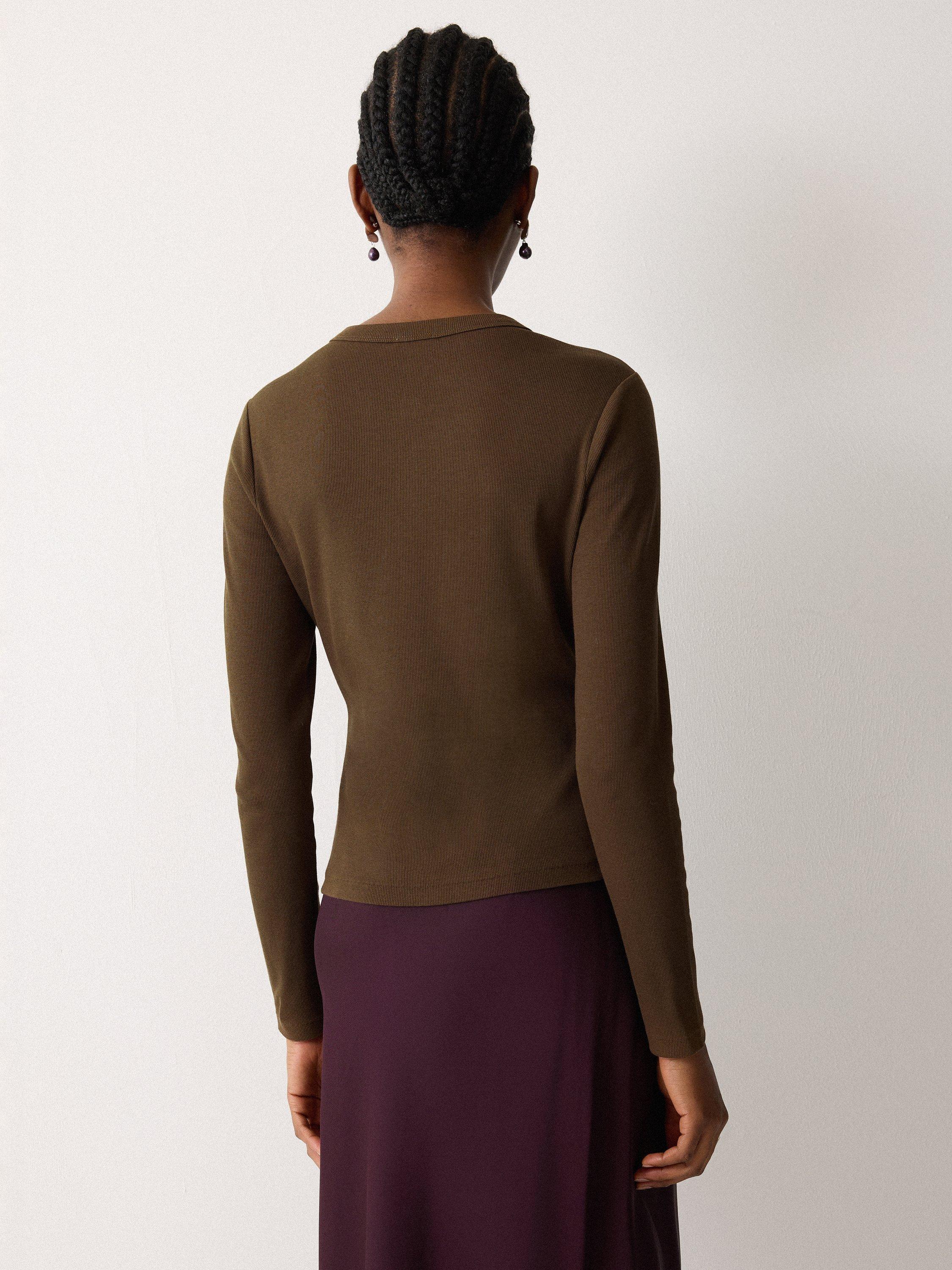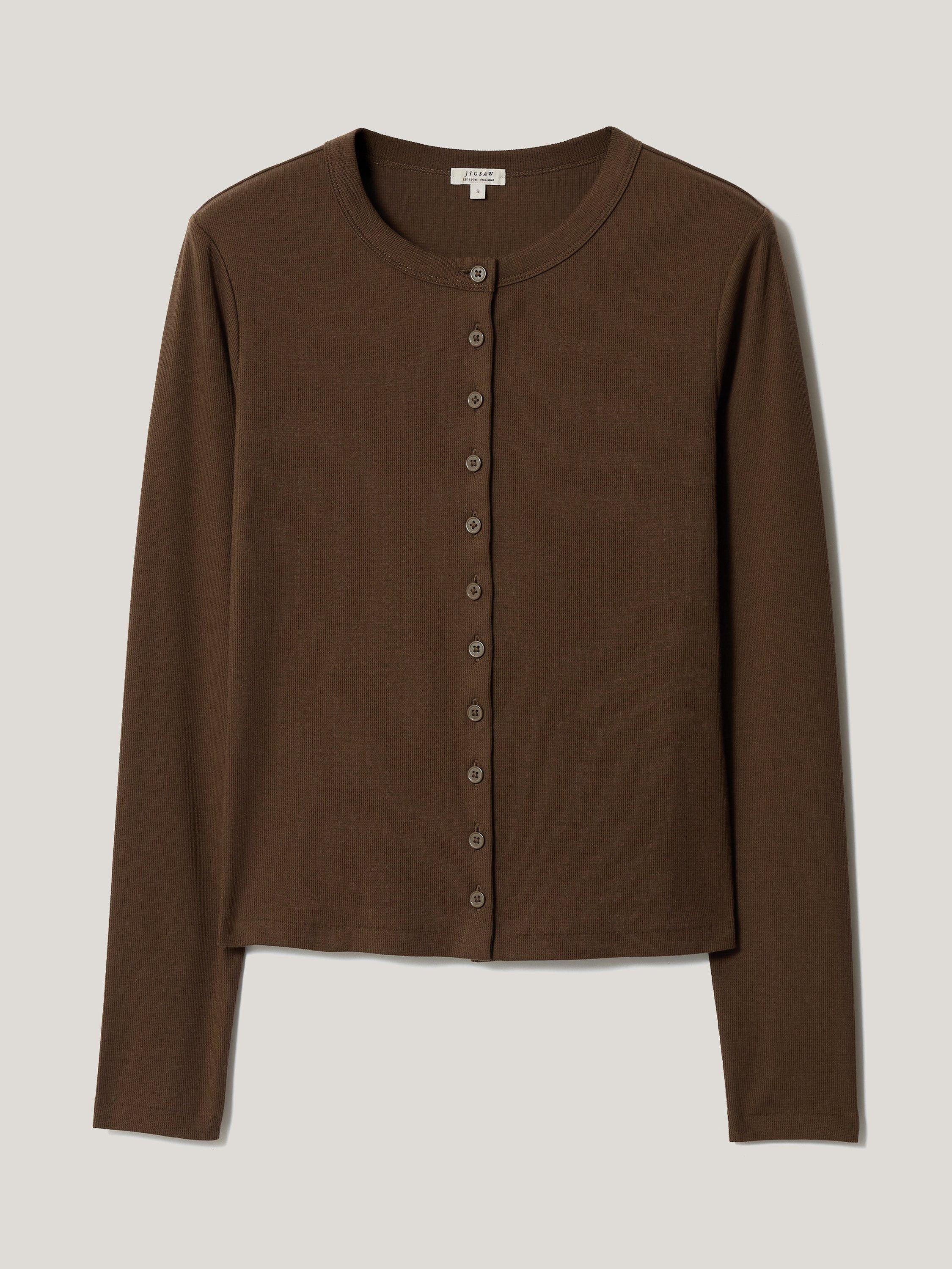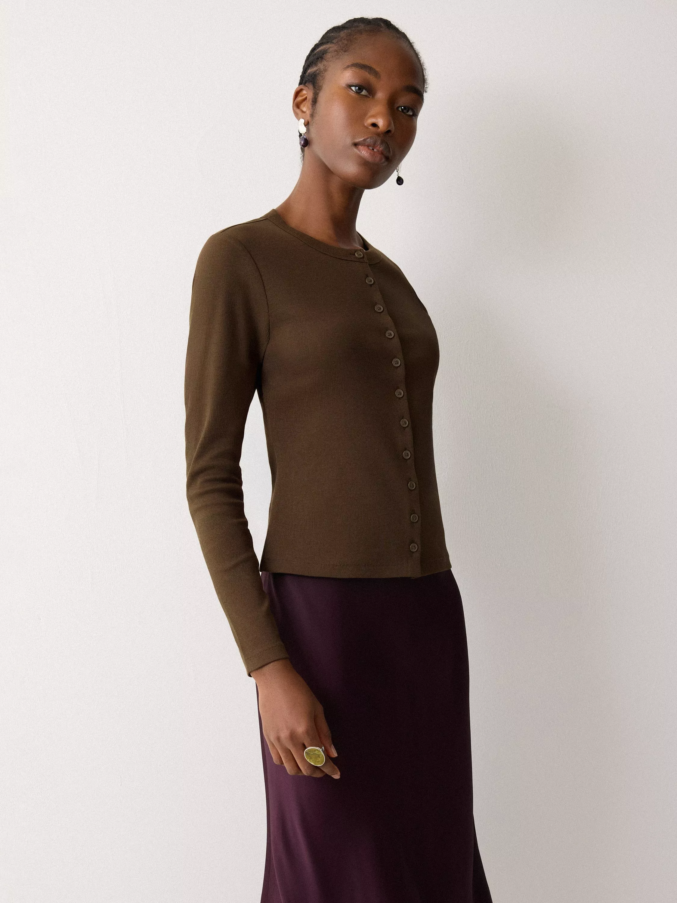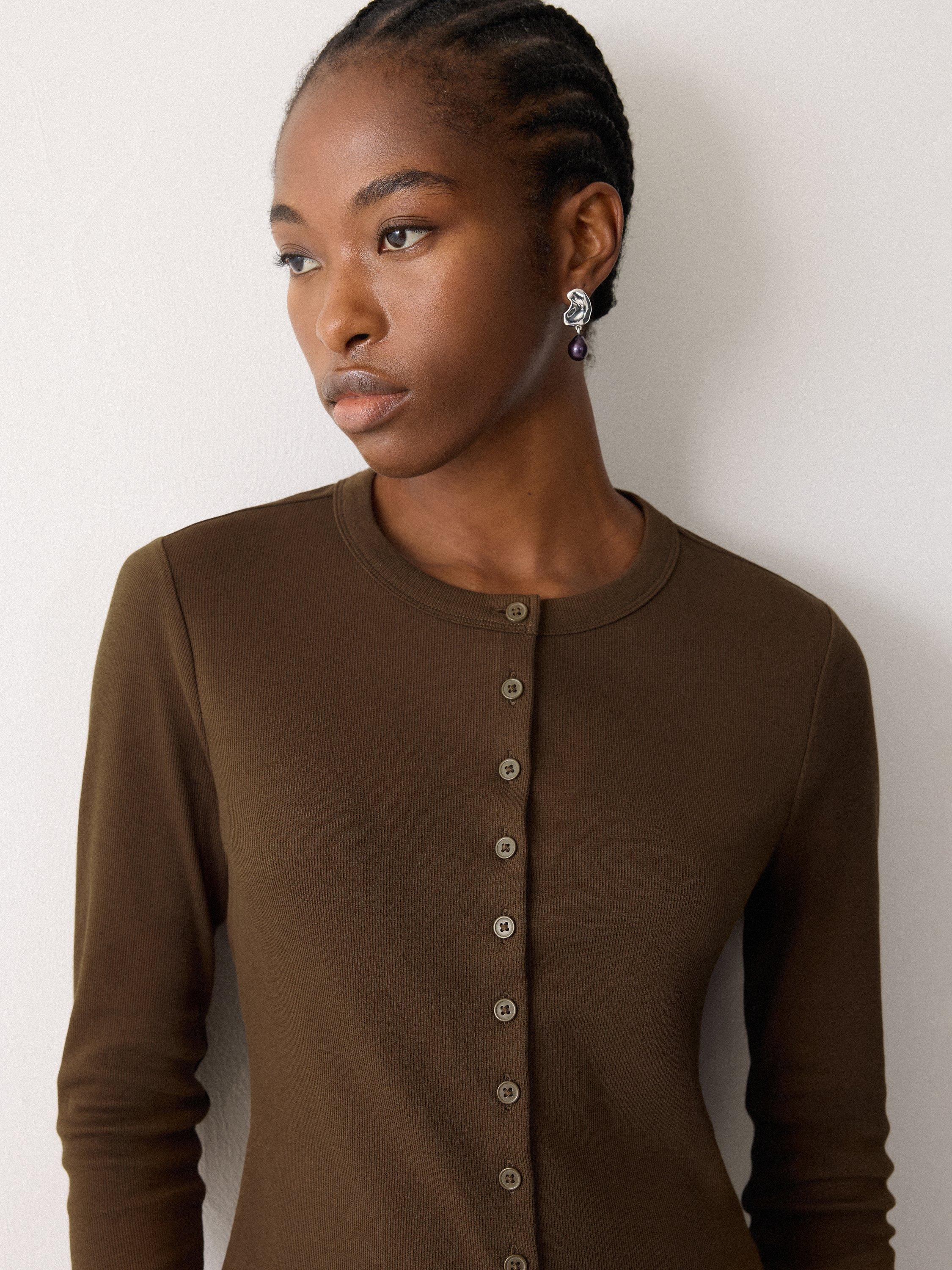 This Button Through Baby Tee has a ribbed fit rounded neck. A wardrobe staple elevated with fit and hue to work well for any occasion in your diary.