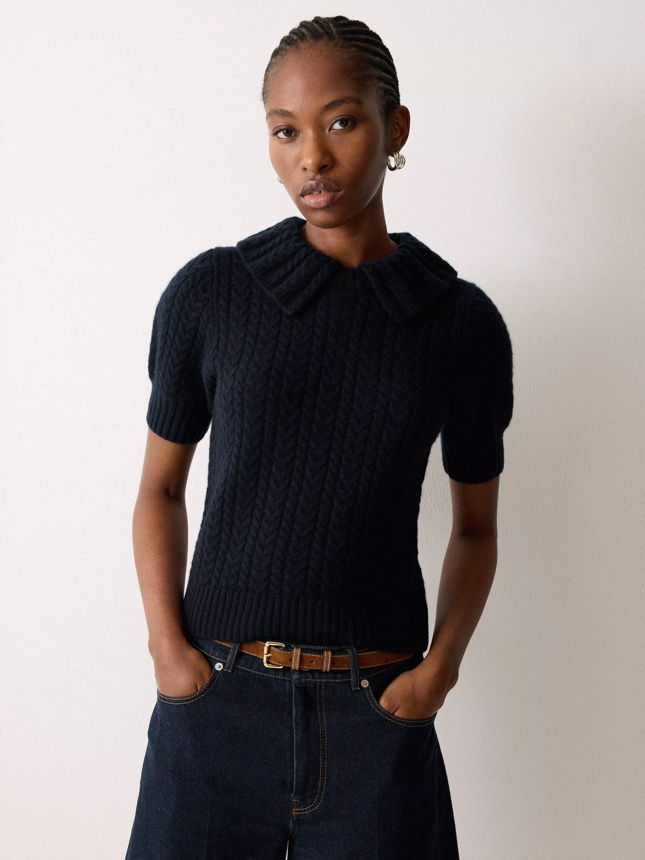 Complete with puff-style sleeves and a preppy collar, this cable knit jumper is a refined knit crafted from a blend of wood and cashmere for a super soft, luxurious finish. Perfect teamed with denim, tailored trousers or a midi-length skirt.