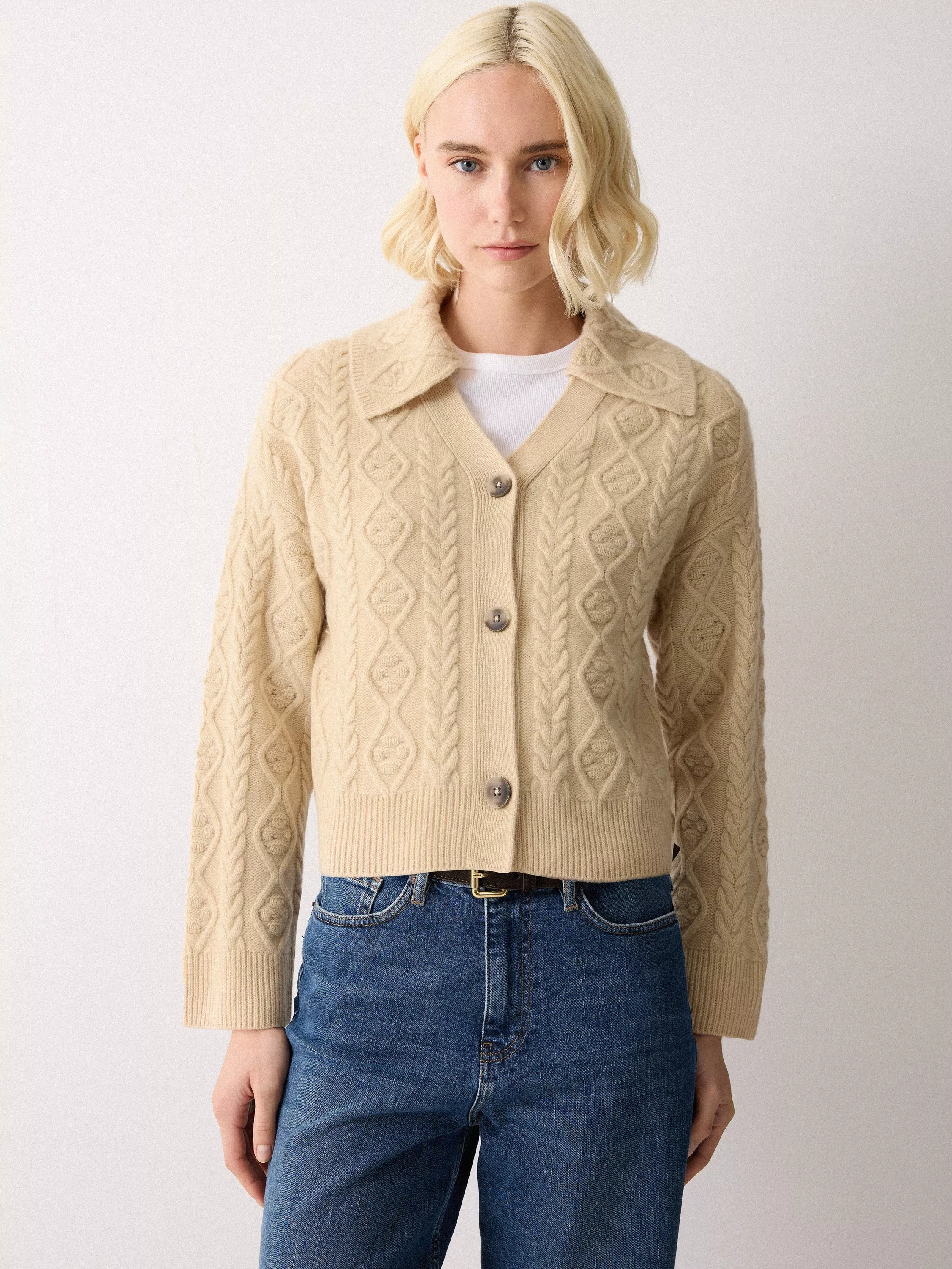 Knitted from a wool-rich blend, this Cable Cardigan is an easy-wearing piece. Featuring horn buttons, a button-front and collar detail, this is a true love forever piece.