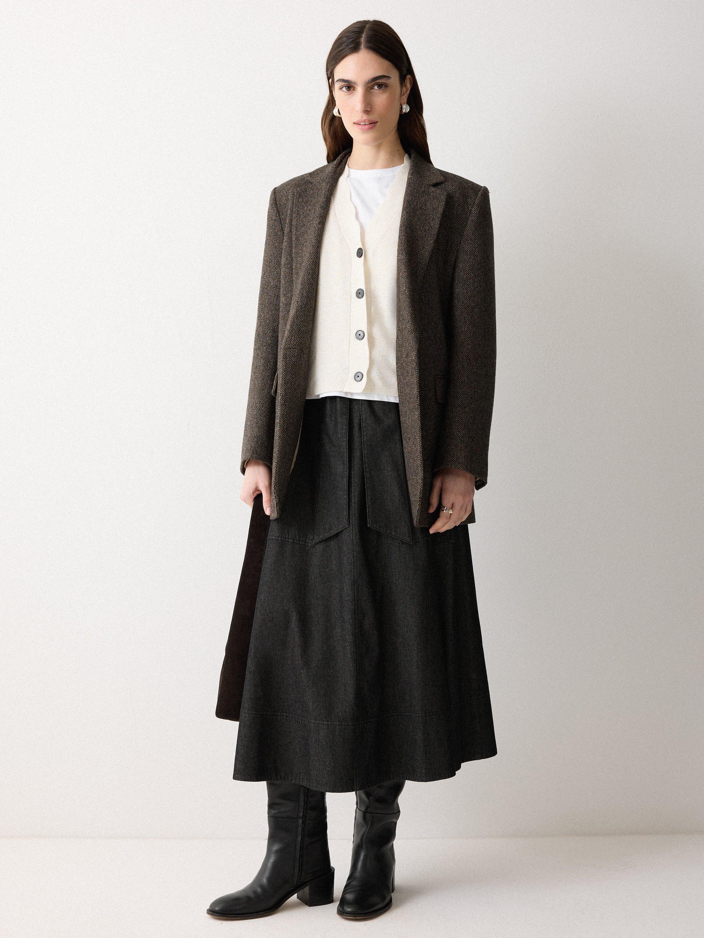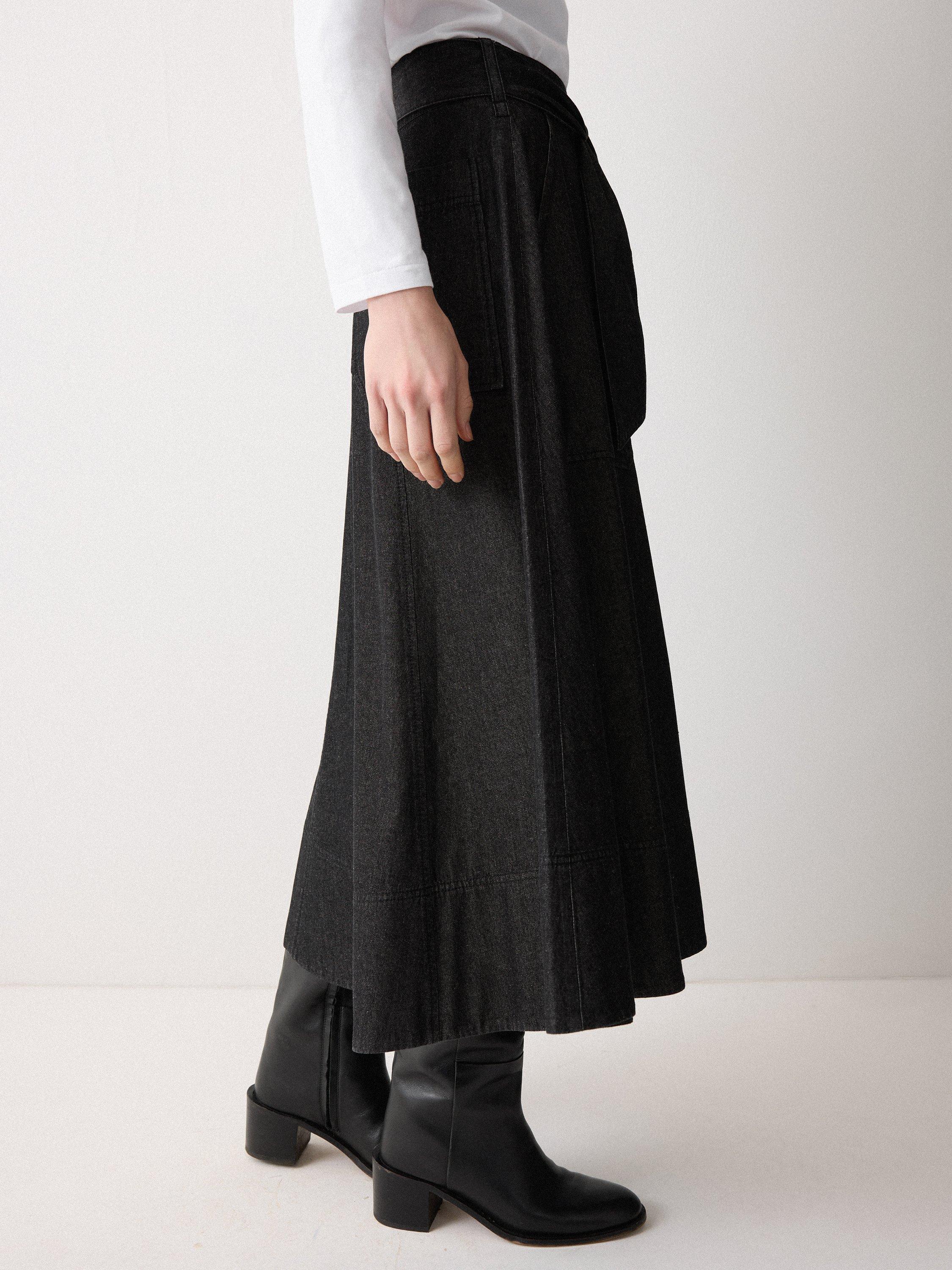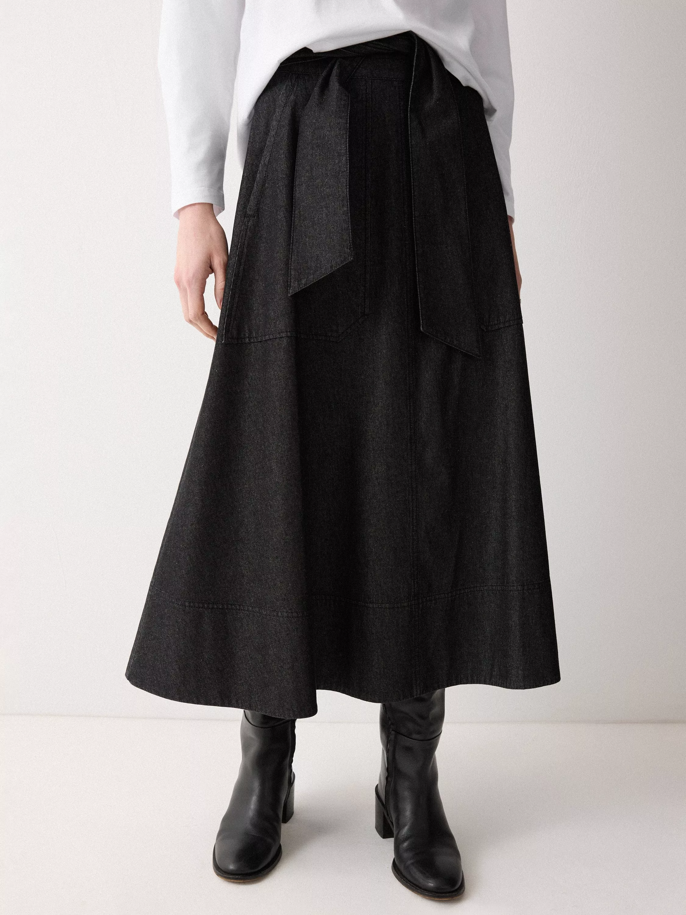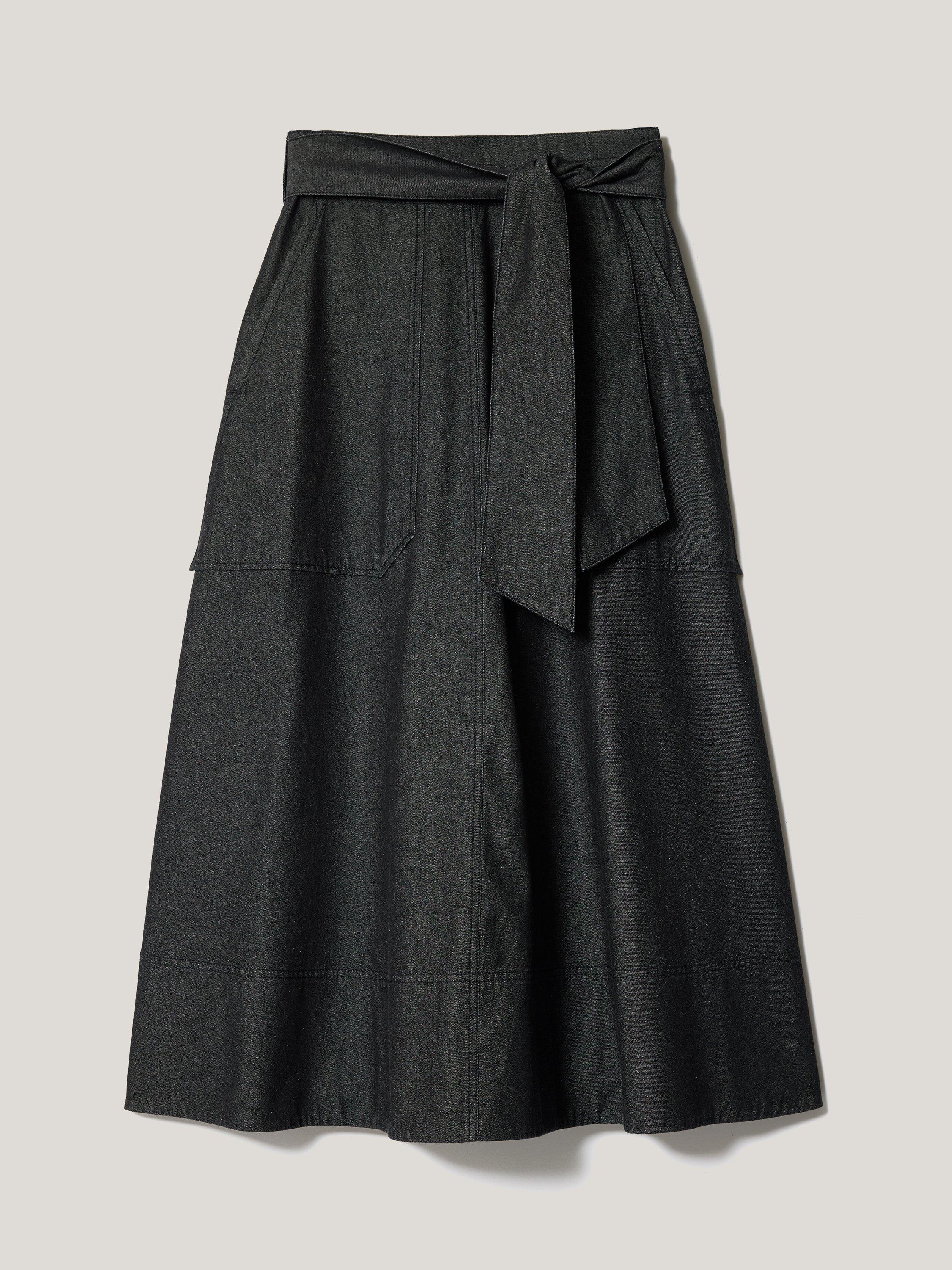 This chambray skirt has a flattering A-line design with a tie belt that sits neatly across the waist, adding extra depth and flair. With deep front pockets and a back patch pocket, pair with a satin blouse or crisp white shirt and statement jewellery.