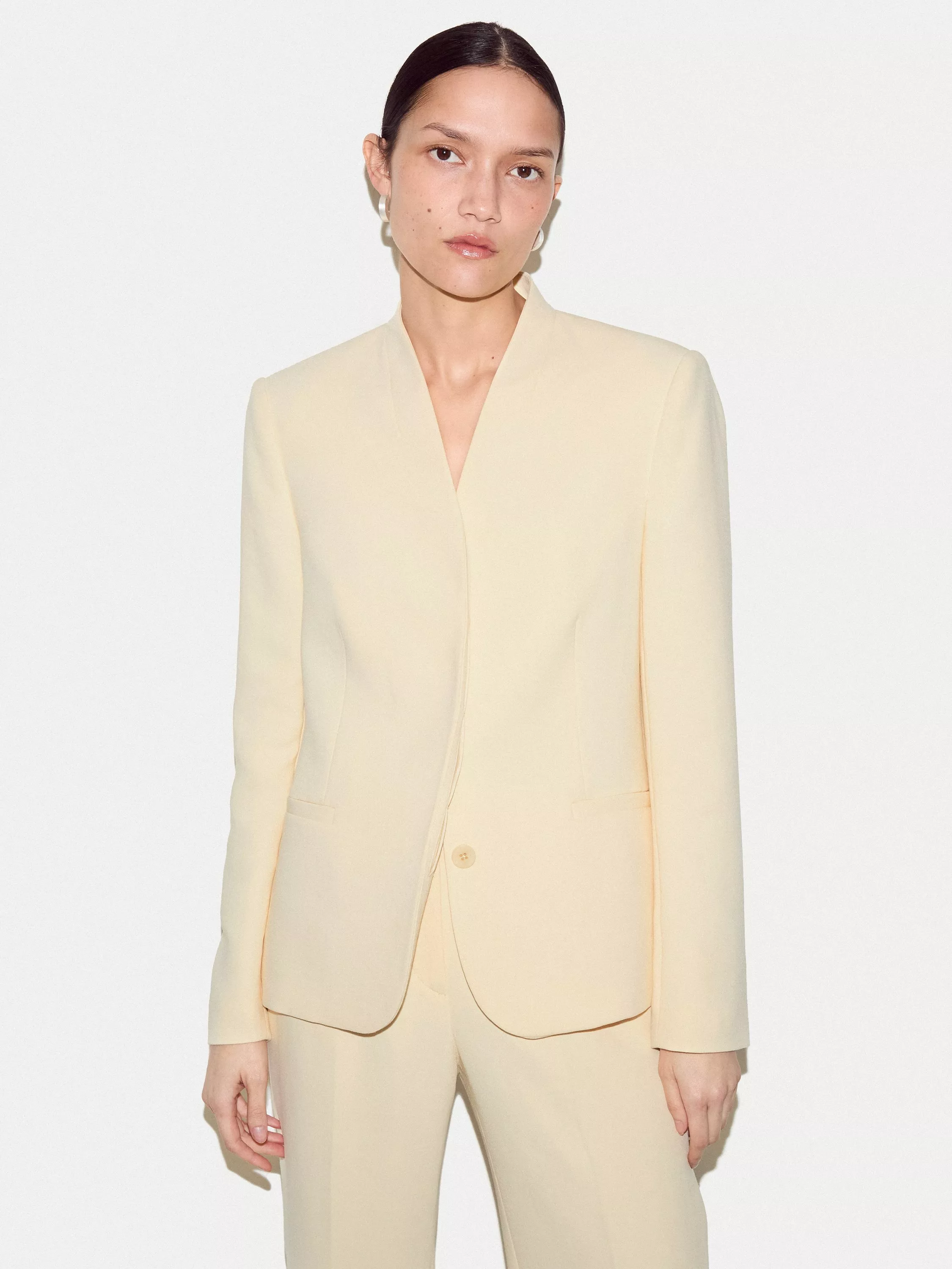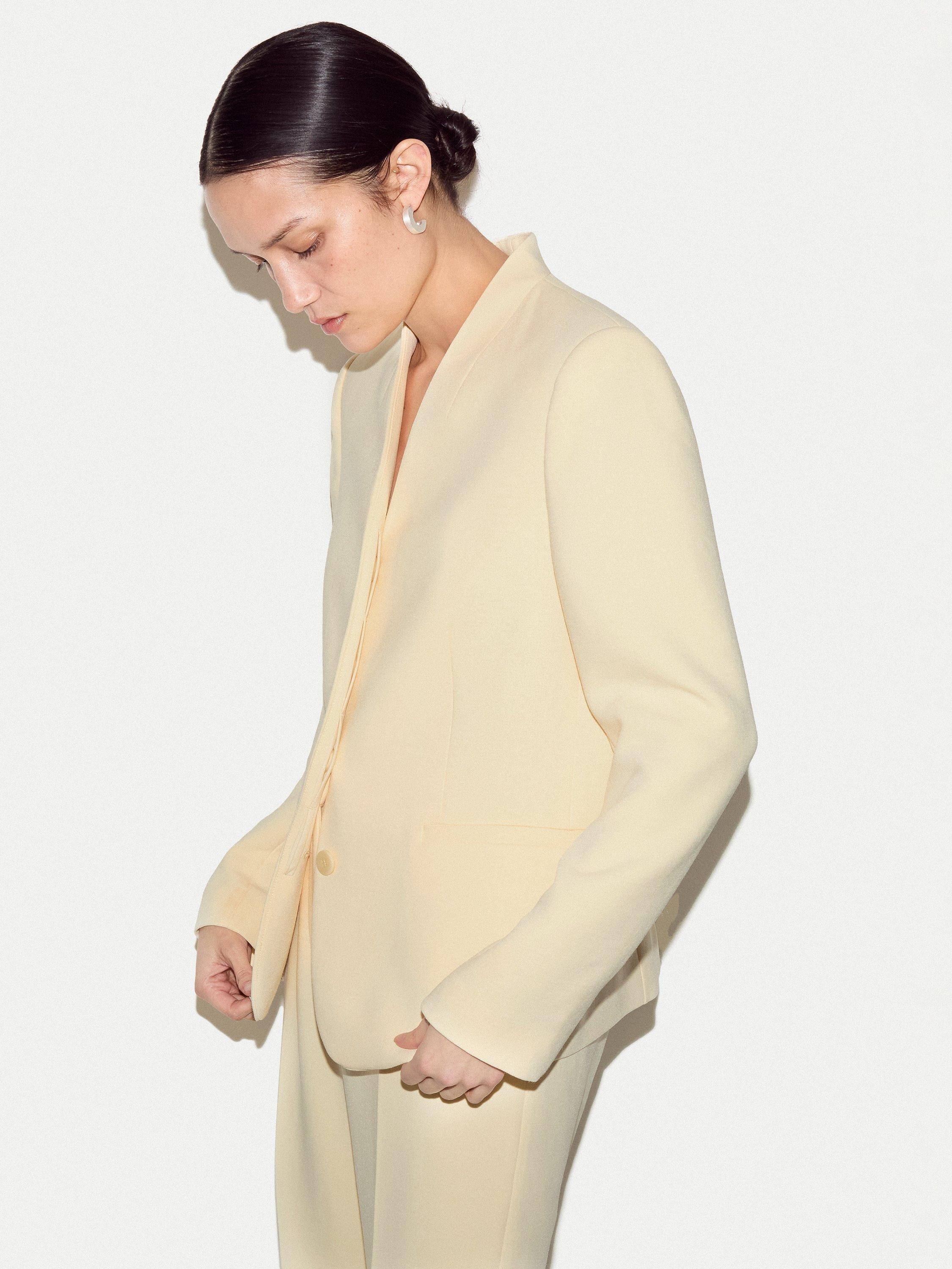 The Corinne Blazer delivers sharp lines with its structured shape collarless design. Its concealed button placket offers a tailored fit, while the premium fabric feels smooth and refined. Wear it with suit trousers for formal days or denim for a polished everyday look.