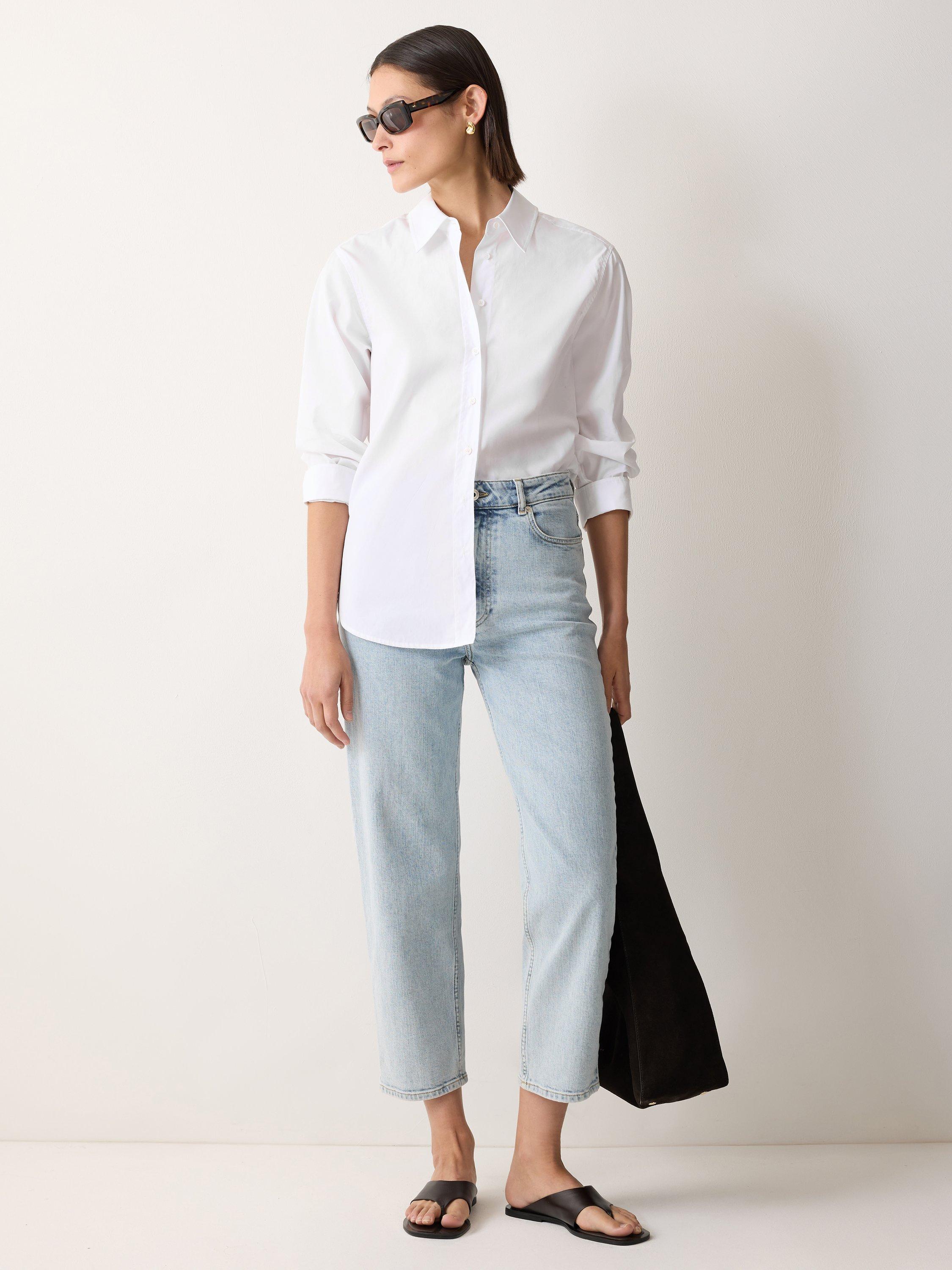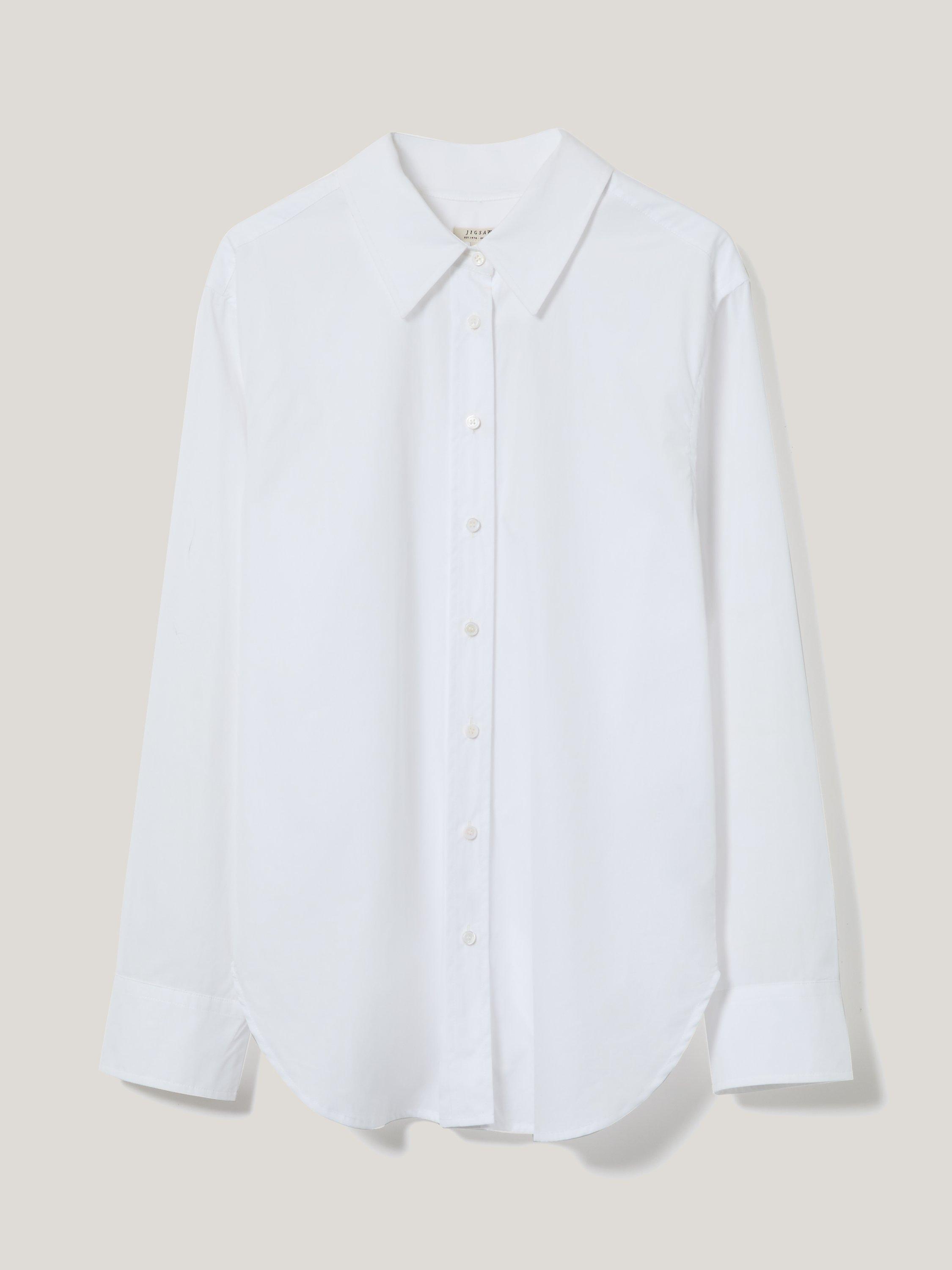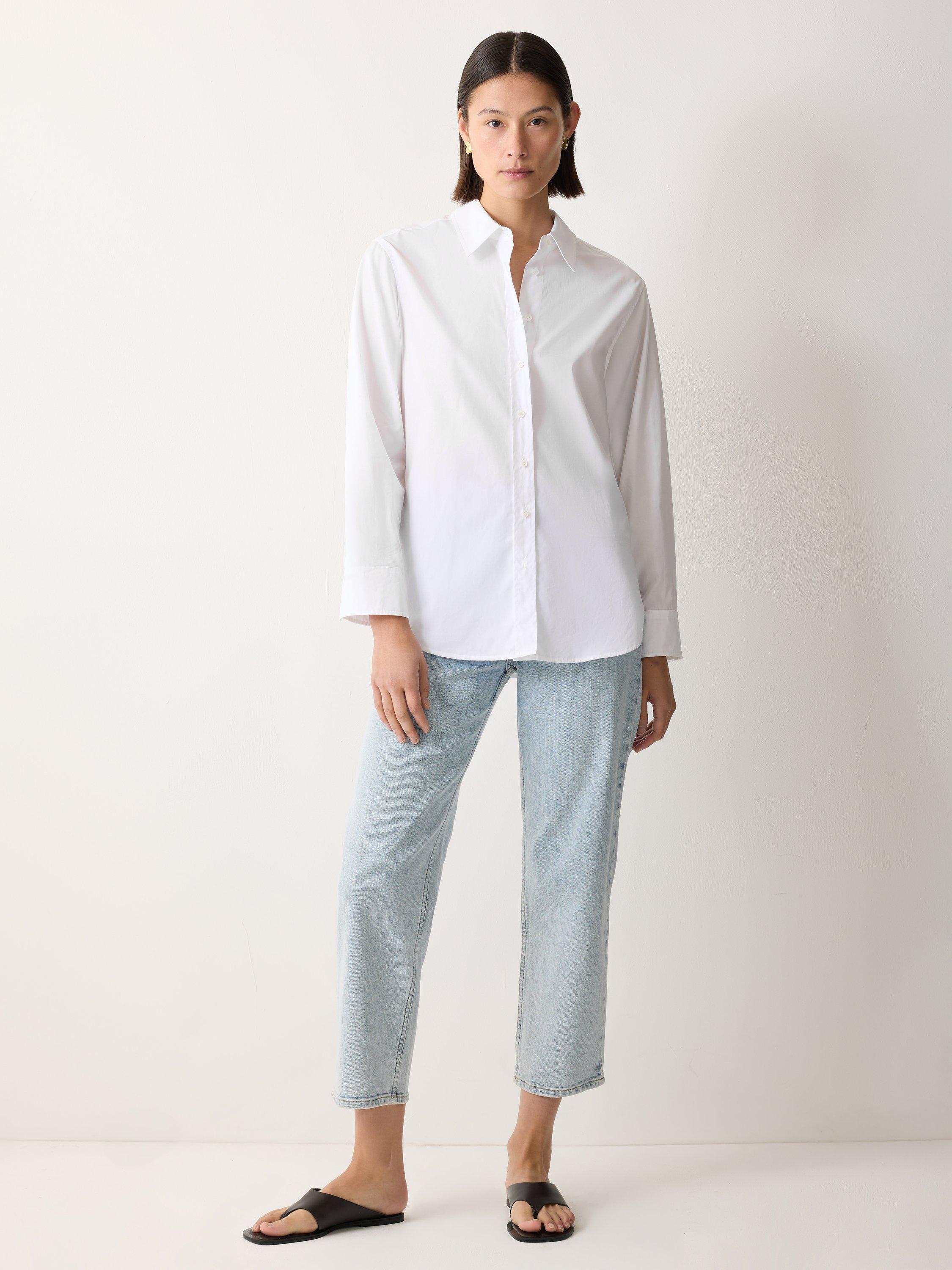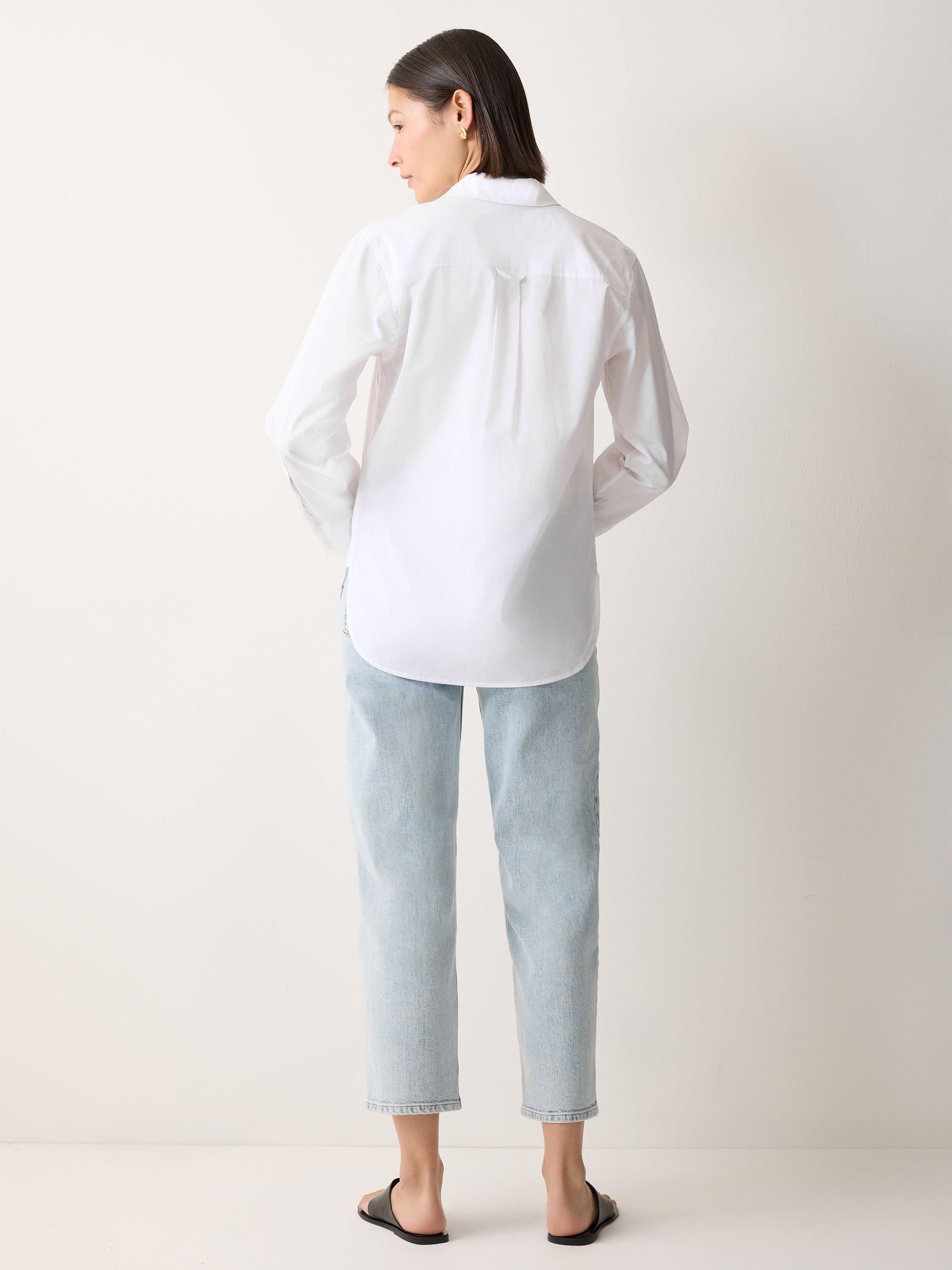 The classic white cotton poplin shirt reigns supreme in the wardrobe. This style is evocative of classic men's styling with side slits, a box pleat and scooped shape hem. Elevated by Mother of Pearl buttons and top stitch details, the oversized silhouette allows for a multitude of looks. Wear it tucked in or untucked, with sleeves rolled up or down.