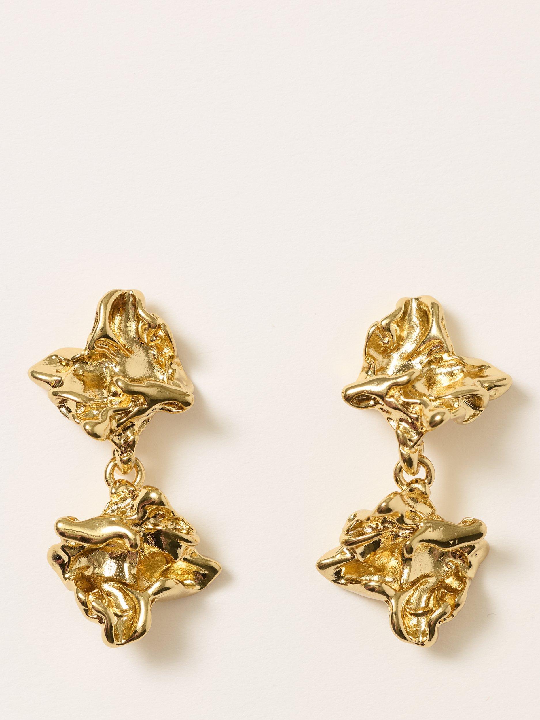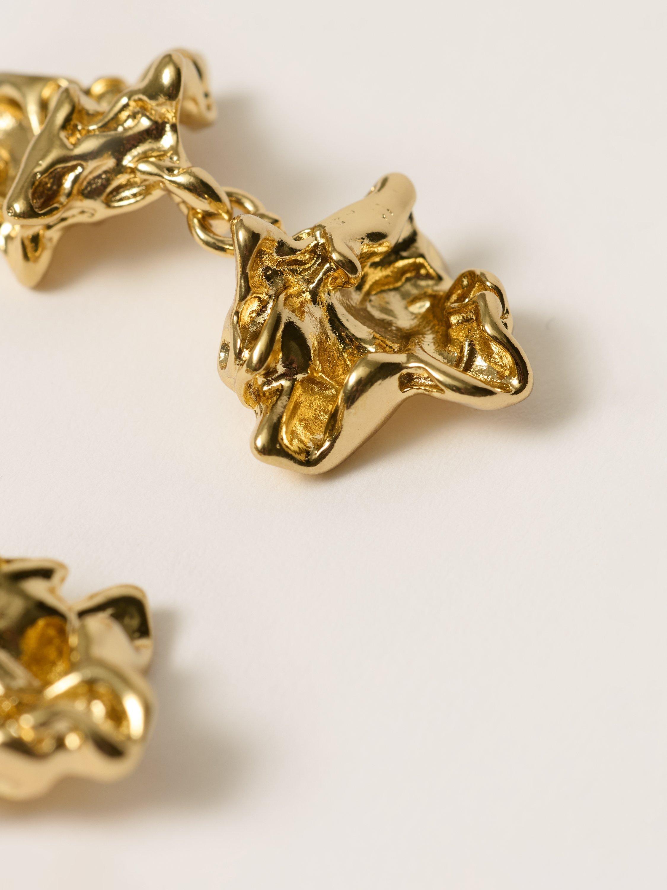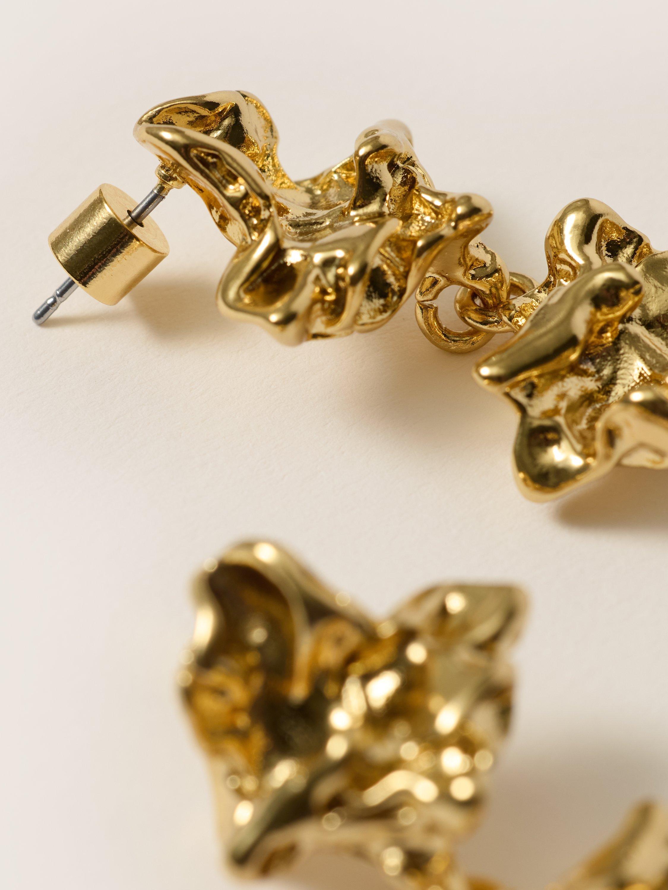 The Crumpled Drop earrings are crafted to look like molten metal. A drop-style earring with a classic push-back fastening. Suitable for pierced ears only.