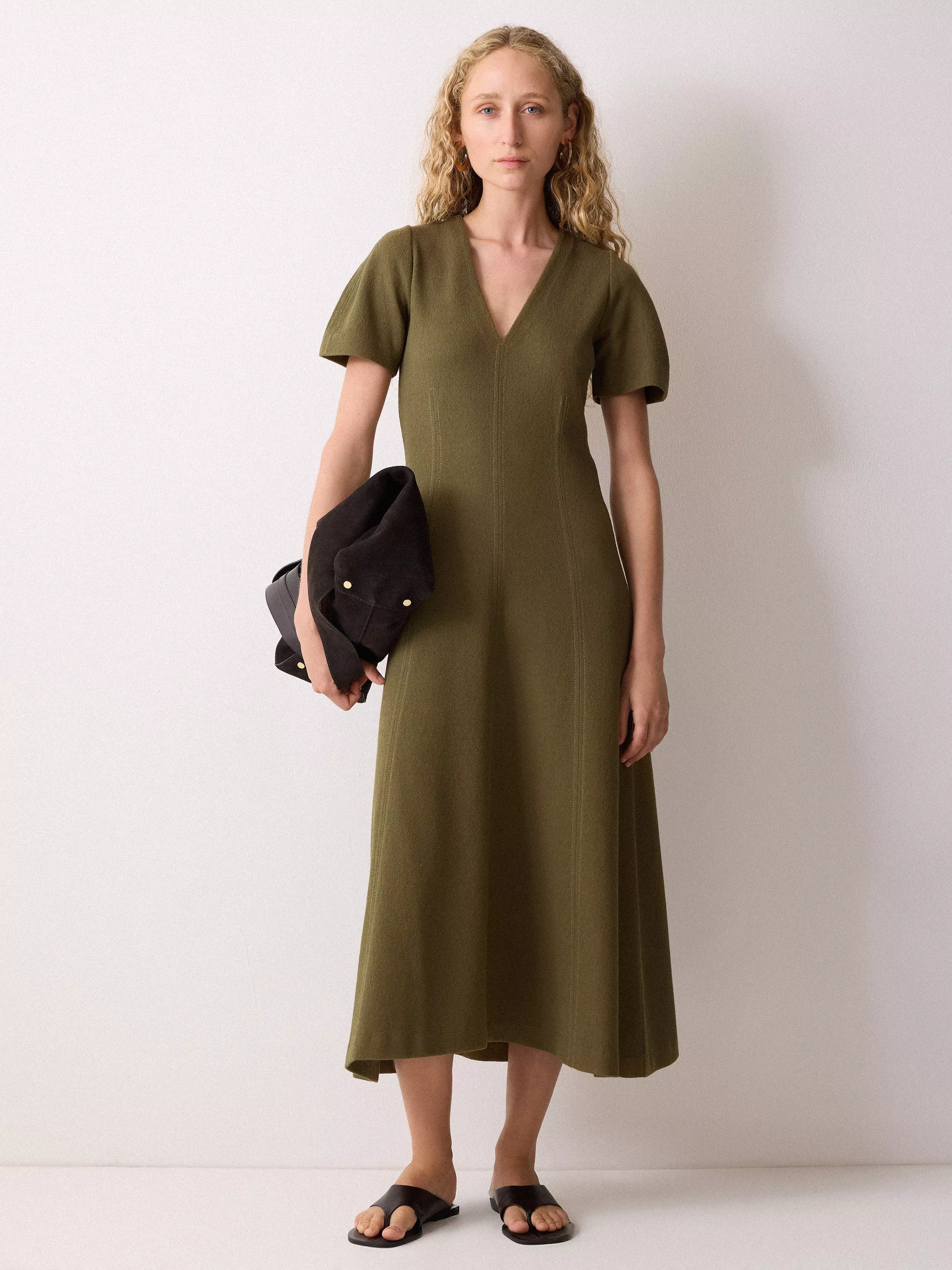 Shape and form come together with this flattering midi dress. Curved sleeves bring structure alongside a fitted bodice with stitch seam detail for lengthening effect.