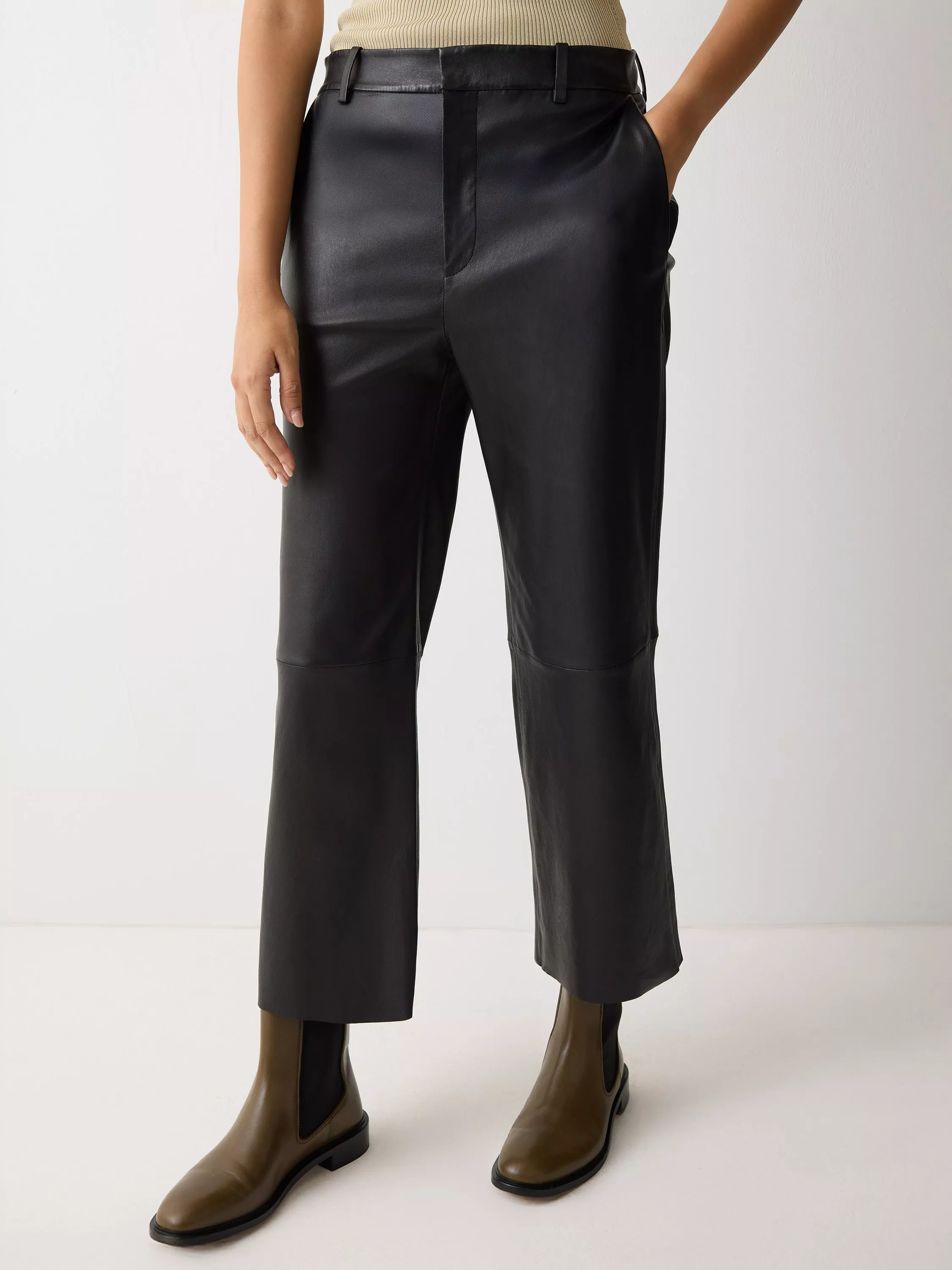 A Jigsaw favourite, the Dale trouser has been reworked in supple, butter-soft leather for a beautiful finish and feel. They offer a wide, straight leg silhouette in a contemporary cropped length; perfect for versatile outfitting. Pair them with slouchy knits and boots, or wear them with a crisp white shirt to contrast colours and textures.