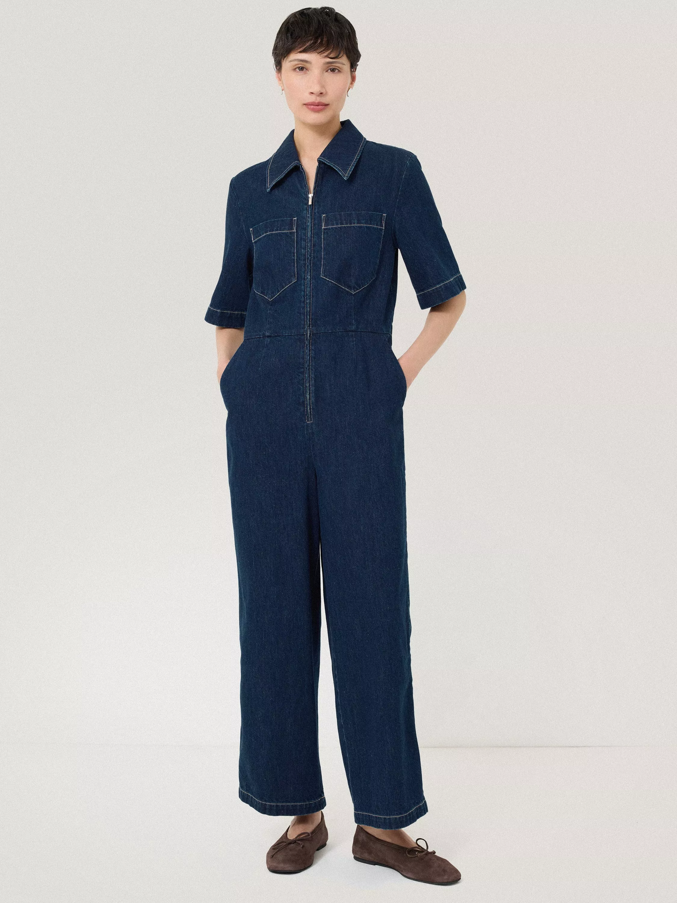 A relaxed silhouette meets summer-perfect denim in the Denim Contrast Stitch Jumpsuit. Embrace easy-going, warm-weather glamour with its straight, ankle-grazing legs, playful contrast stitching and a feature zip fastening at the centre-front.