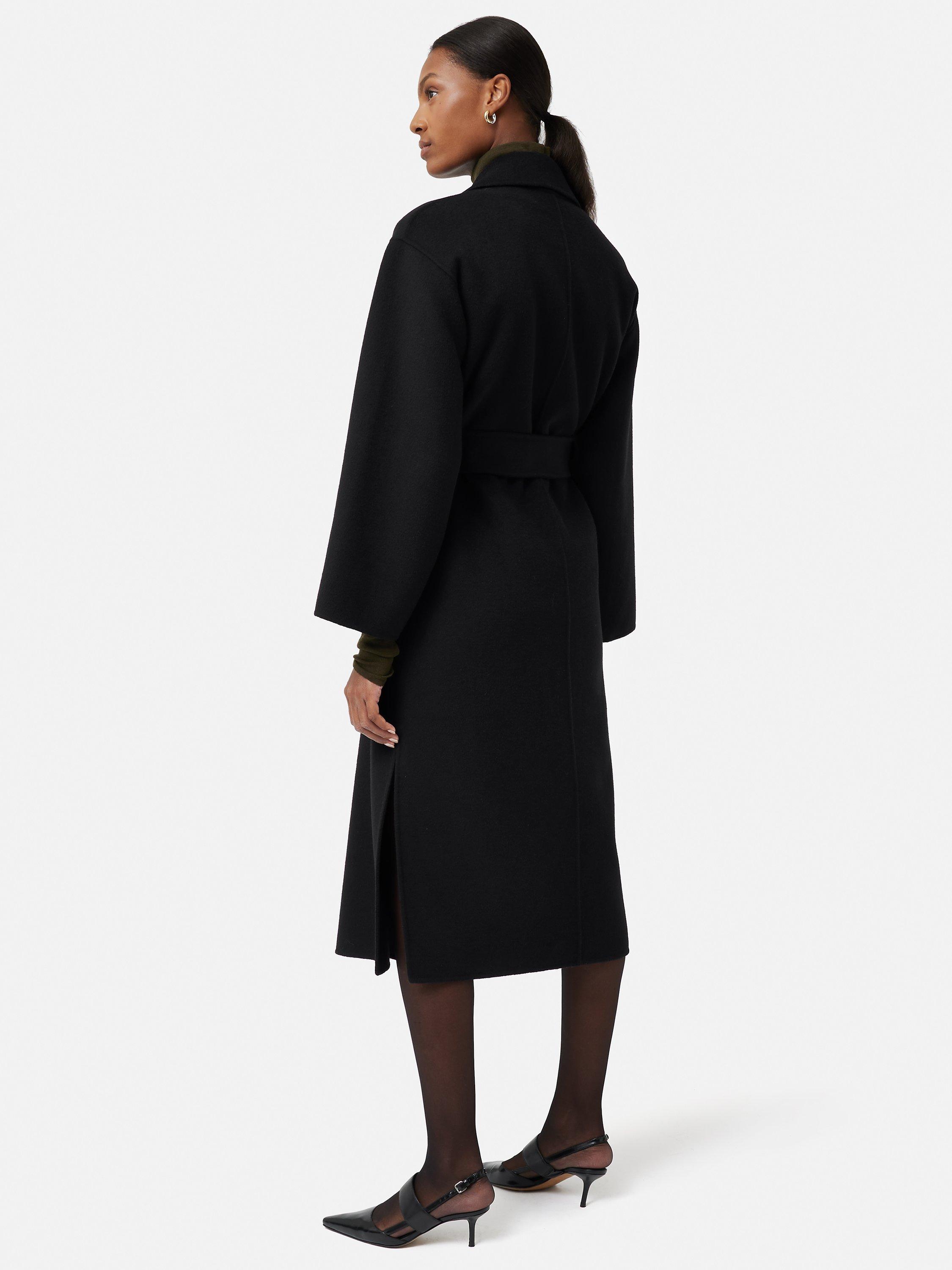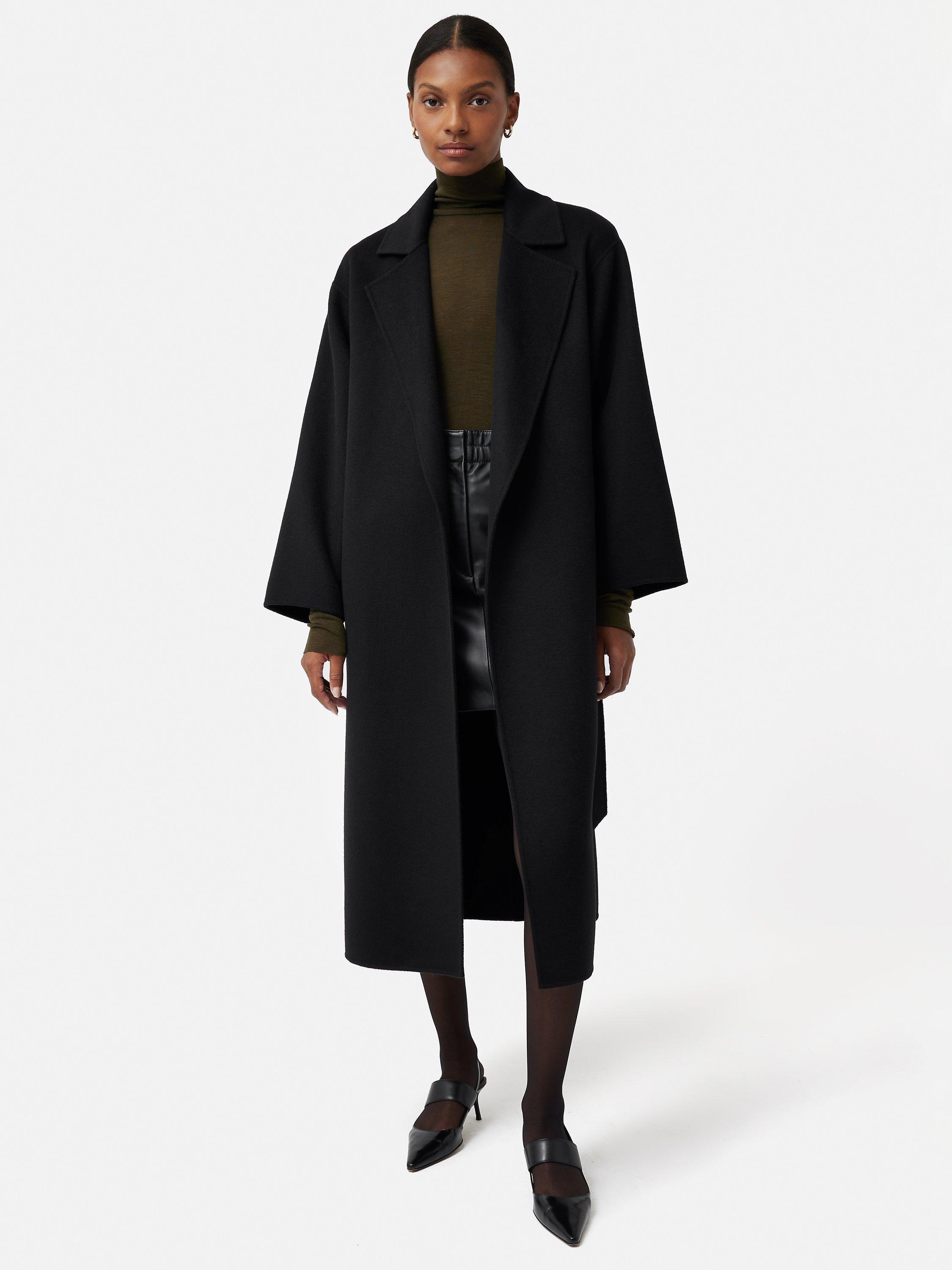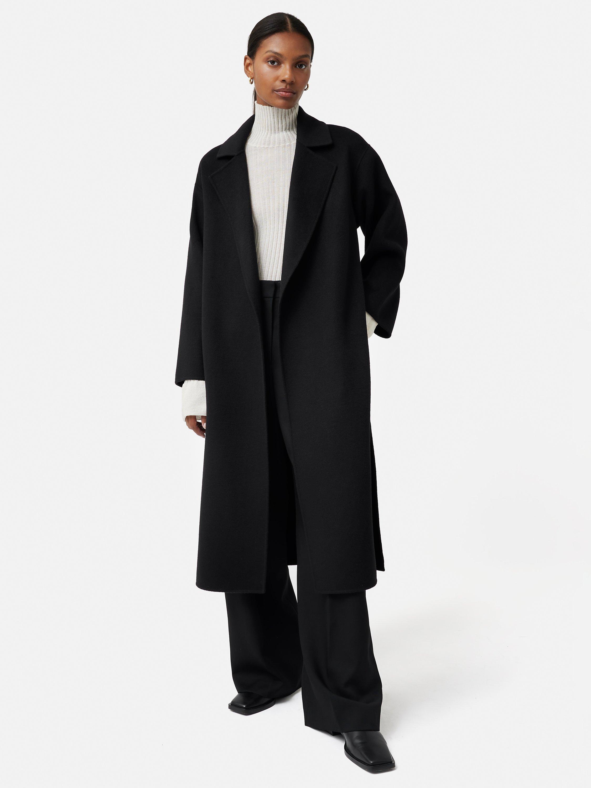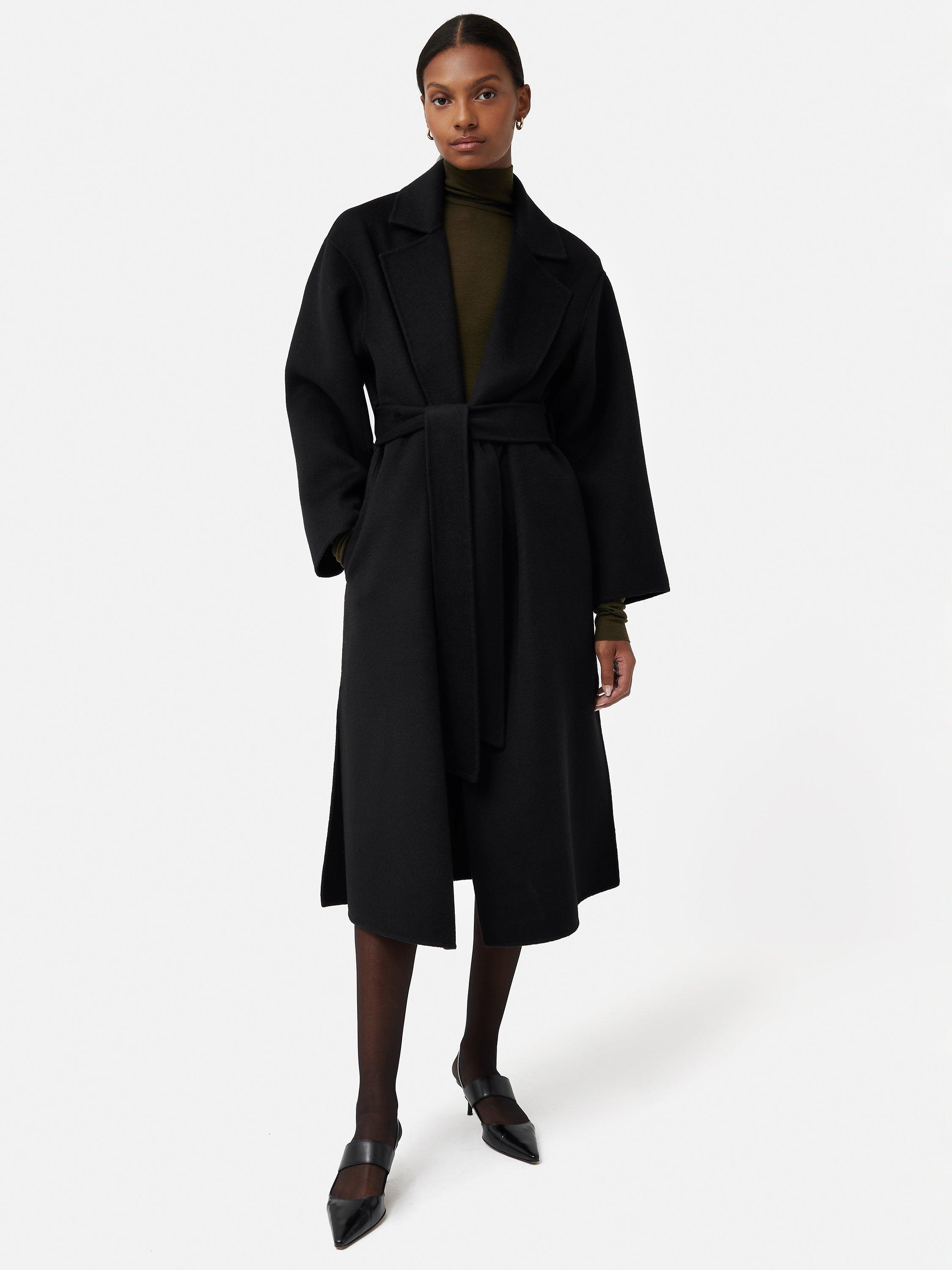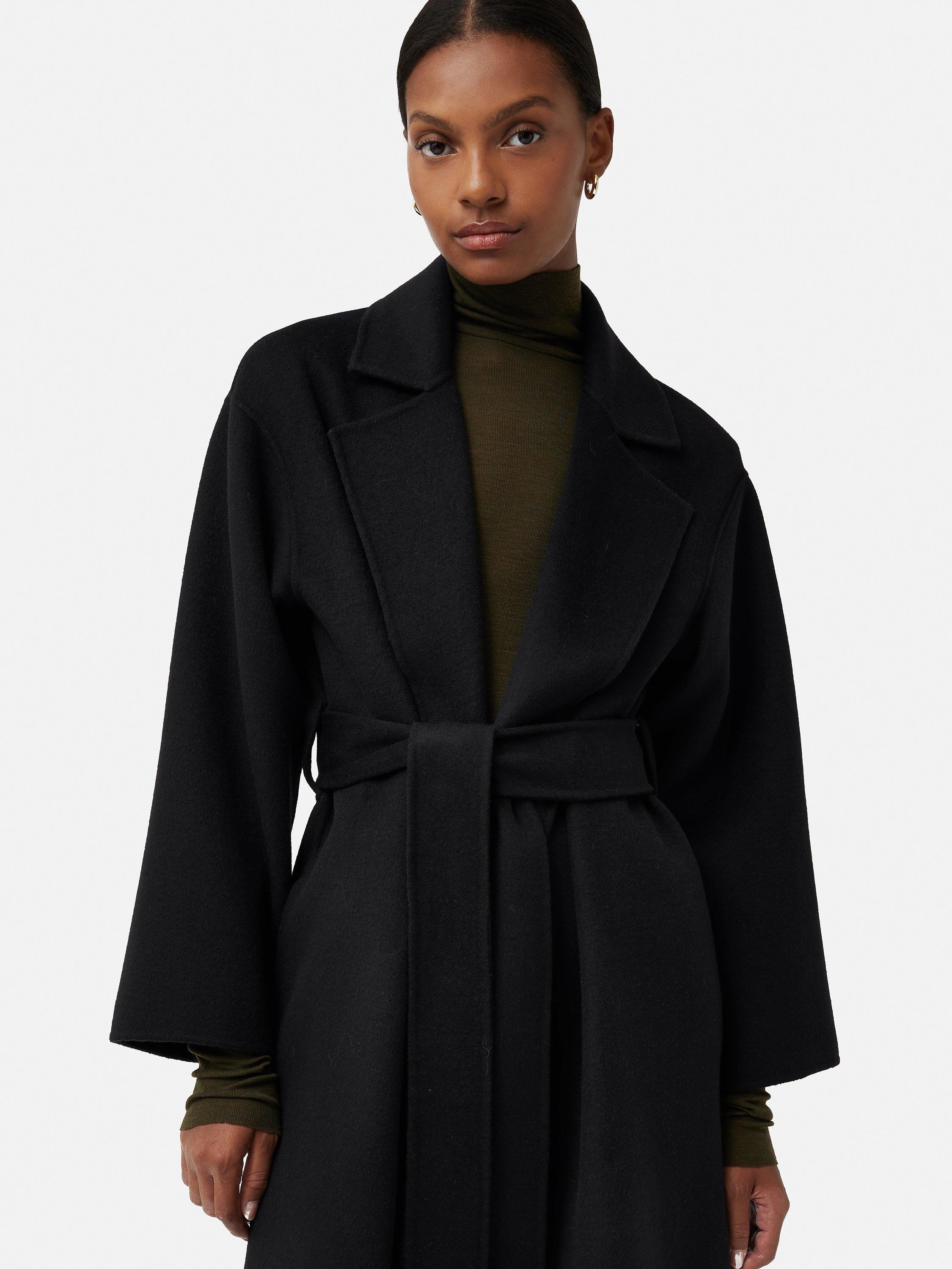 A luxury double faced wool coat with a wraparound belt front. The double-faced style is constructed by sewing two pieces of the same cloth together with invisible internal threads, making it look like one piece. It is a highly technical, time consuming and intricate process.