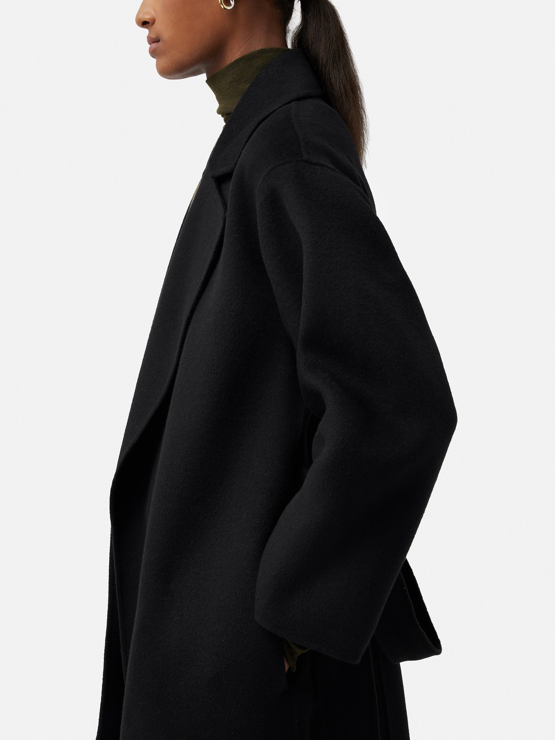 Cut with a longline silhouette, wide notch lapel collar, side pockets and voluminous sleeves to allow this seasons chunky knits to fit underneath. This style is unlined as it is made using an authentic double face construction.