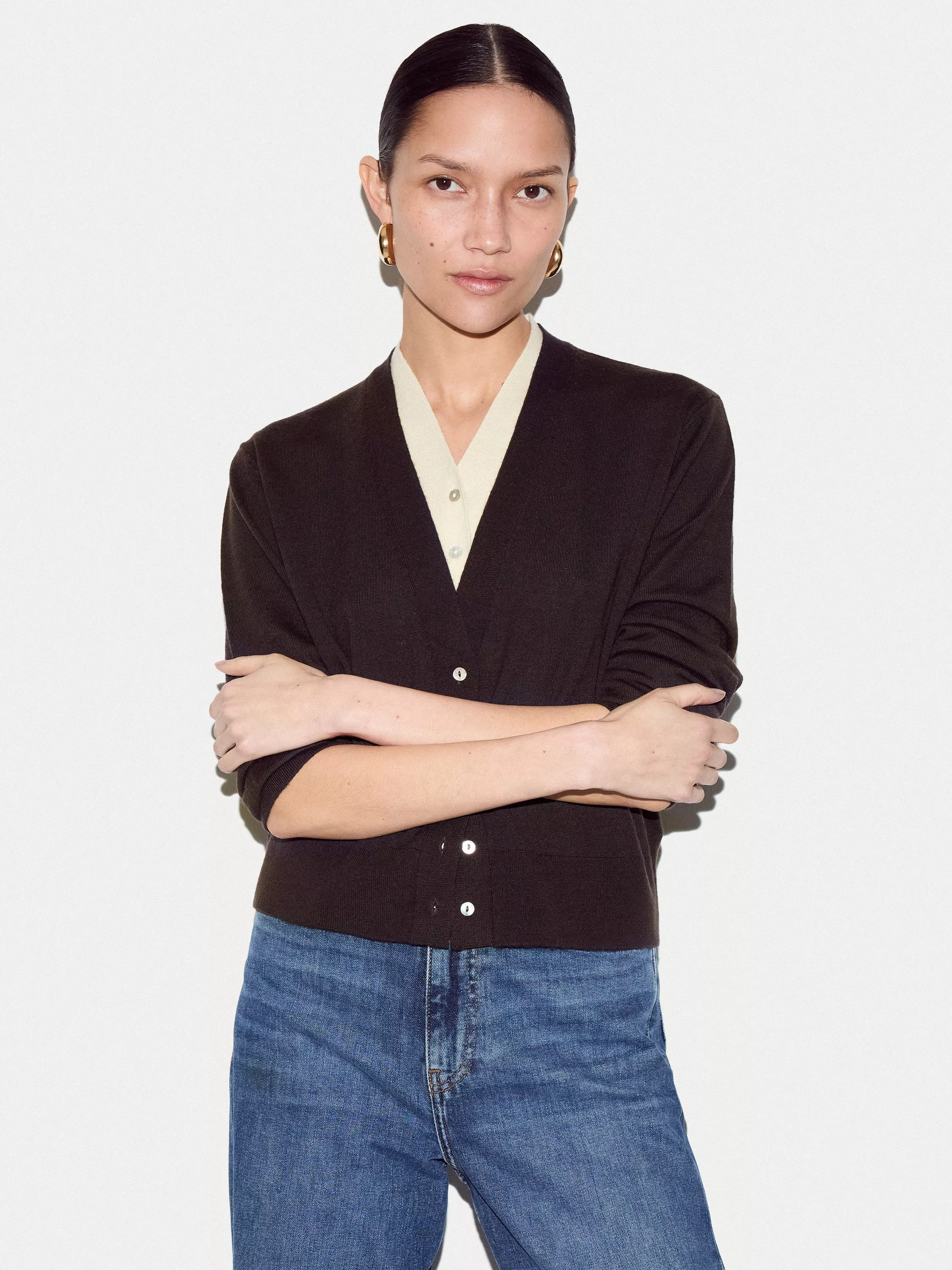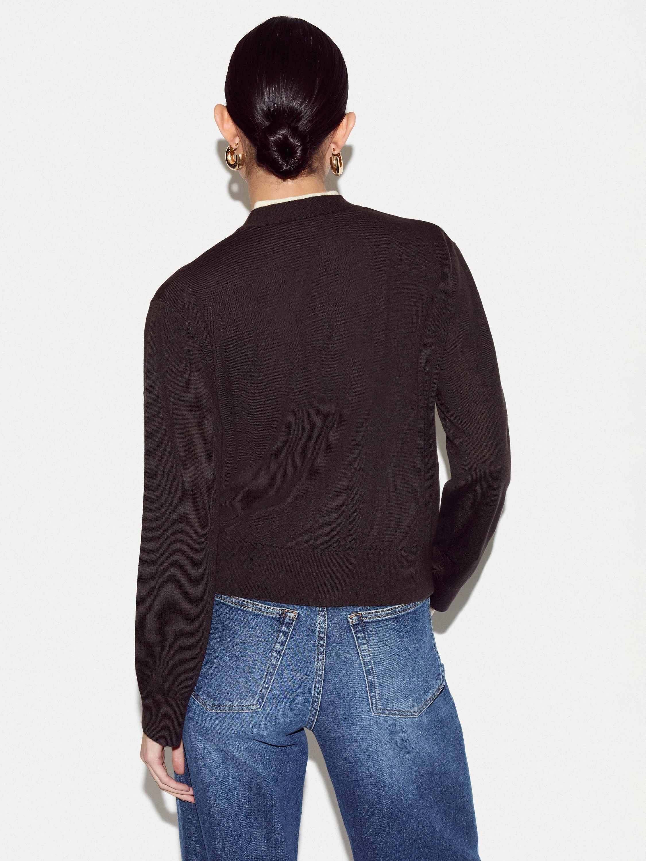 A sophisticated layering piece, this merino wool cardigan features a double-layer design for added warmth and texture. The clean lines and V neck finish make it a versatile addition to your wardrobe.