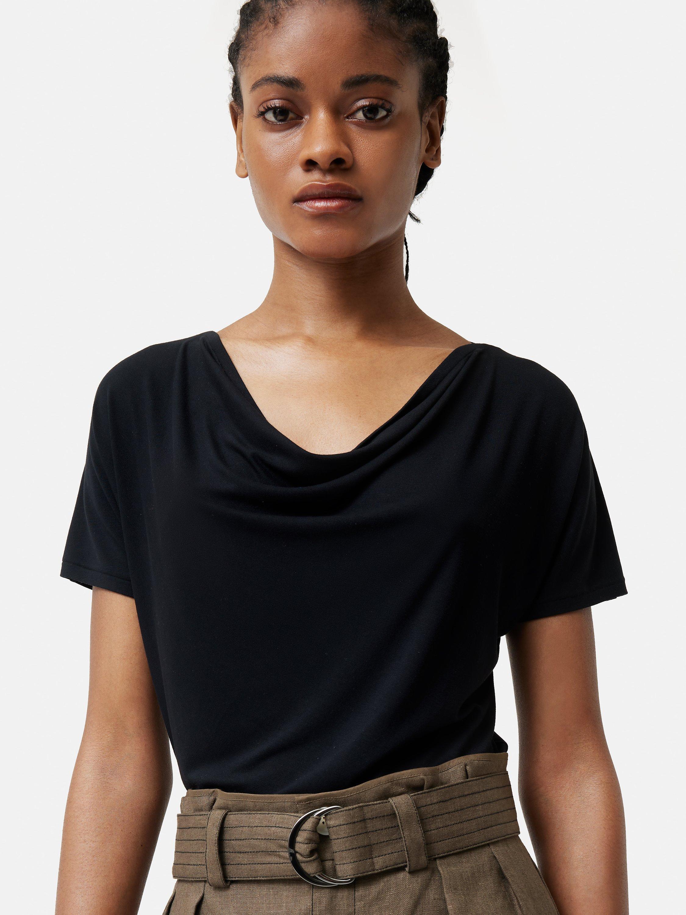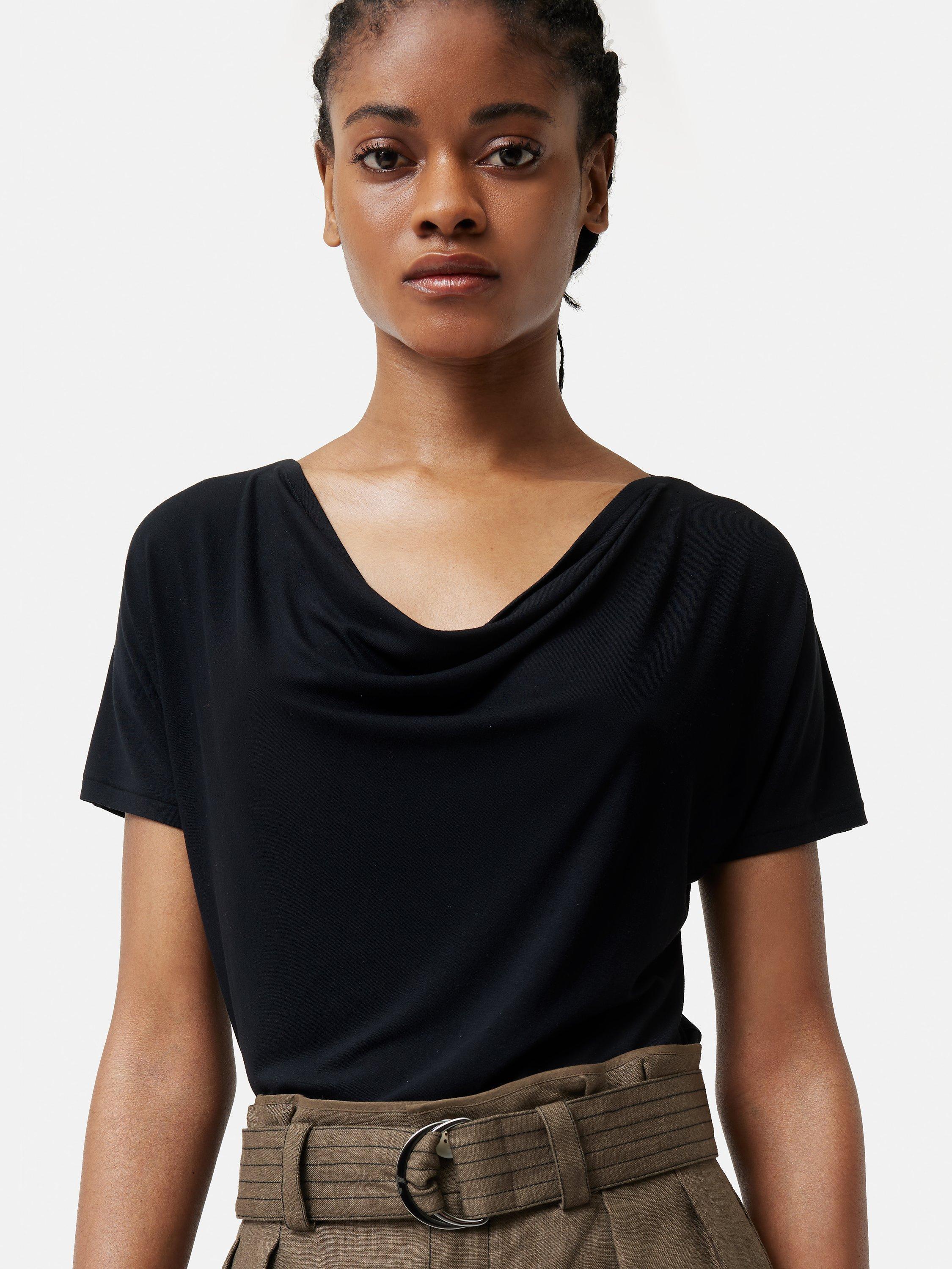 With its sweeped cowl neckline and short sleeves, it is made with light yet robust blended fabric for longevity of wear.