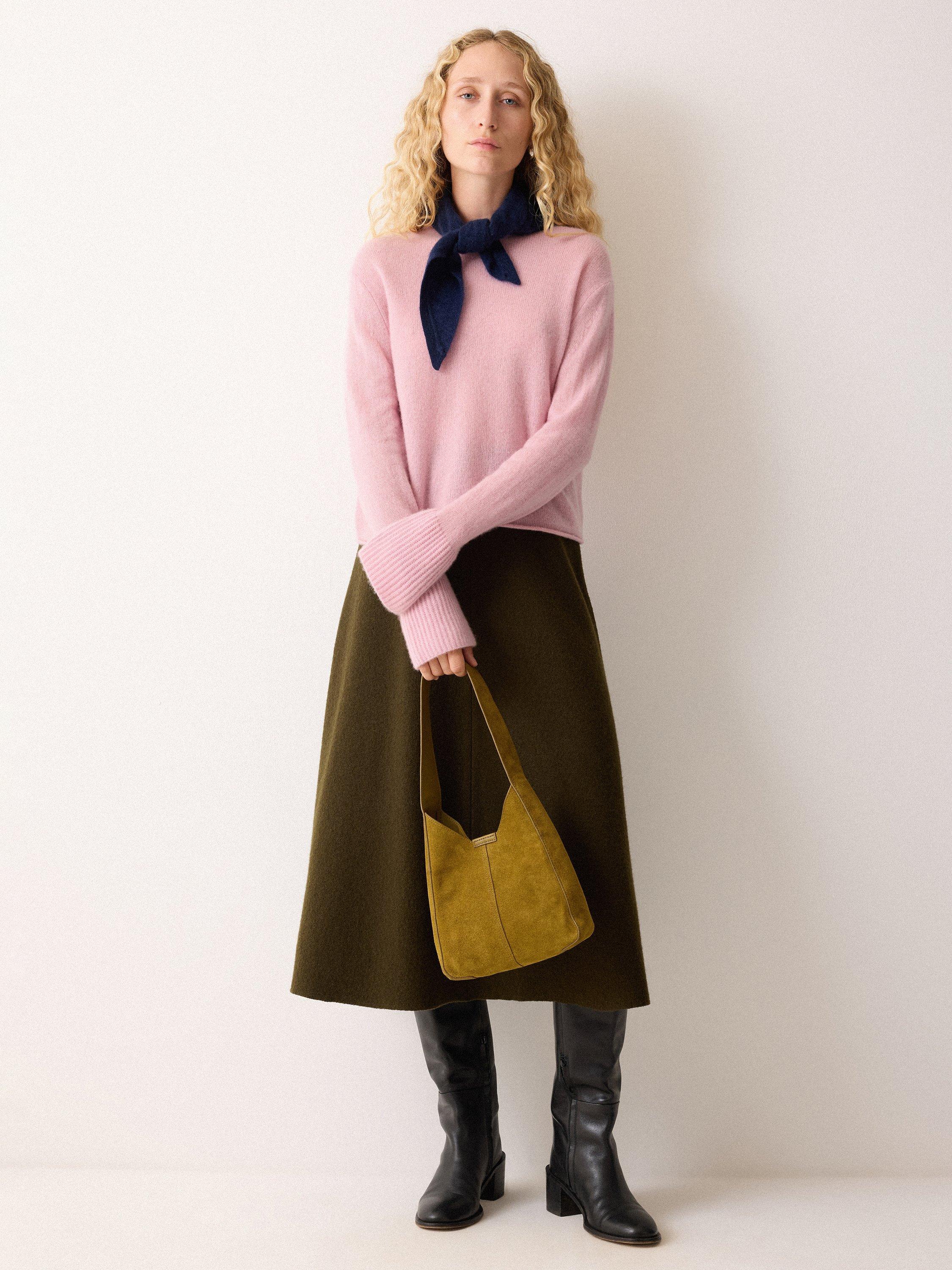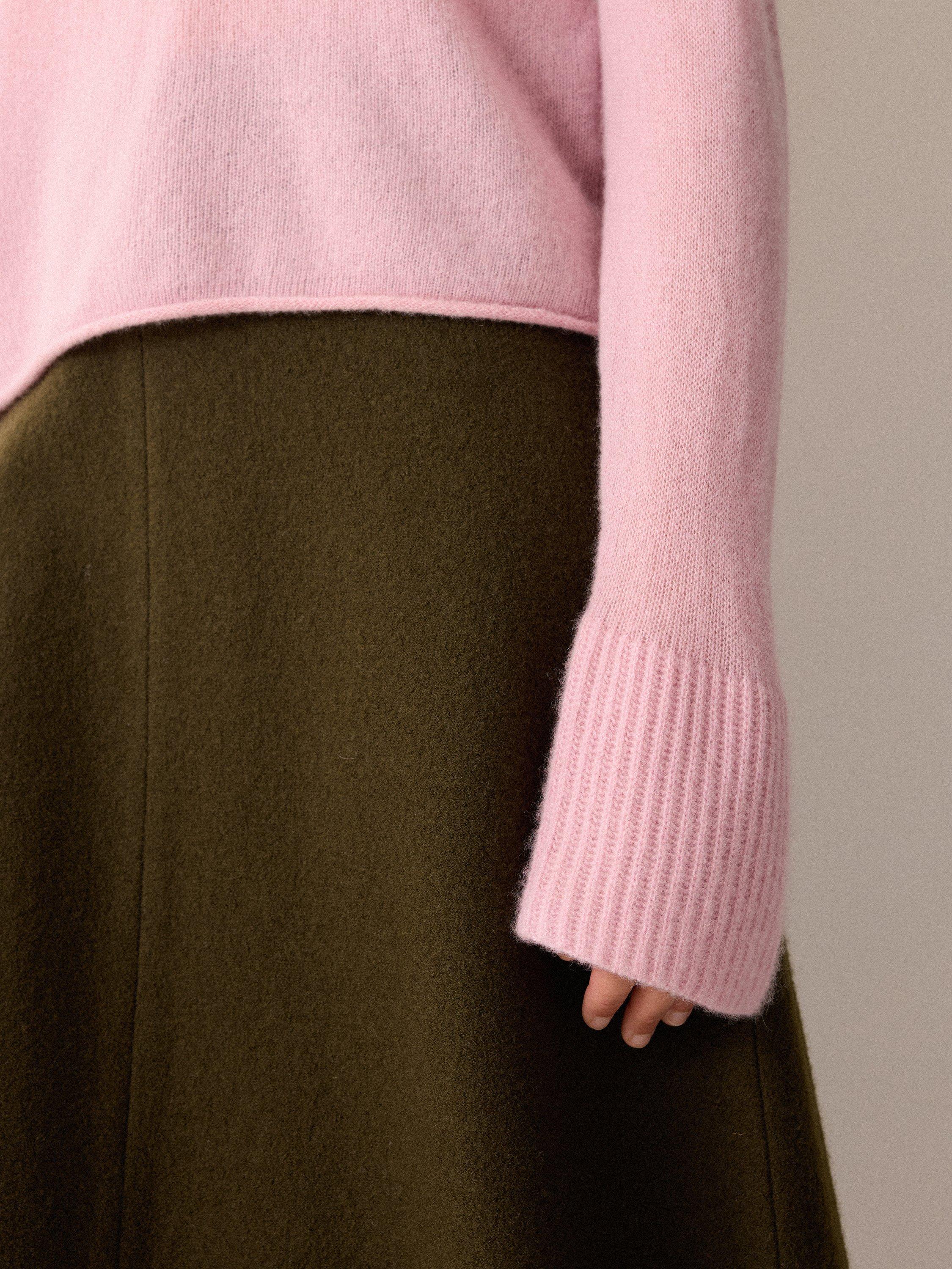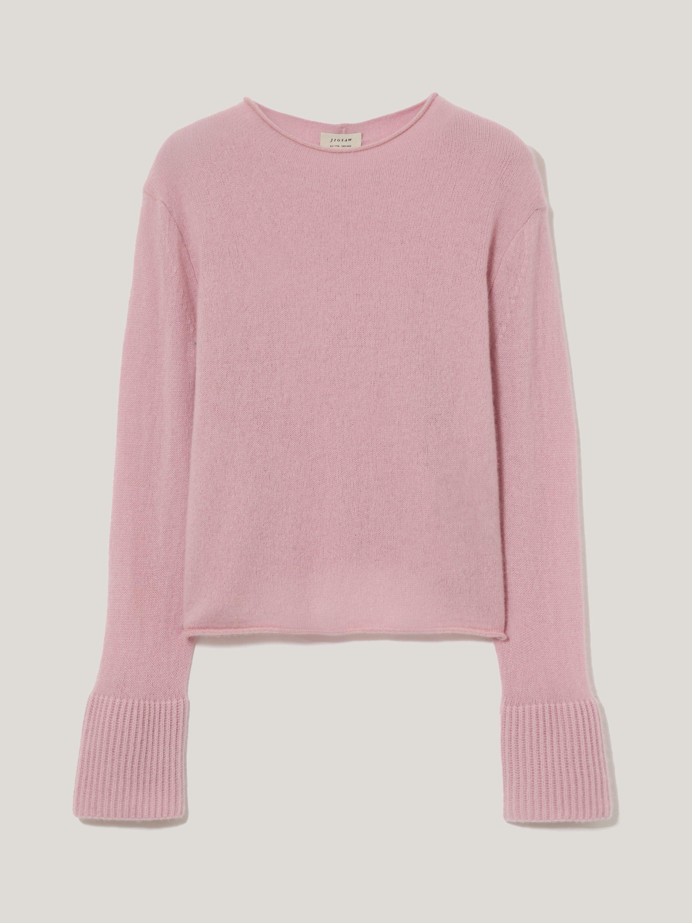 The Eldon jumper returns for another season. Loved for its ultra-feminine silhouette with a minimal rolled neckline and fluted cuffs, this wardrobe signature highlights the sumptuous, lofty feel of Cloud cashmere, which has been knitted off gauge. The perfect transitional layer for autumn and beyond.