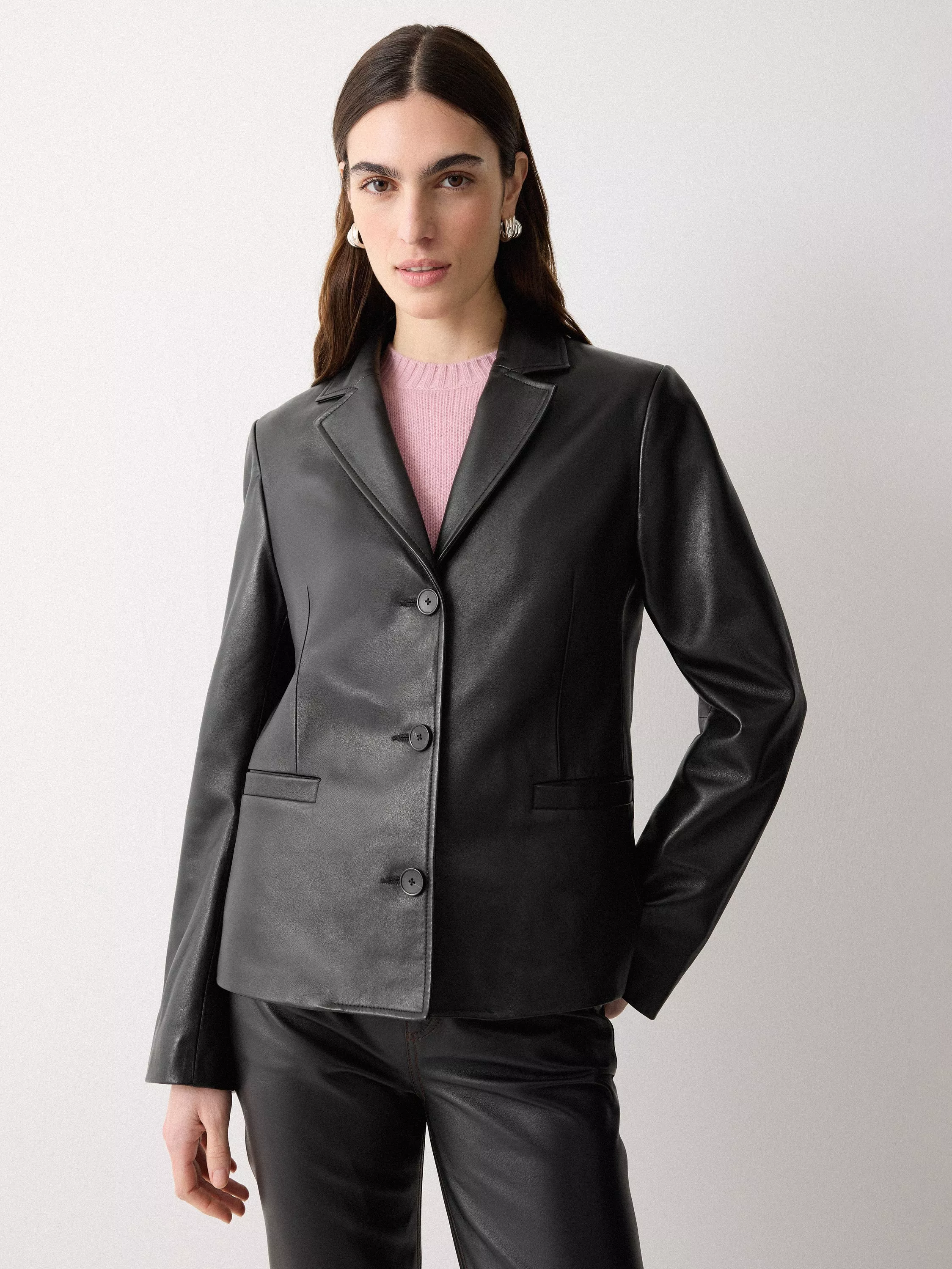 Crafted from smooth Nappa leather, the Ellis Blazer is a smarter take on the classic leather jacket. Nappa leather is well known for its buttery softness and durability, allowing for better drape across the shoulders and body. Wear it over work dresses or weekend knits alike, or pair it with leather trousers for a cohesive feel.