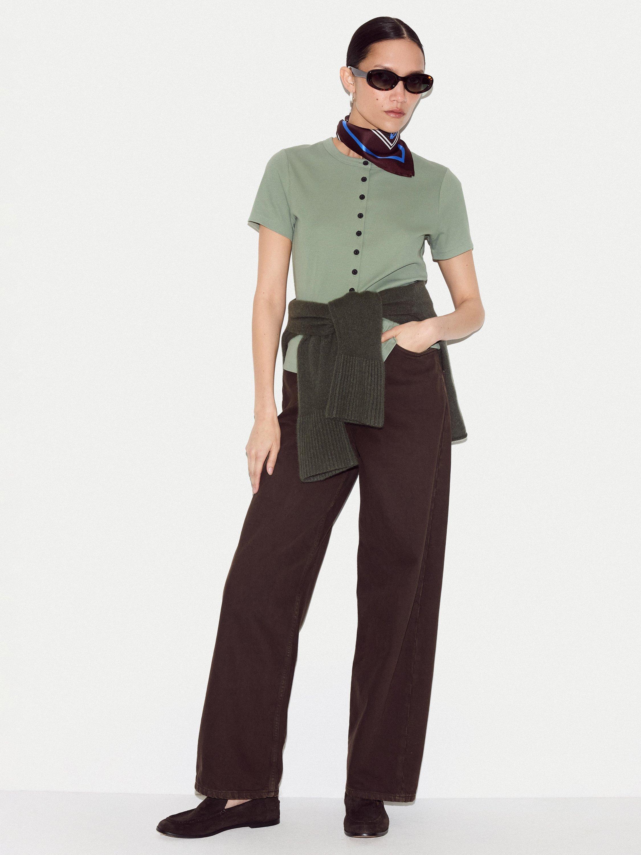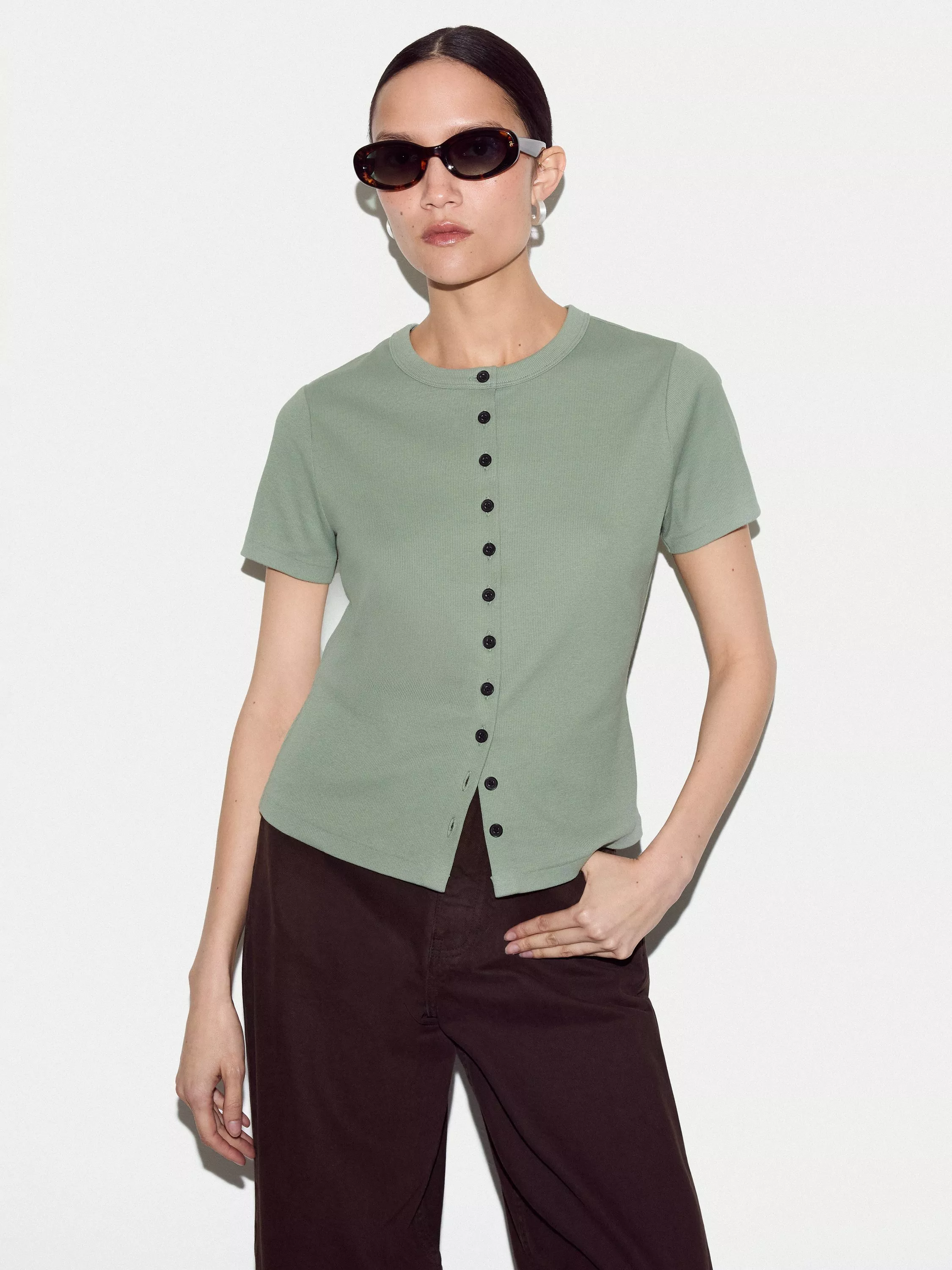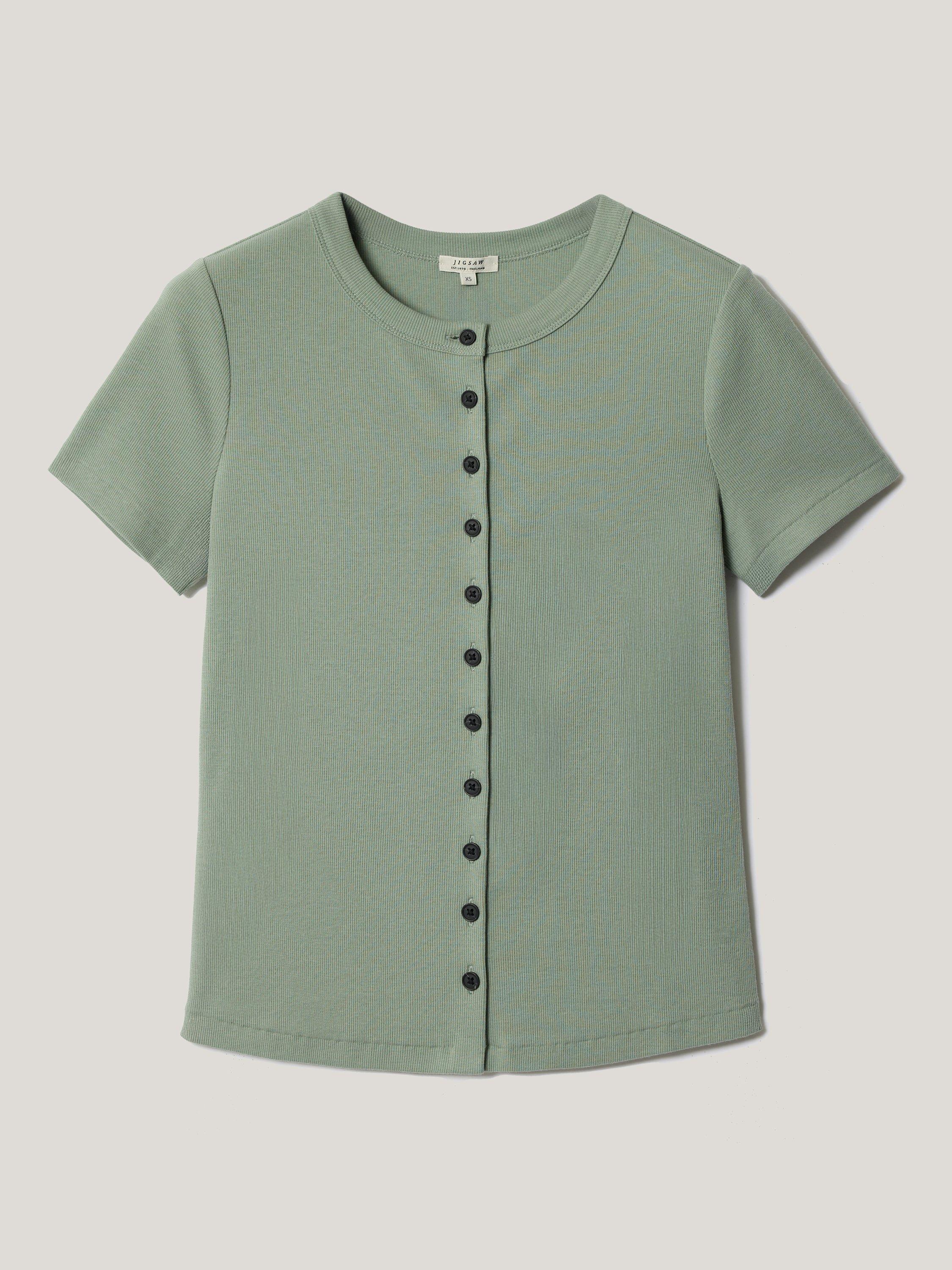 This fine ribbed tee features delicate button detailing, adding a touch of charm to your everyday basics. The stretchy cotton construction ensures comfort, whether worn solo or layered under knits.