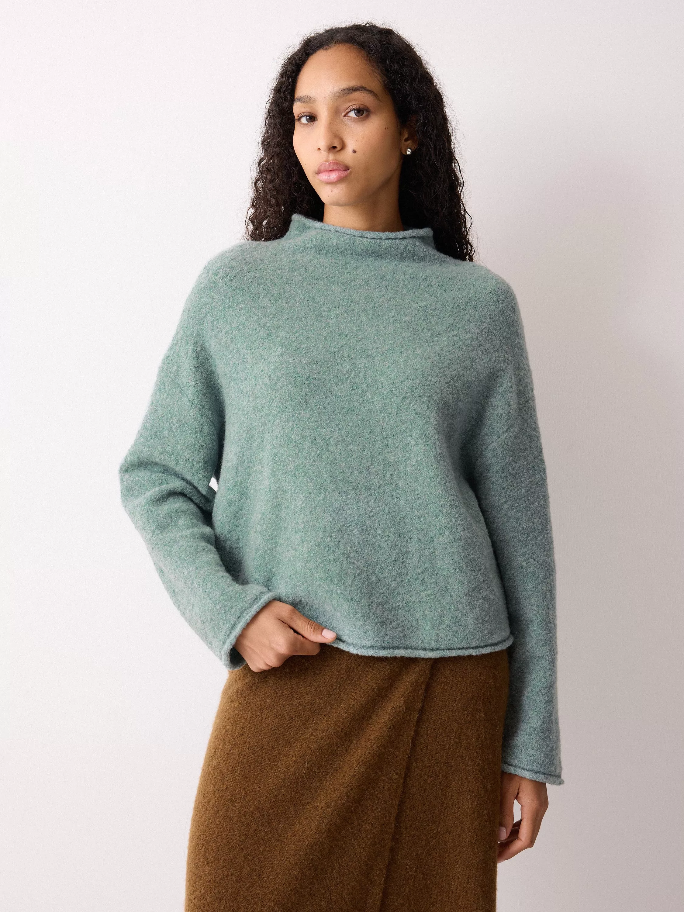Rolled trims and a cropped fit put a contemporary spin on a practical cold-weather classic. Designed for pairing with high-waisted denim and trousers, this jumper boasts a fuzzy, super soft texture that blends wool and comfort stretch into a tactile finish.