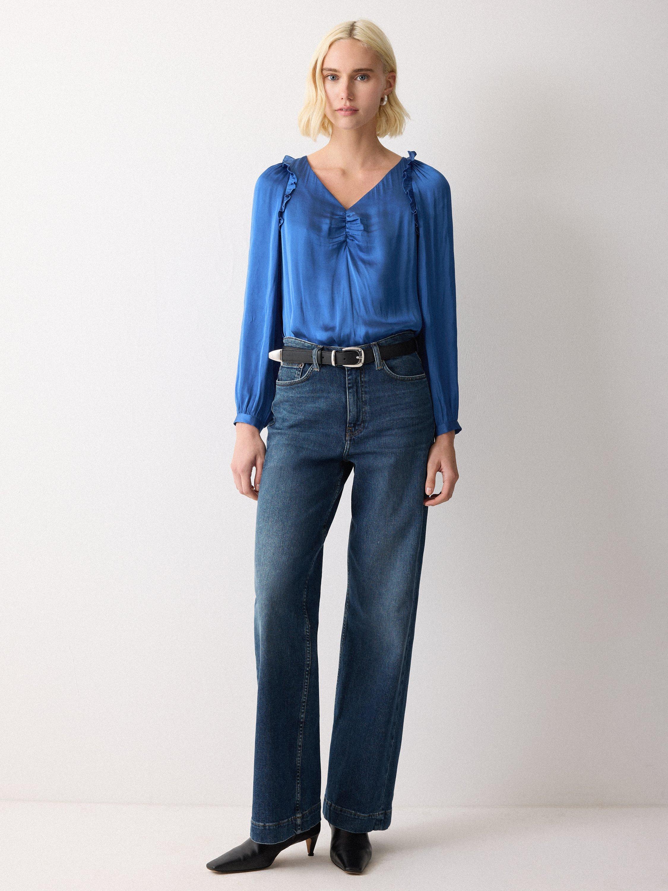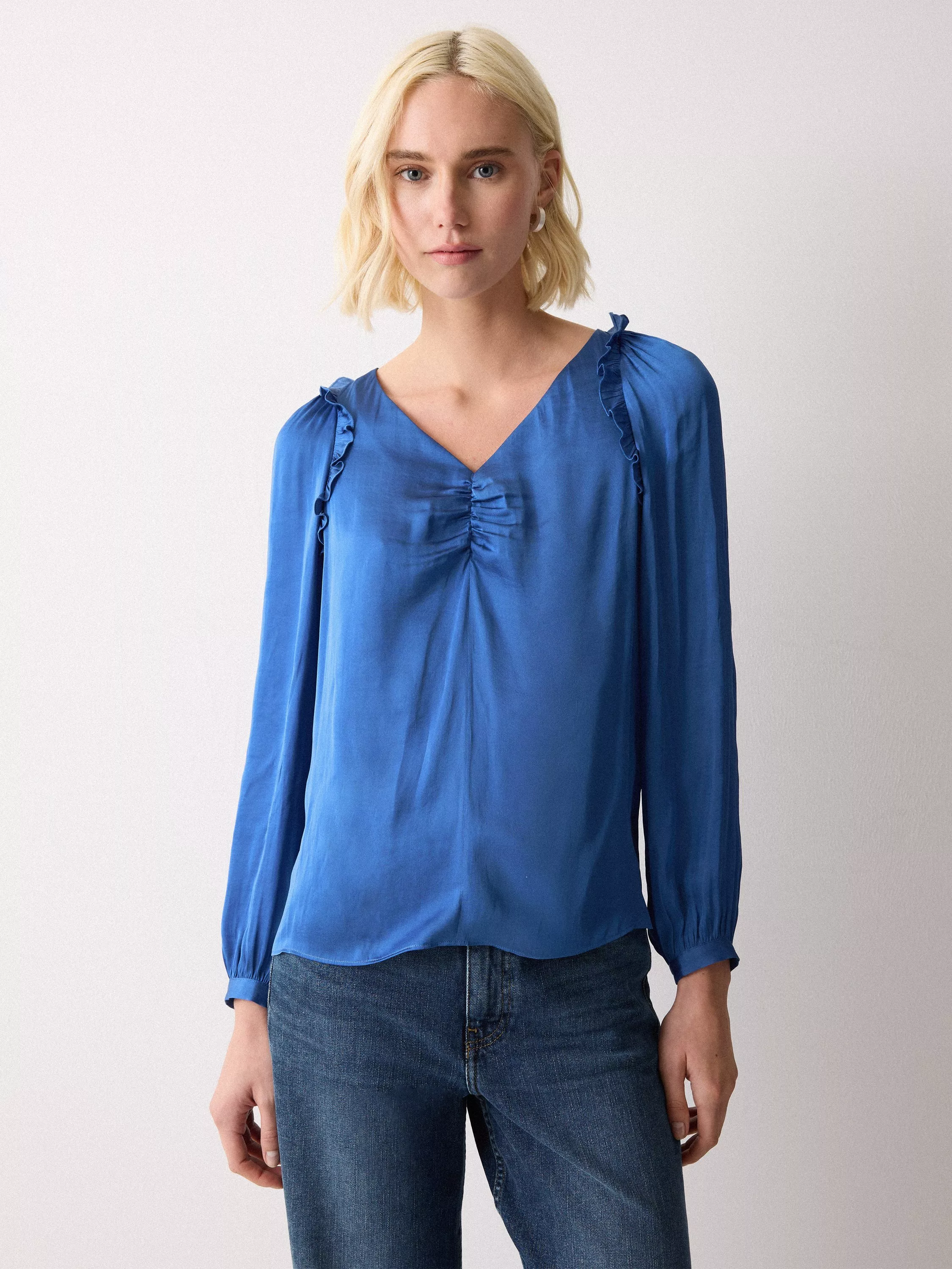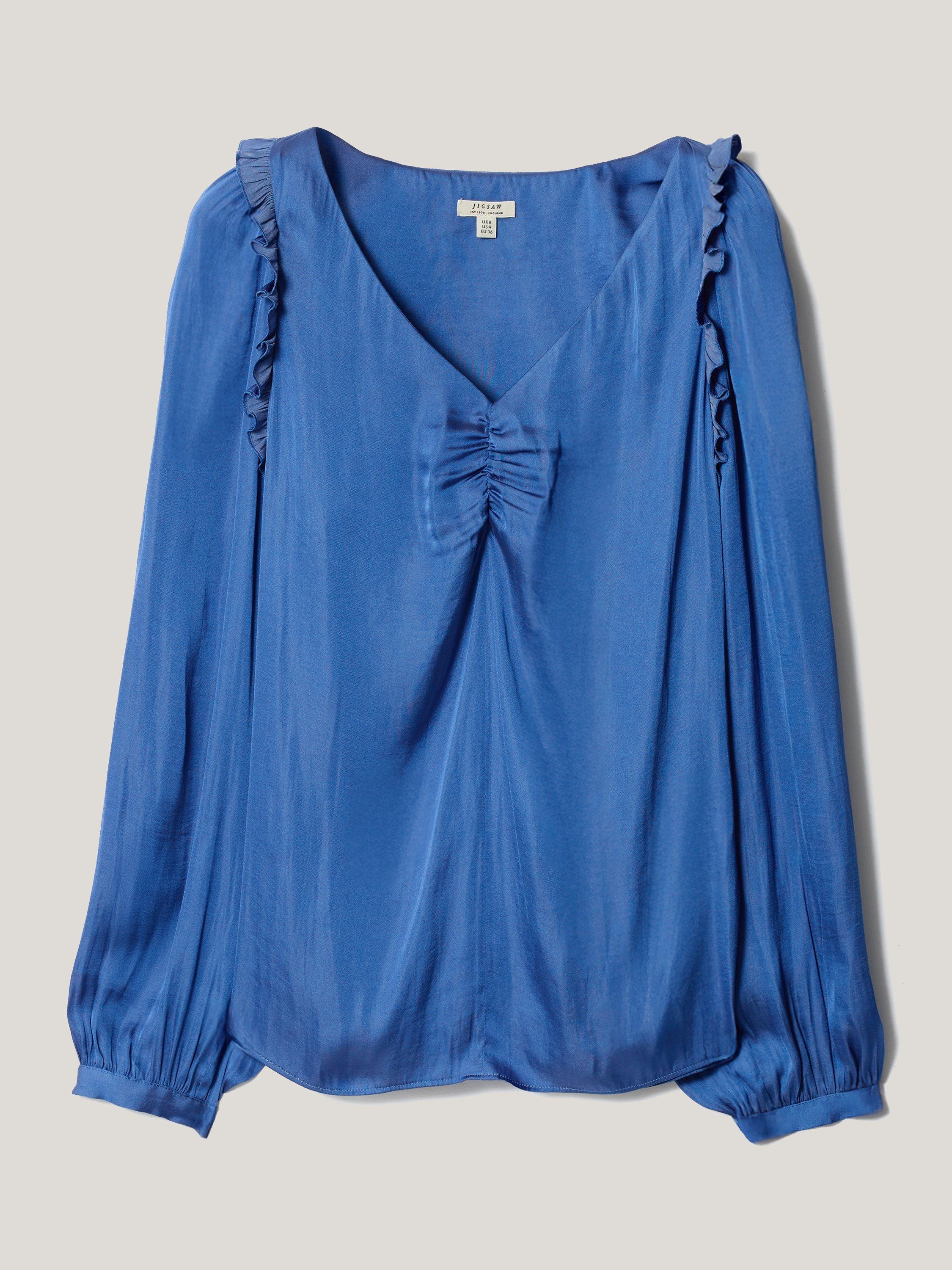 Crafted from satin, this frill top is a lesson in smart-casual dressing. The satin cloth has a smooth handfeel and beautiful drape, making it ideal for tucking in or wearing out. Featuring frill detailing on the shoulders that adds dimension, pair with tailored trousers or jeans depending on the occasion.