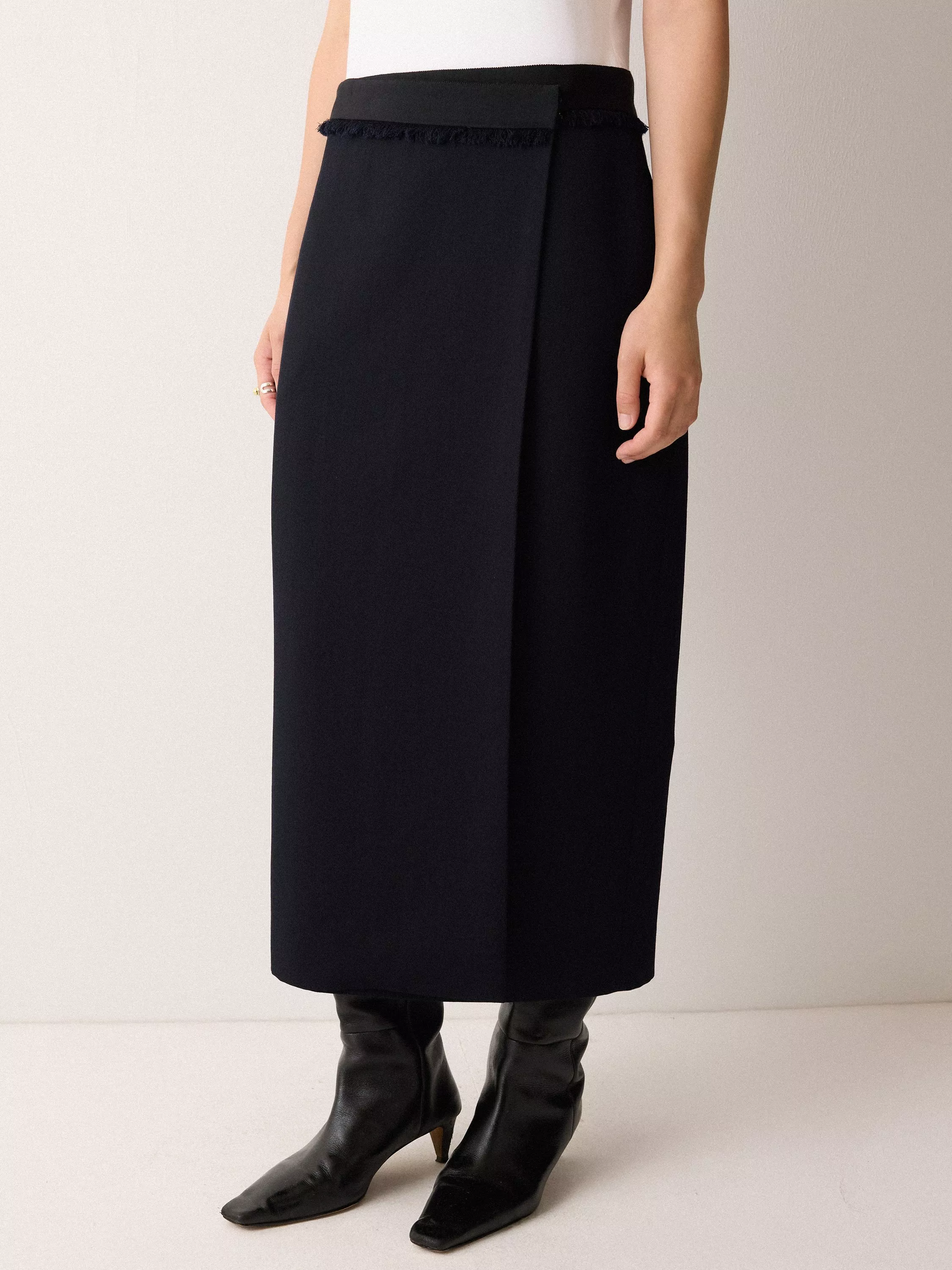 This midi skirt is crafted from lustrous wool blend fabric making it perfect for day to night time dressing. The wrap front is complemented by a grosgrain trim, which brings a layer of texture to its otherwise sleek silhouette.