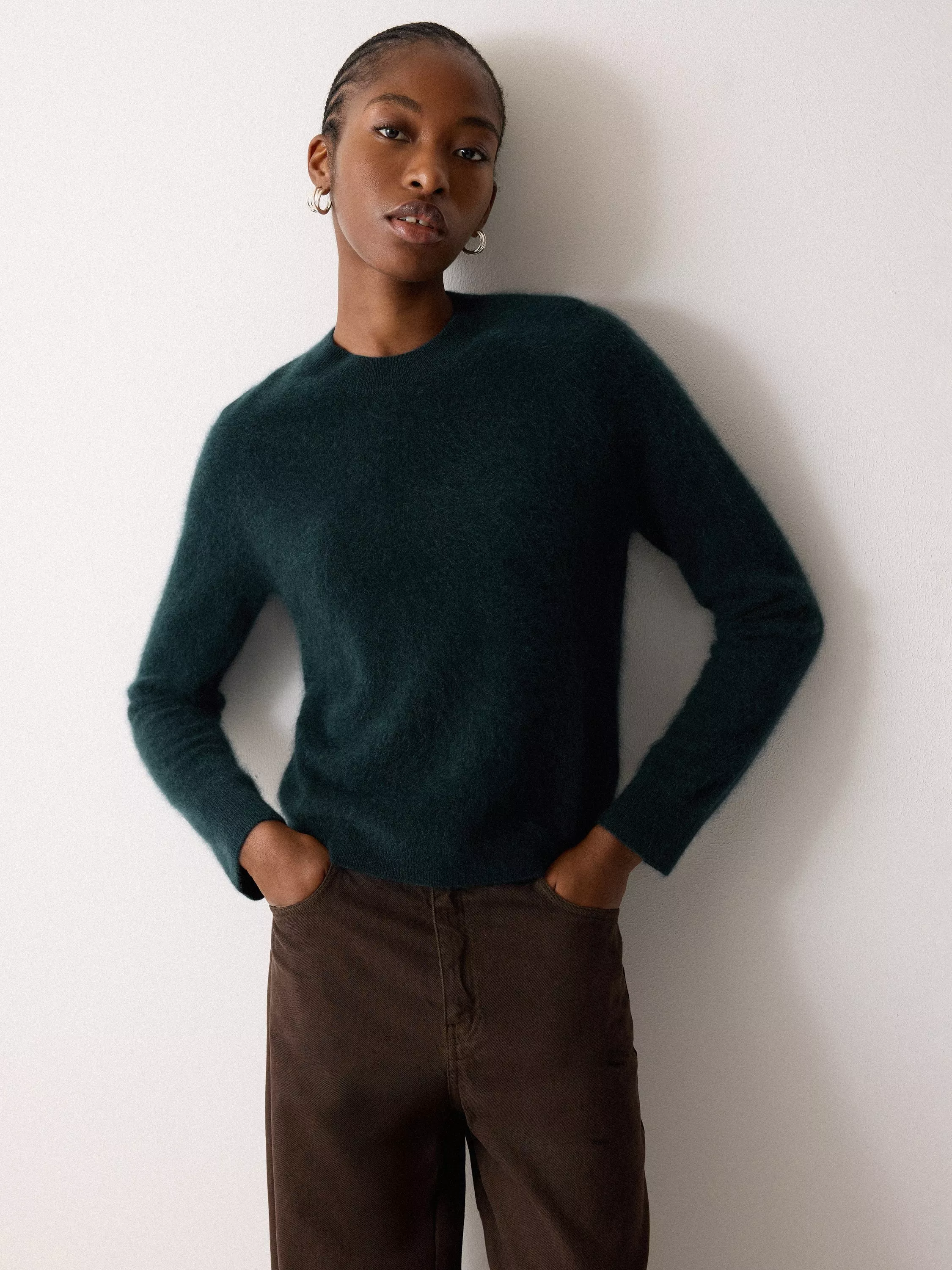 The Halo cashmere jumper has a supersoft, fluffy texture, created through a special wash. Jigsaw named this beautiful finish Halo because it has a heavenly aura, and you feel like you’re sinking into a cloud. Raglan sleeves offer more freedom for movement, making it a comfy knit for wearing day-to-day. The most cherished cashmere of all.