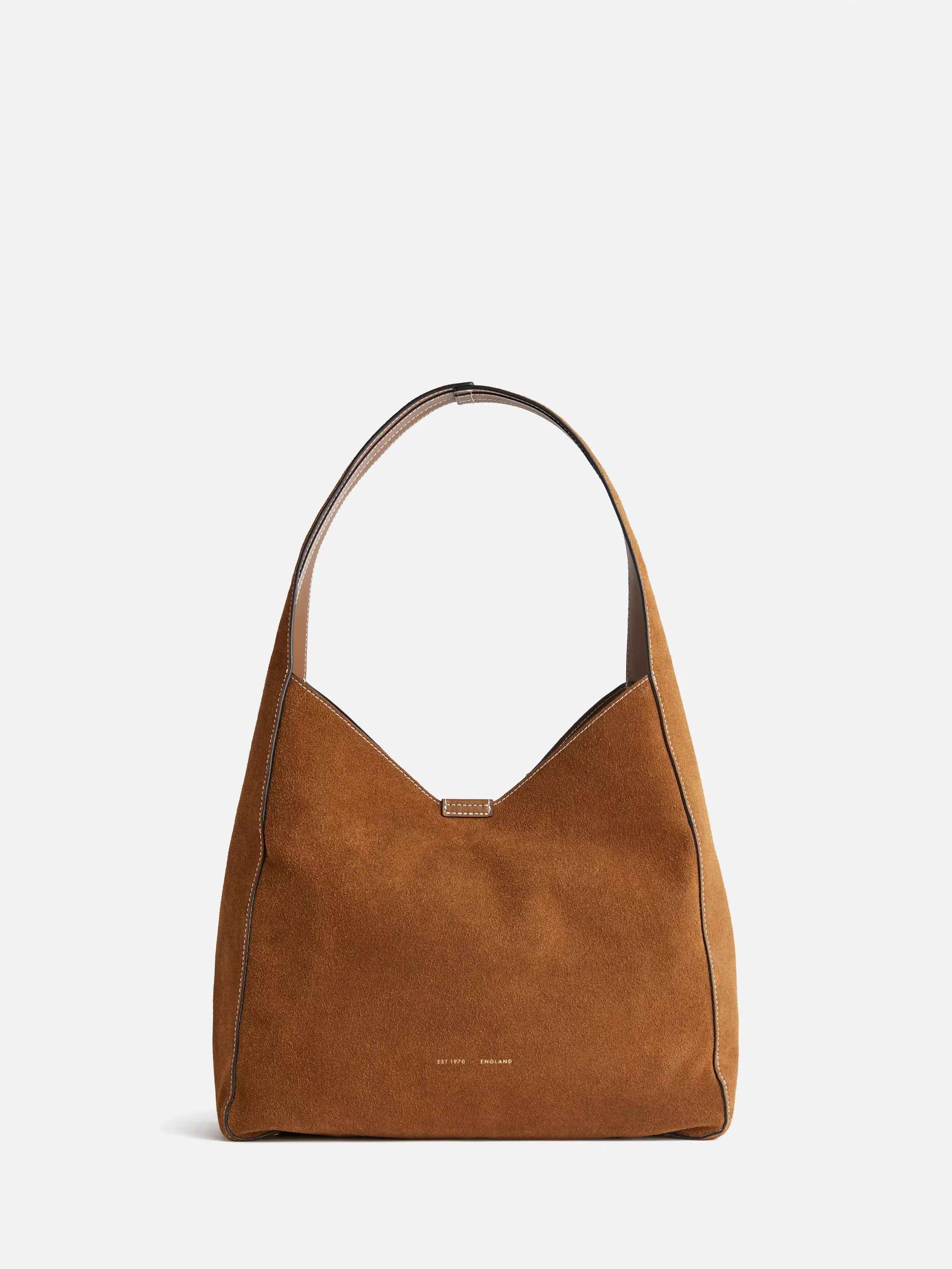 A soft slouch bag made from suede leather with a full cotton fabric lining. This roomy style has a magnet closure, internal zipped back pocket and flat front facing pocket for easy access. Metal feet on the base to prevent the suede from getting dirty.